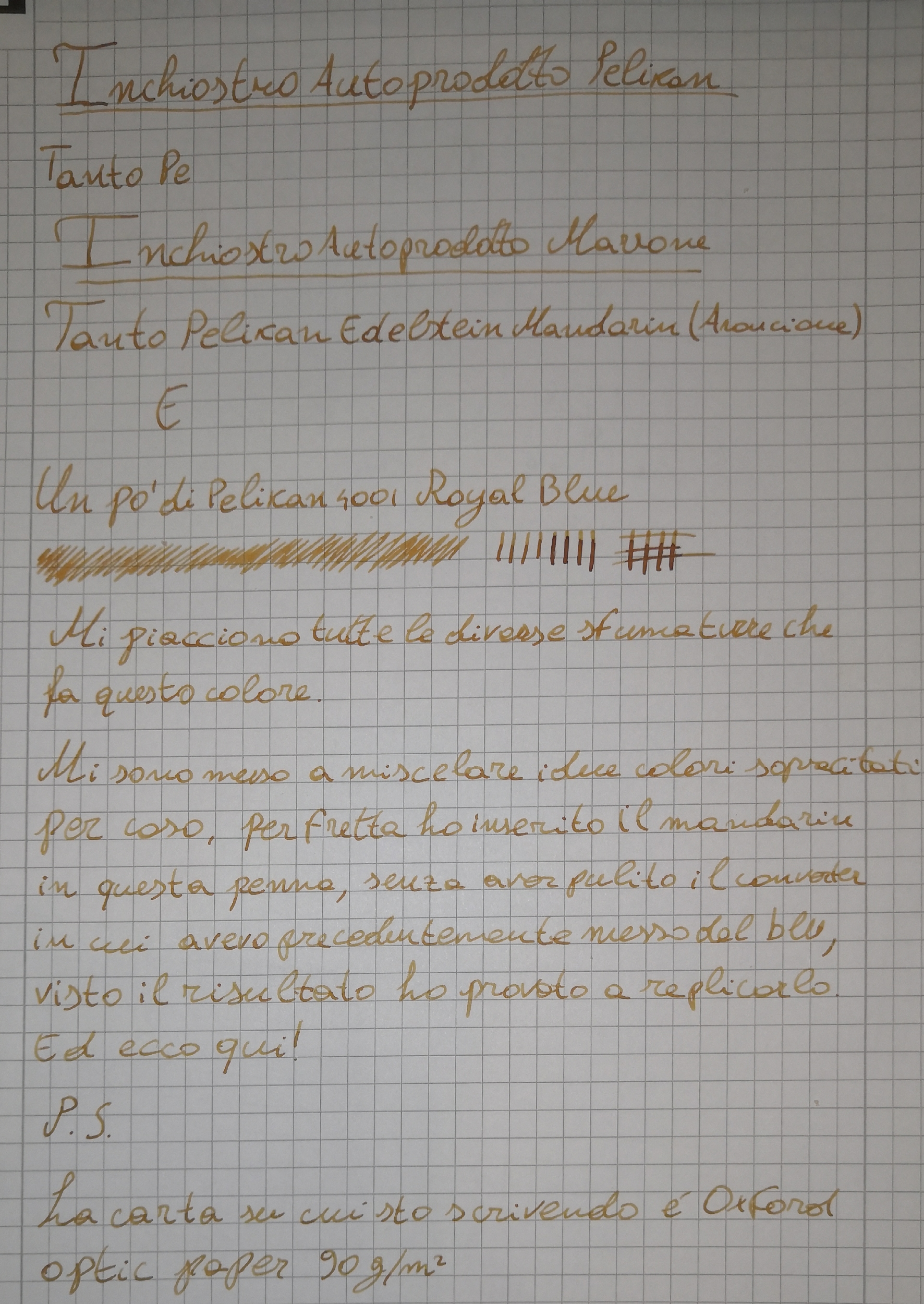 Per caso ho miscelato il Pelikan Edelstein mandarin e il Pelikan 4001 royal blue ed il risultato mi è piaciuto fino a volerlo replicare e modificare un pochino, questo è il risultato.
