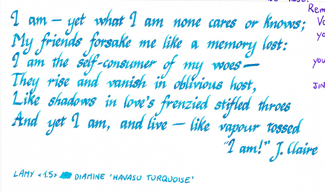 In queste settimane burrascose, la calligrafia mi sta aiutando giorno dopo giorno quando ho bisogno di fare una pausa e riassettare i pensieri. Diamine Havasu Turquoise su carta mai sentita prima: GM90. Diamine Havasu Turquoise Rebucci Autunno.jpg Diamine Shimmertastic Shimmering Seas (che fa i capr...