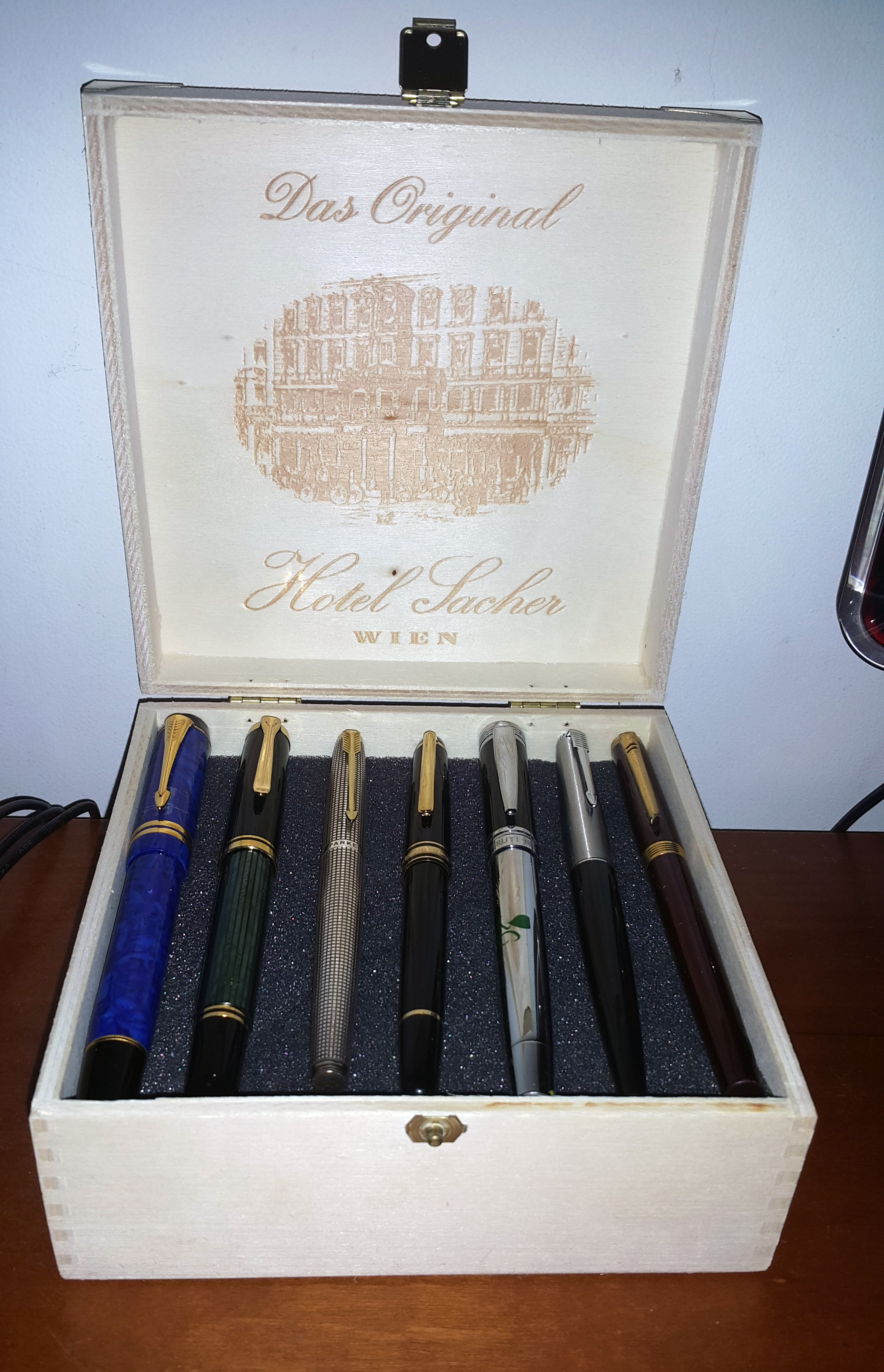 Ho in tutto nove penne, ma di solito uso le sei. Tengo le sei cariche, con diversi inchiostri. Nella mia M805 c'e il platinum blu/black, nella M600 c'e il Diamine Majestic blue, Parker Duofold e Parker 75 hanno delle cartucce Quink blue, cartuccia nera per la Montblack Meisterstuck classique ed anch...
