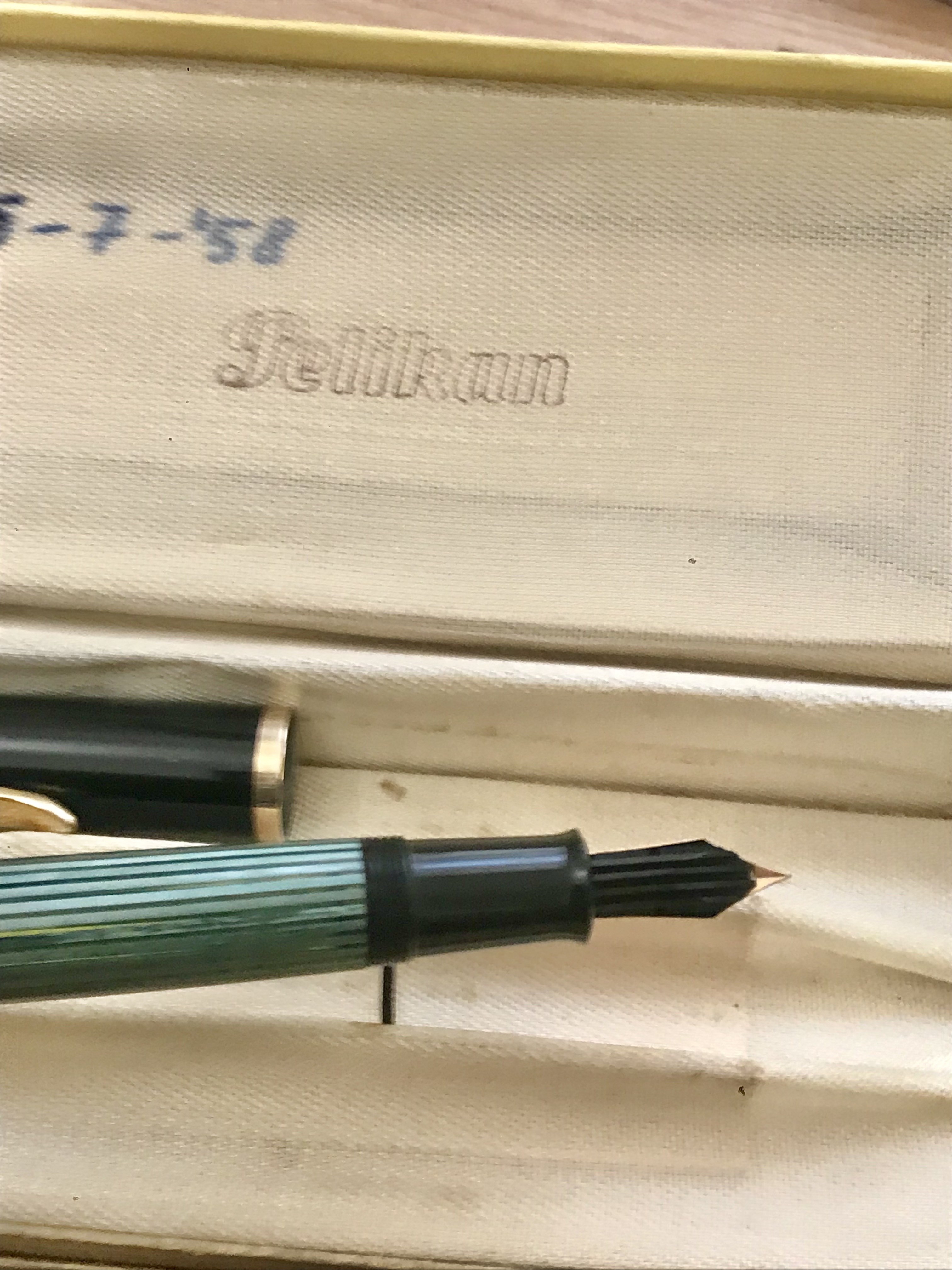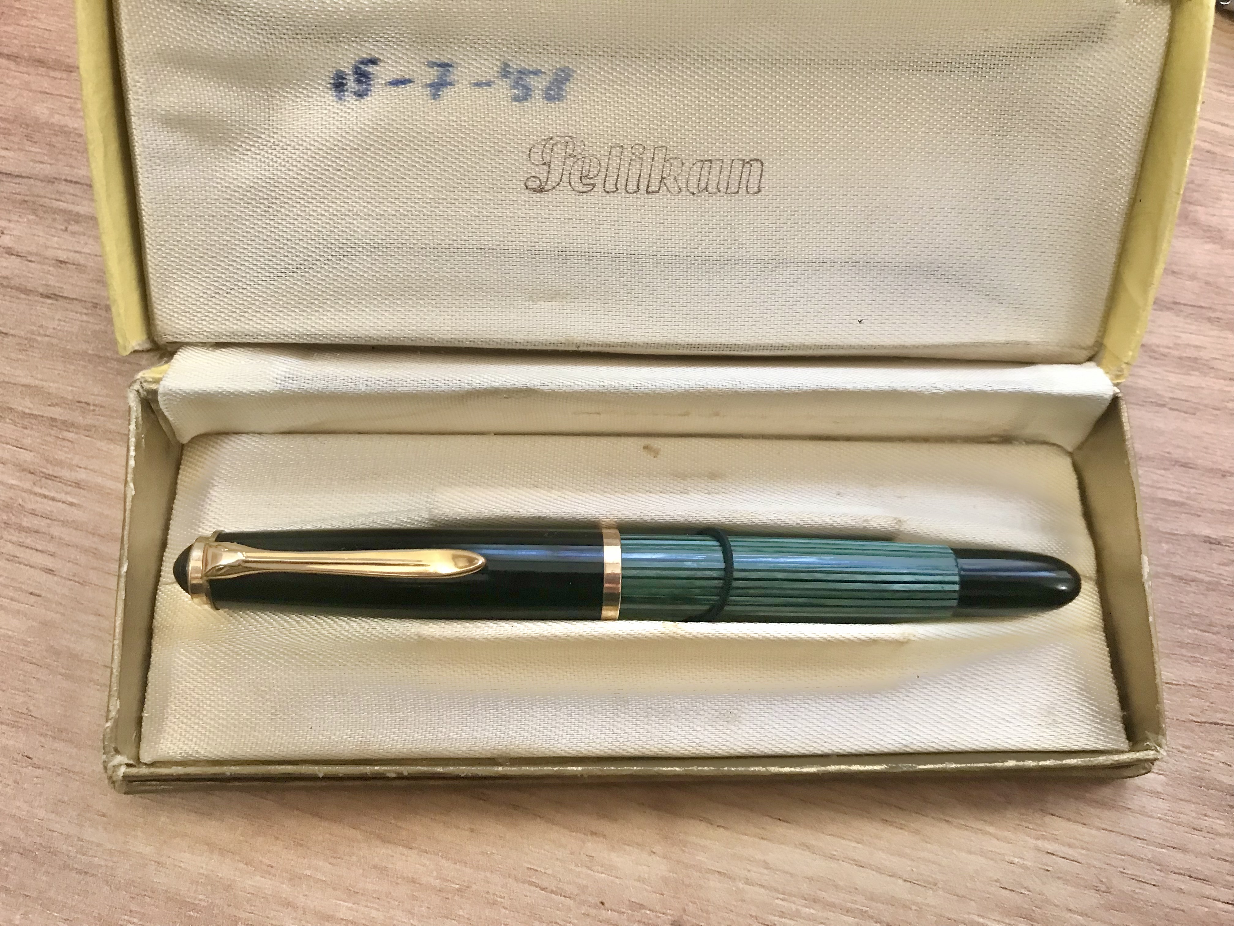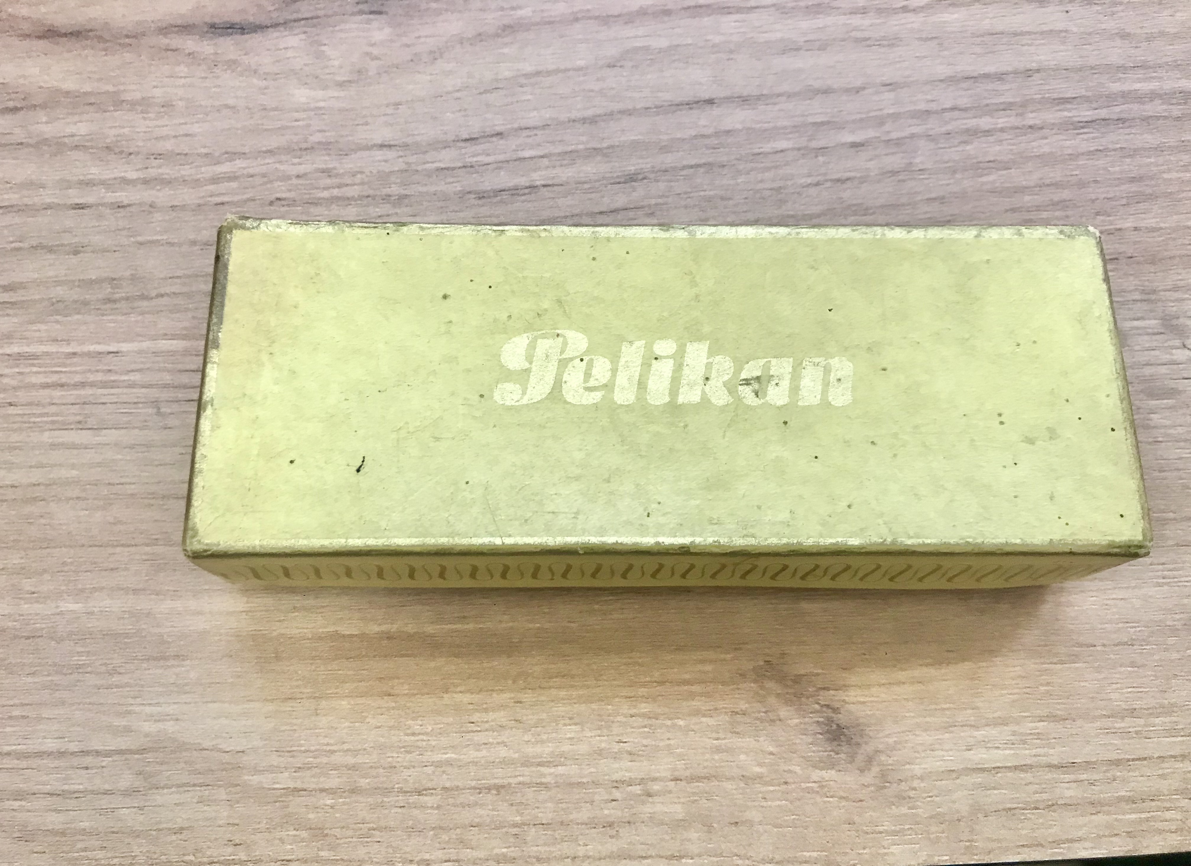 Pelikan 400 nn nella sua classica colorazione con astuccio di cartone dell'epoca dove viene descritto il modello, il colore e il pennino.