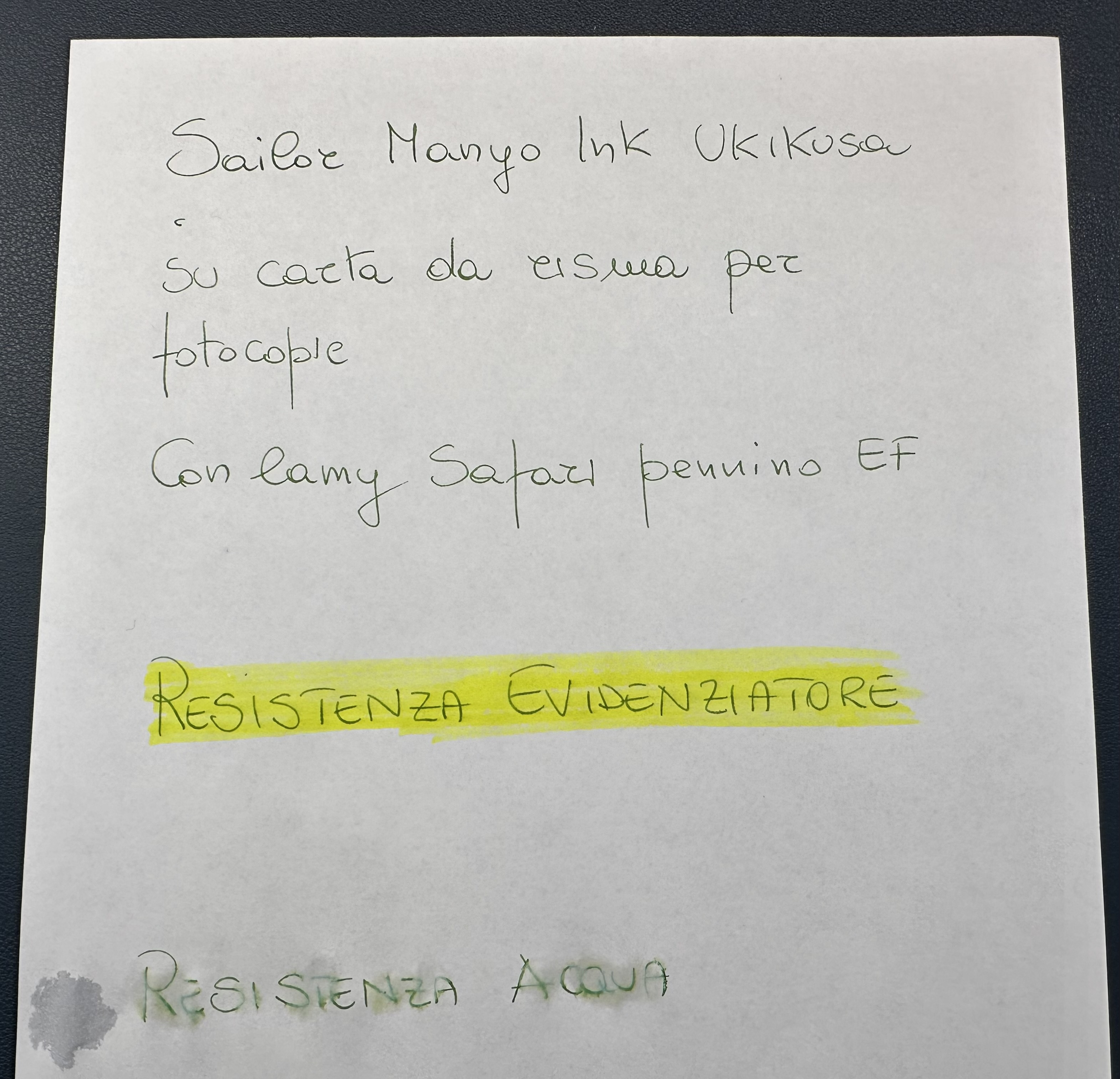 Buongiorno, uso da pochissimo le stilografiche. Provo a dare il mio supporto ben conscio di essere di poco aiuto. Tra i miei inchiostri c'è il Sailor Manyo Ukikusa. Ecco una prova, sicuramente fatta male (ho fatto piovere sul foglio :roll: ) IMG_5063.jpeg Anche il Sailor non pare male, si dovrebbe ...