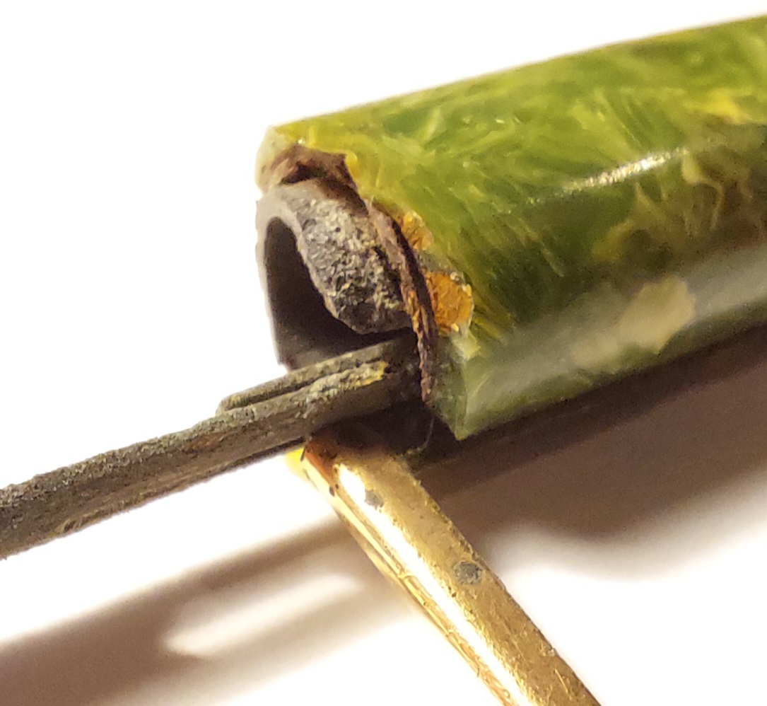 Mi pare che hai ragione. Sad Pandami pare di vedere della ruggine che ha intaccato la celluloide. Magari l'anellino della levetta?