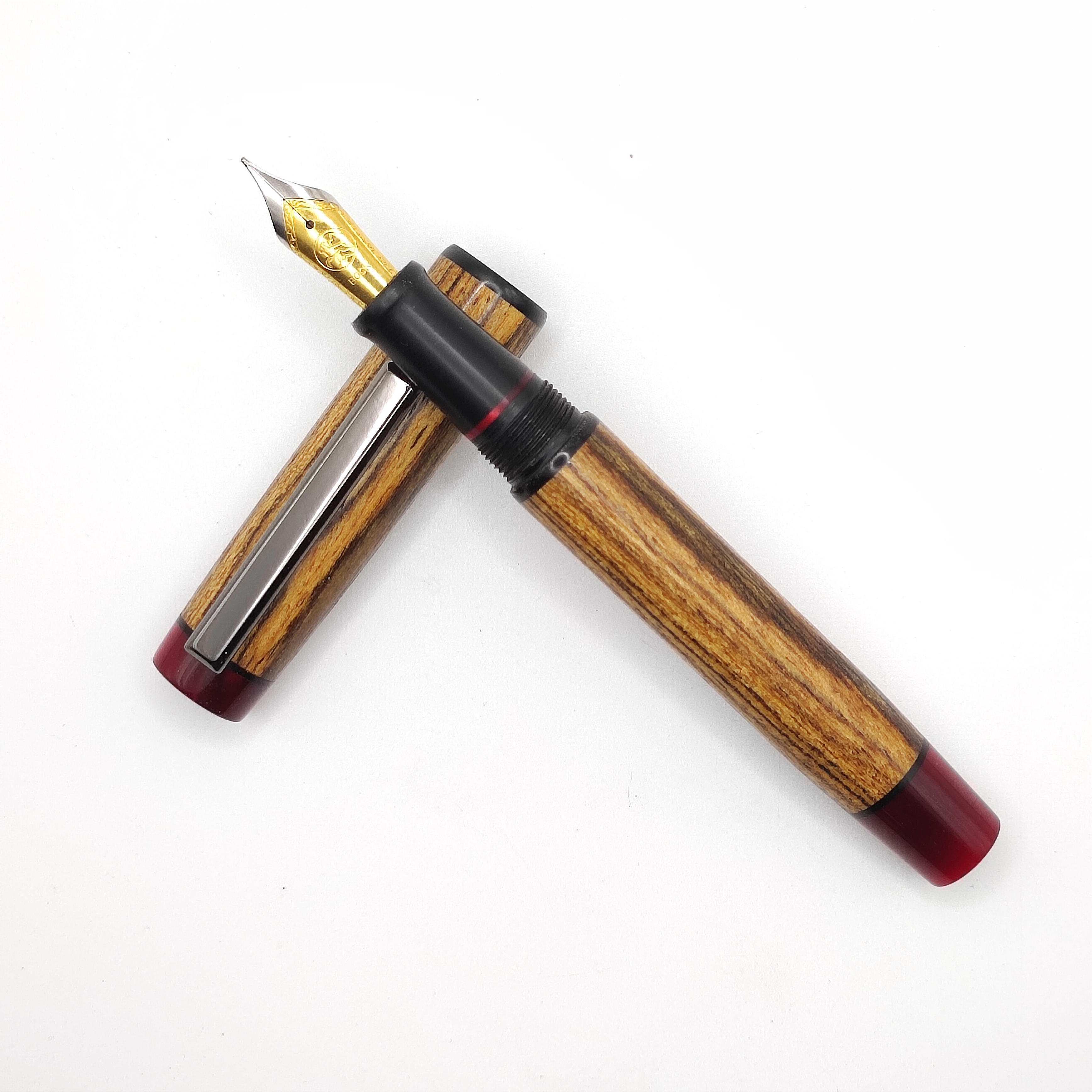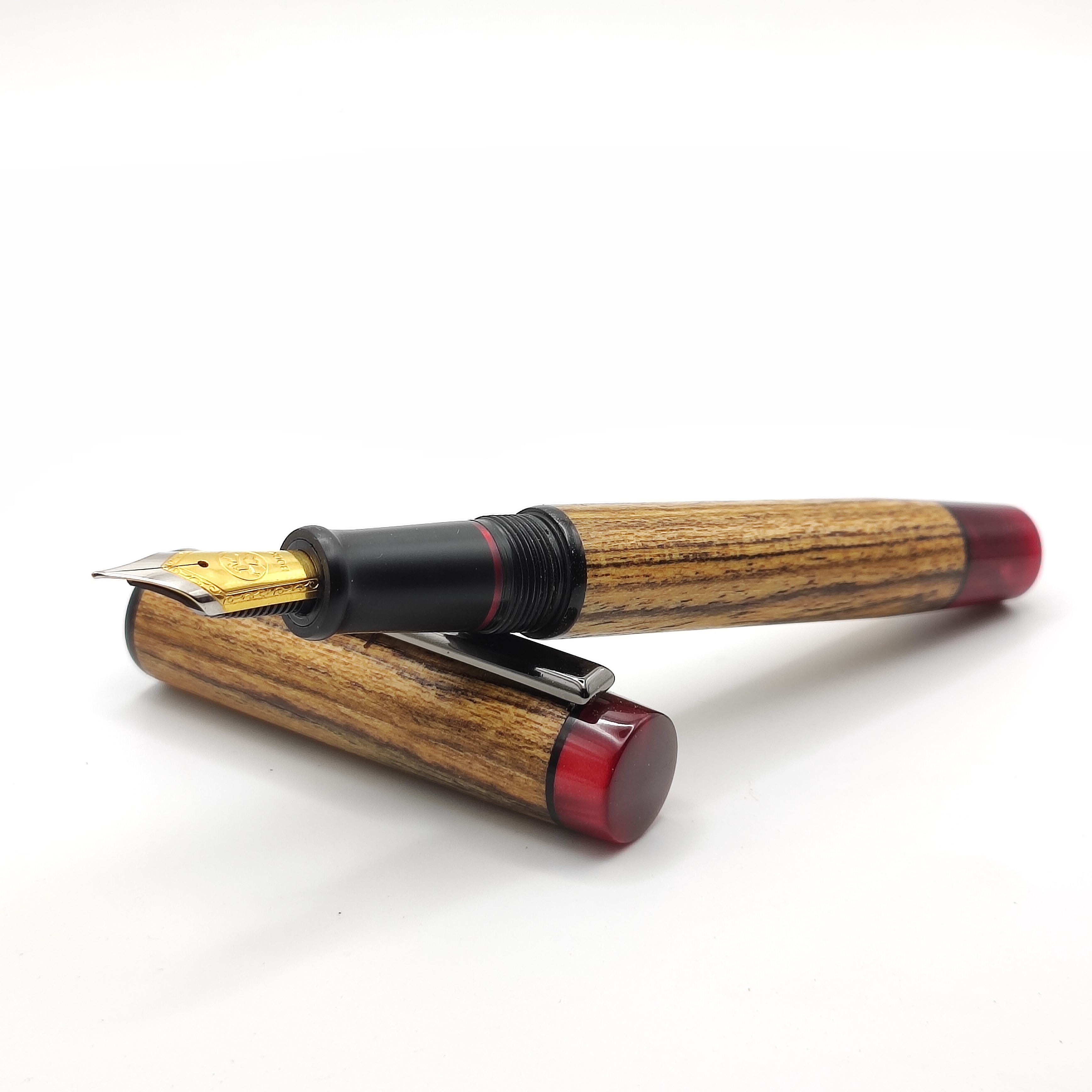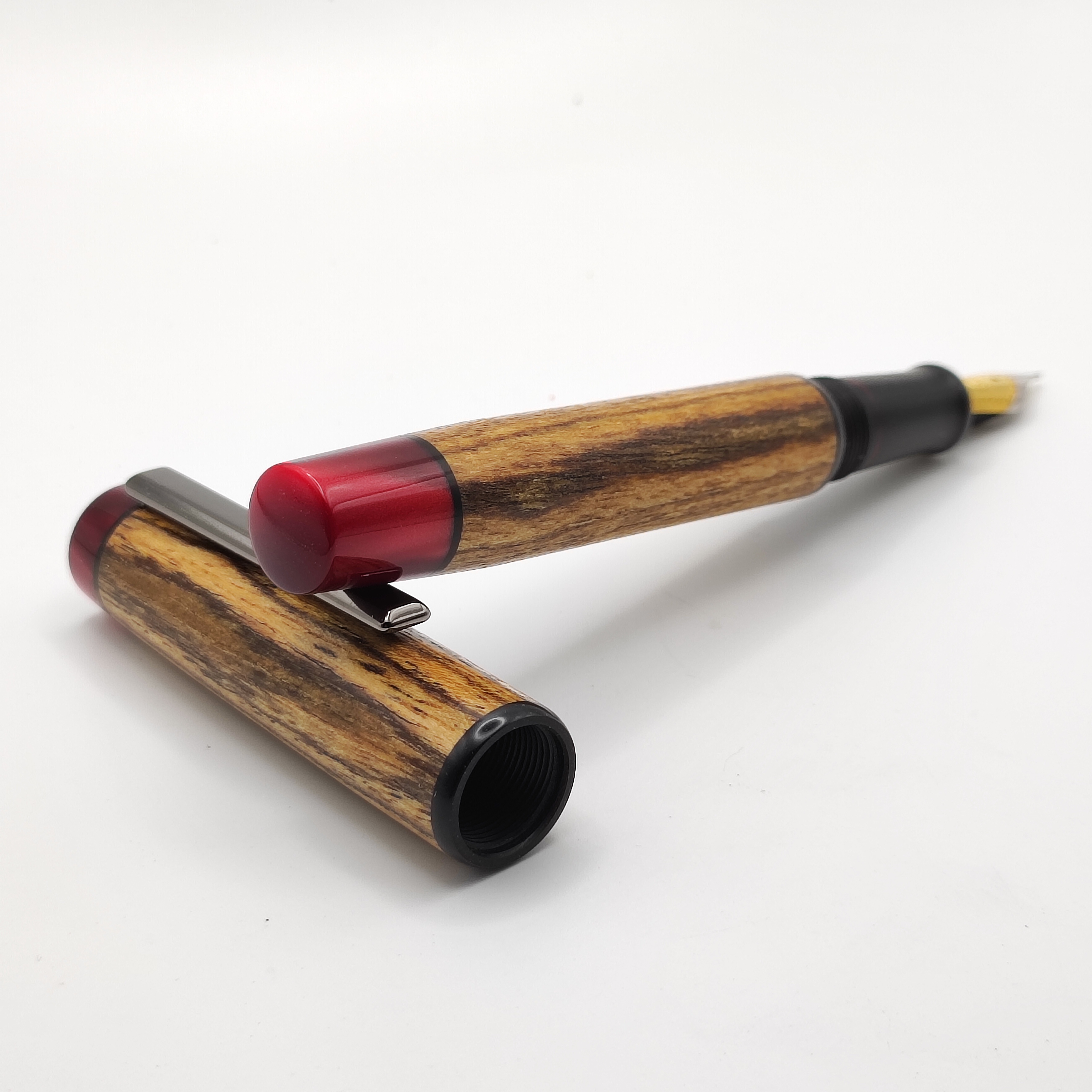 Questa è l'ultima appena uscita dal tornio: stilografica in legno di bocote con terminali in acrilico rosso perlaceo e sezione in ebanite. Con converter e pennino Bock no.6.