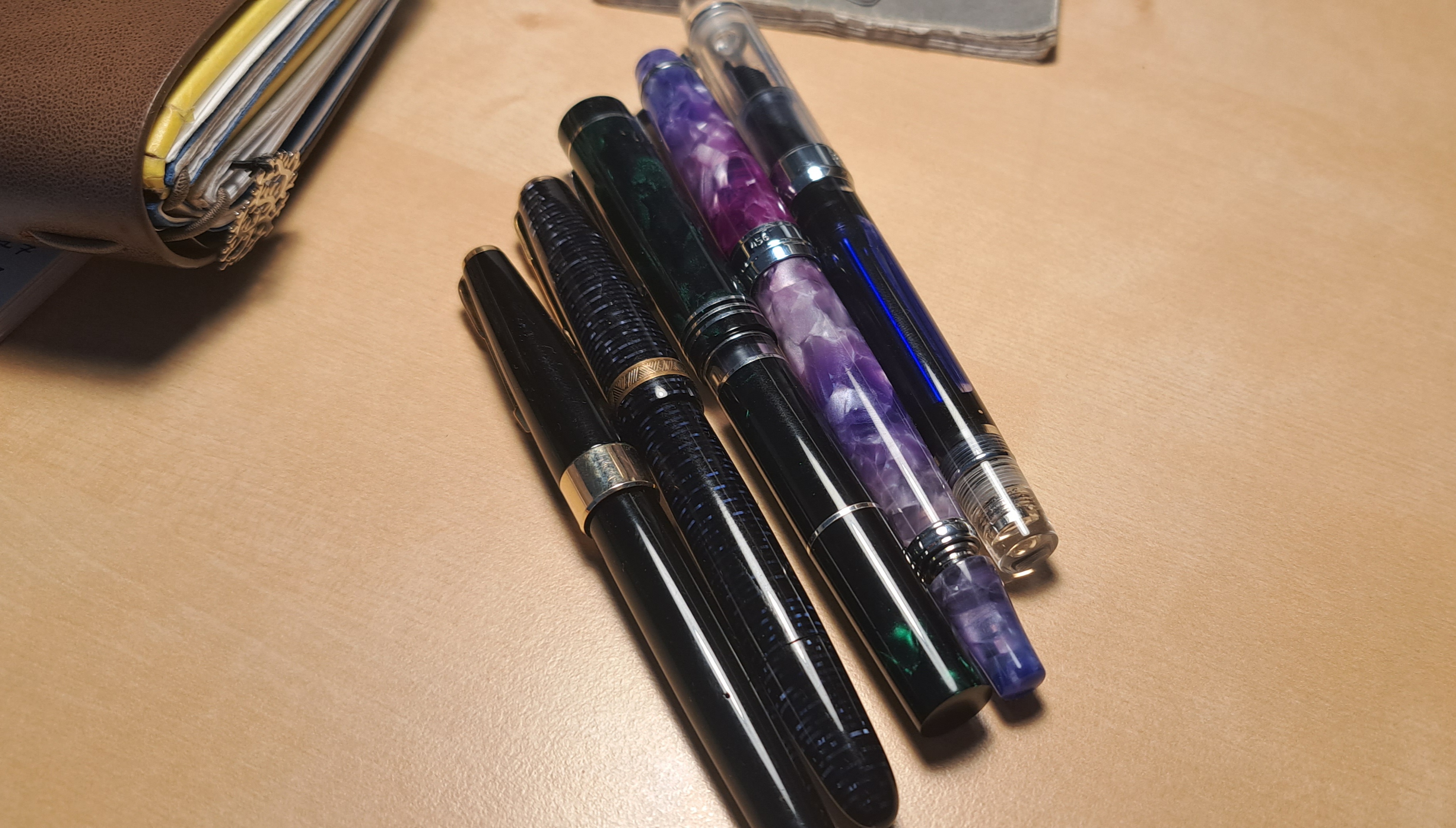 Senza farmi intimorire dalla tremenda illuminazione e da uno sfondo che incute ansia (o, nei cuori dei masochisti come il sottoscritto, una strana sfumatura di gioia), vi mostro le penne attualmente inchiostrate! 20250125_230239.jpg Da sinistra, nell'ordine - Fp.it 霊気 #089 (extrafine) - Parker Duofo...