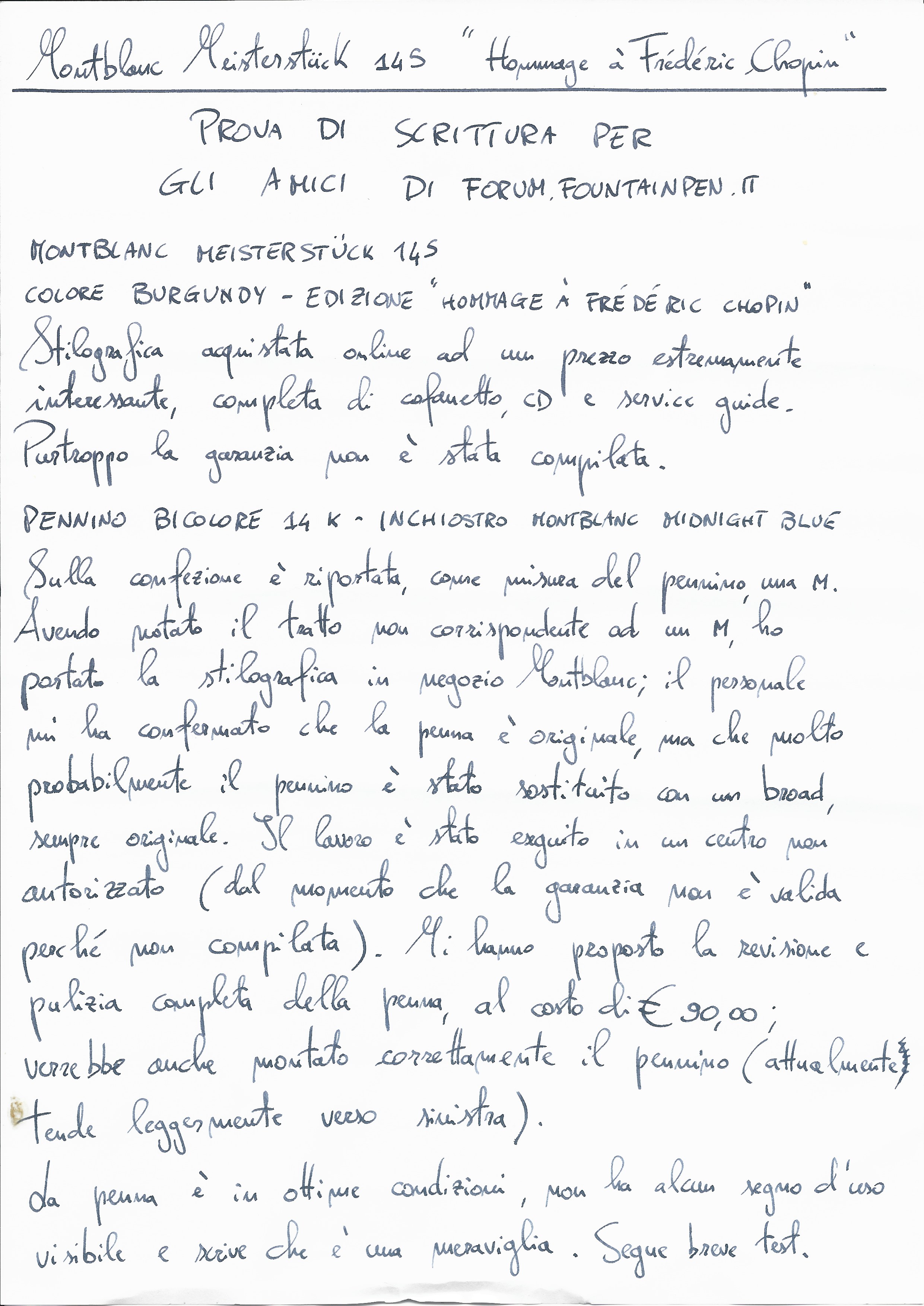 Di nuovo un saluto a tutti! Come scrivevo nel mio vecchio post di presentazione (poco fa ripreso), è arrivata in casa una nuova penna. Si tratta di Montblanc 145, anche conosciuta come "Hommage à Frédéric Chopin". È stata acquistata usata (ma sembrerebbe veramente poco usata) online dalla ...