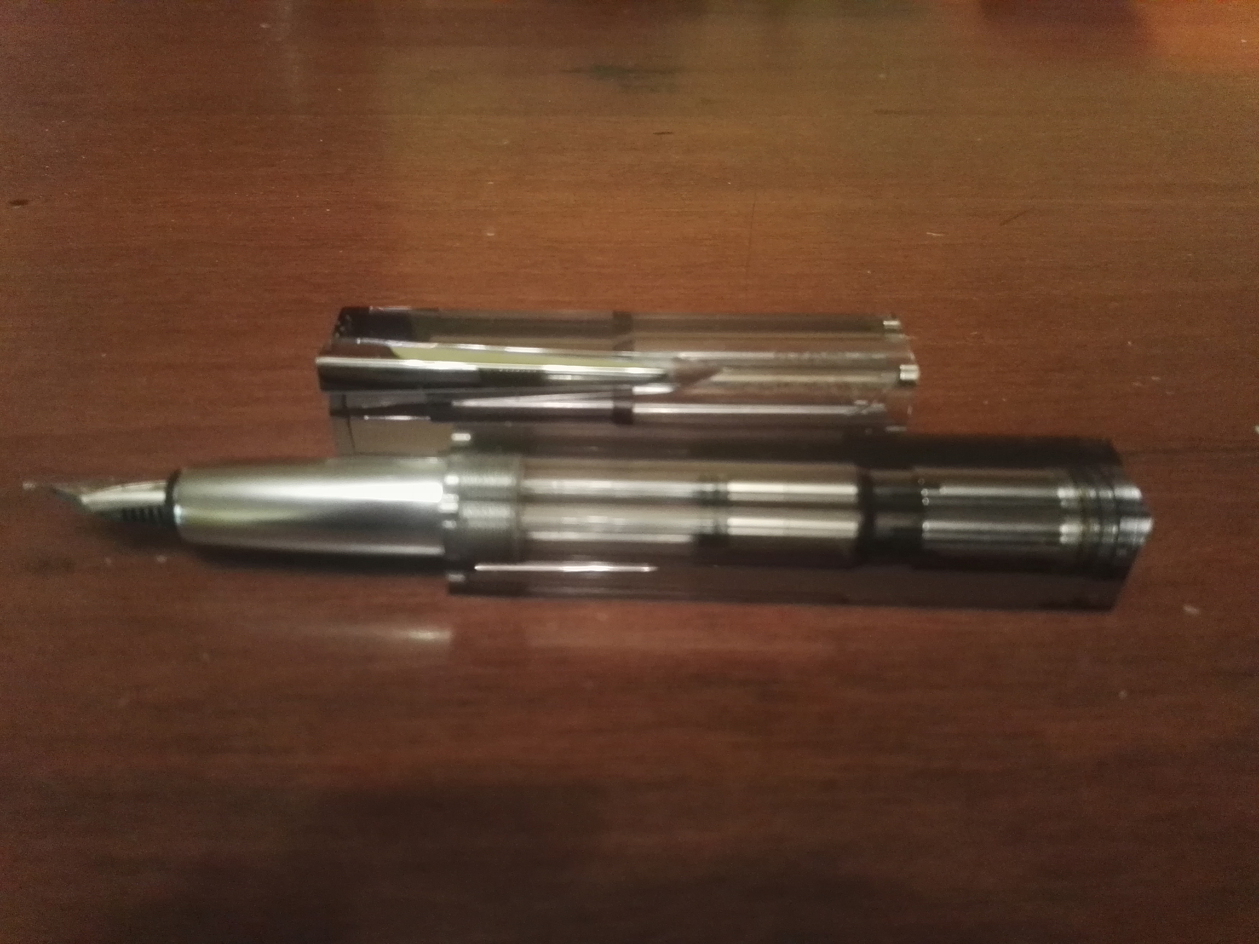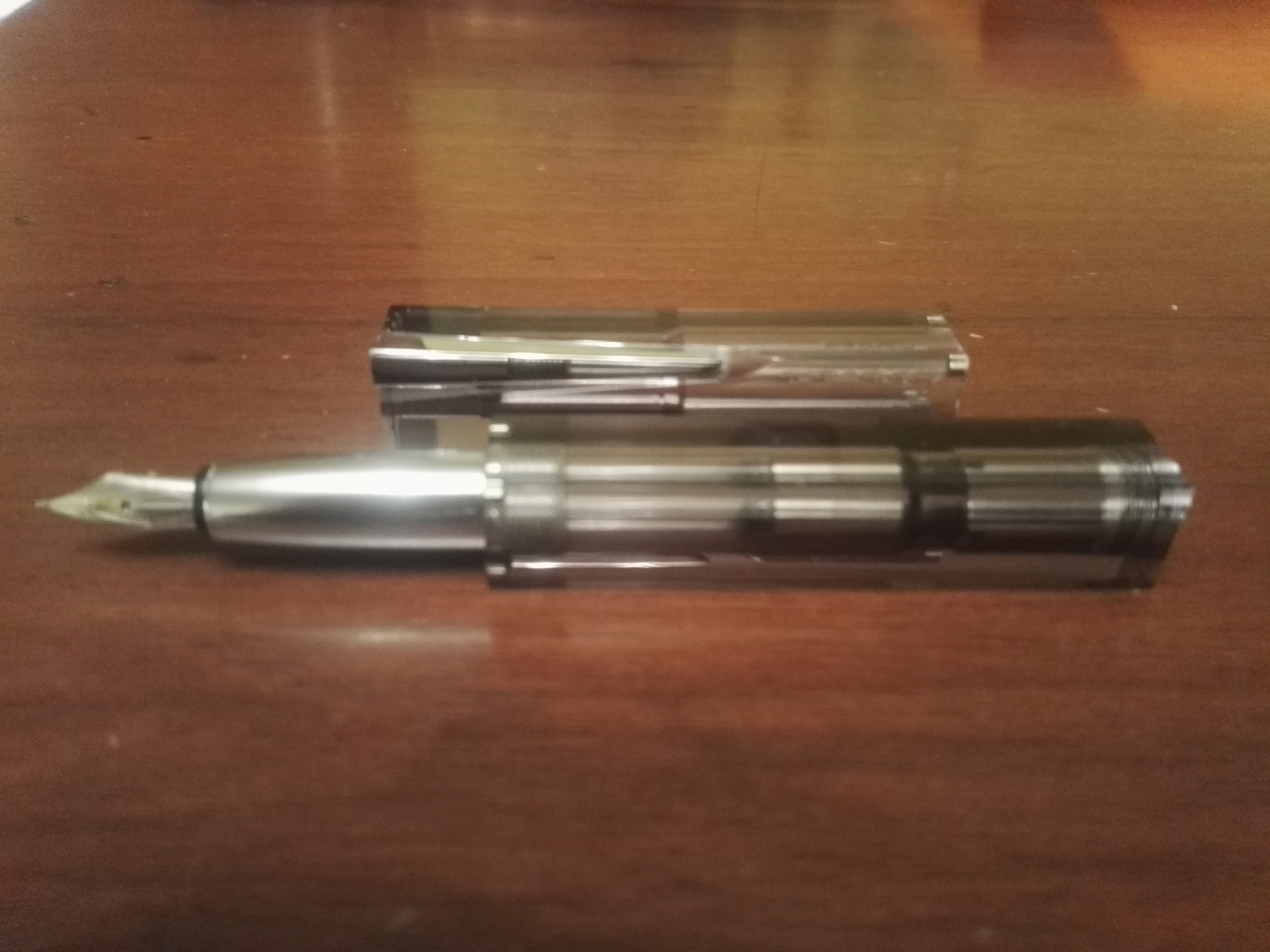 A dispetto delle apparenze e delle dimensioni, si impugna bene: basta farlo un po' in altro, in modo da sfiorare con le dita la parte squadrata e lasciare che la penna cada nell'incavo fra il pollice e l'indice: a questo punto il pennino è orientato correttamente per la scrittura e la penna si controlla molto bene (provata solo "a secco", al momento non ho intenzione di inchiostrarla).