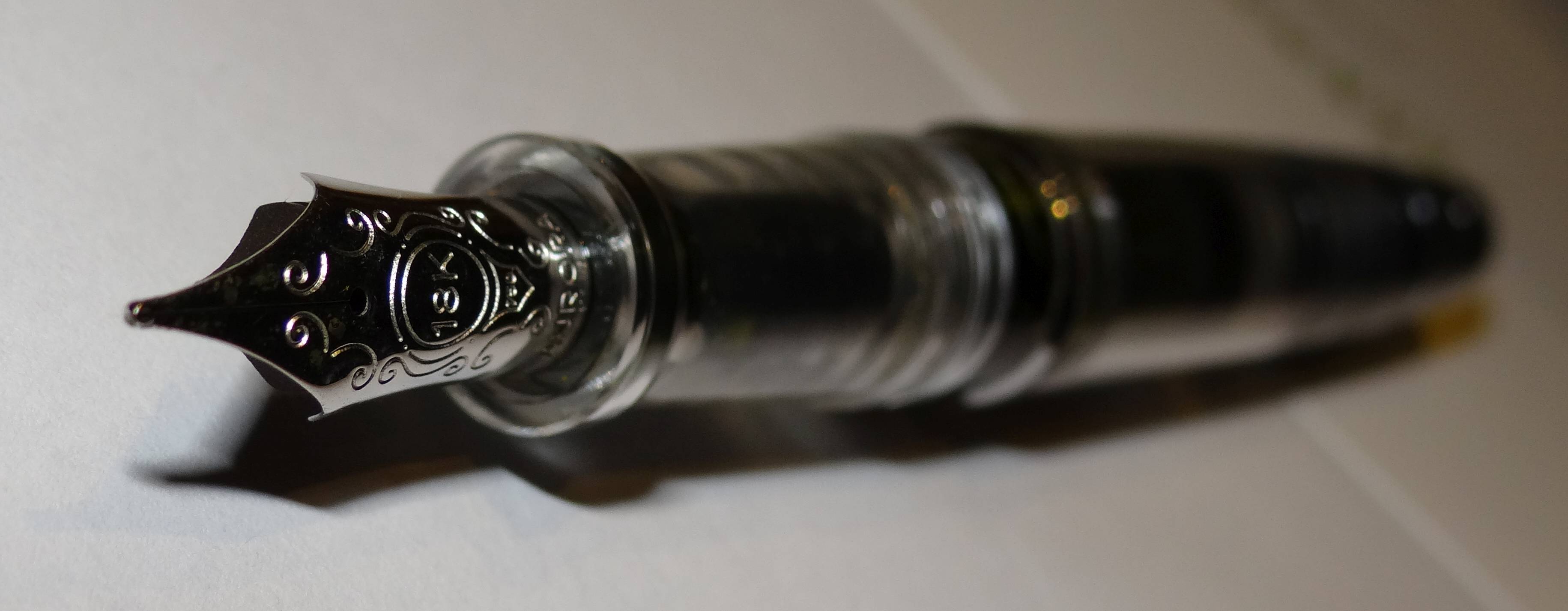 Il Pennino è un'Aurora in oro a 14K, di misura F, scritta riportata sull'alimentatore, molto scorrevole e morbido, il flusso è regolare, né troppo magro né troppo abbondante, dal tratto leggermente variabile, la trovo molto comoda da utilizzare, il peso è ben bilanciato se la si usa senza il cappuccio, poiché calzando il cappuccio, più pesante della penna stessa, sposta molto indietro il baricentro, non necessita di pressioni per scrivere, la penna scrive col suo stesso peso, basta solo "guidarla" e il resto lo fa da sola.