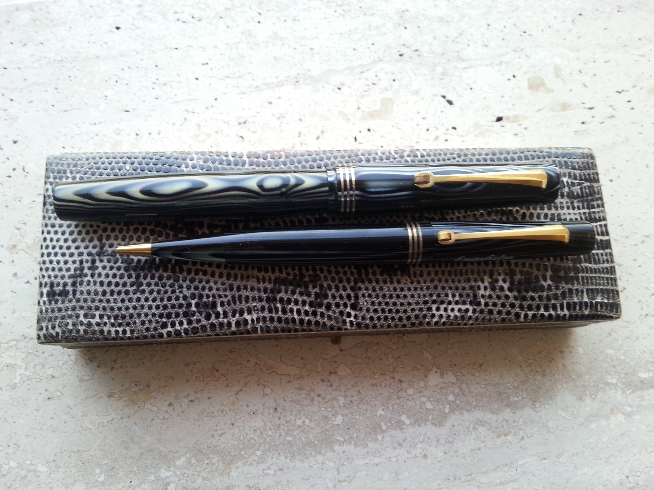 Si spesso capita anche a mè di trovare riviste d'epoca dove ci sono pubblicità di penne. I fogli dove sono poggiate la stilo e la matita sono presi proprio da una rivista degli anni '50, francese, che sul retro riporta una pubblicità della parker 51. In verità non sempre risulta facile trovare queste pubblicità di penne. Tempo fà mi ero fissato nel riuscire a trovare la pubblicità dell'Asterope (di cui sono felice possessore) così sfogliavo nervosamente tutte le riviste de "Le Vie d'Italia" degli anni '30 che trovavo nella speranza di scovare dentro il pieghevole originale. Poi ho abbandonato anche perchè non sono sicuro che il famoso pieghevole della penna fosse inserito in un numero della rivista come mi era stato detto. Mi sono accontetato della scansione. Al momento stò facendo altri lavori ma appena posso cercherò di smontare la matita e fare la doratura per completare il set.