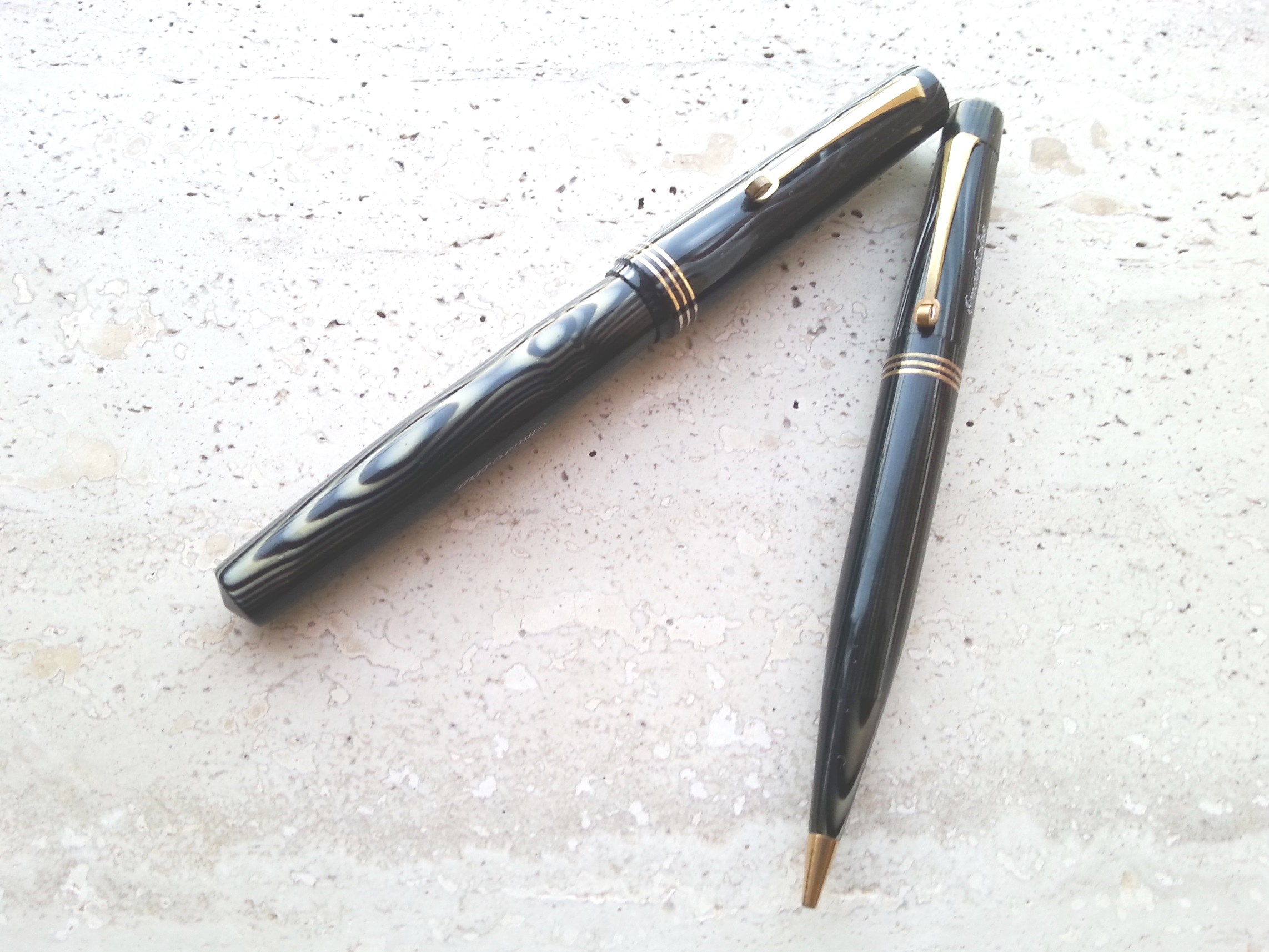 Mi è capitato di prendere, veramente per due soldi, questa bella Omas arco color grigio nero. Tempo fà avevo invece trovato la matita, dello stesso colore, ma con le finiture rodiate. Mi sà che metterò in pratica il metodo casalingo della penna galvanica illustrato quà sul forum utilizzando il caricabatterie di un telefono dismesso per dorare le parte metalliche della matita e completare un bel set.