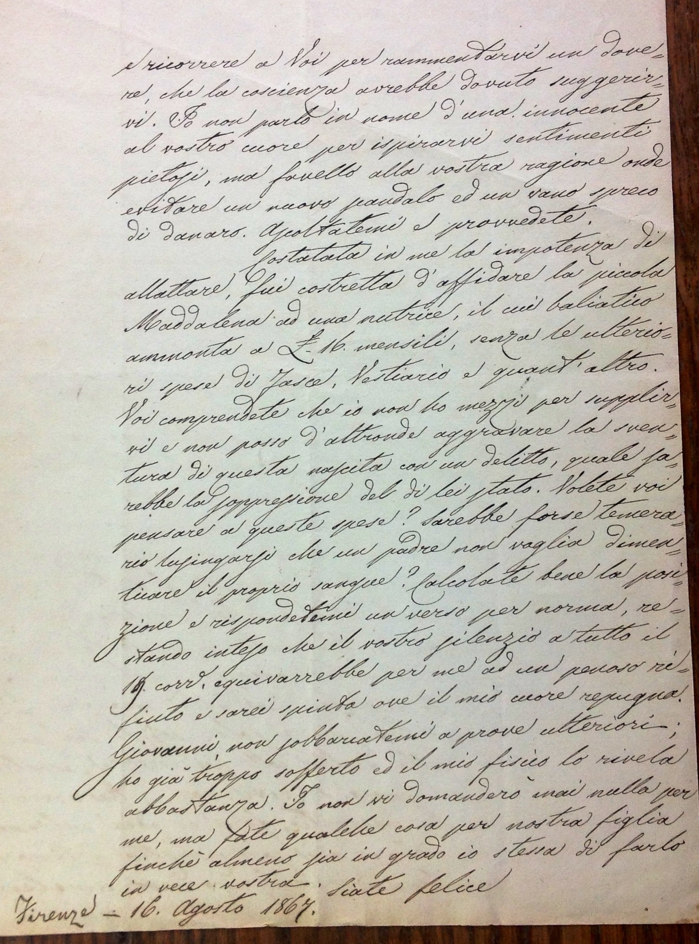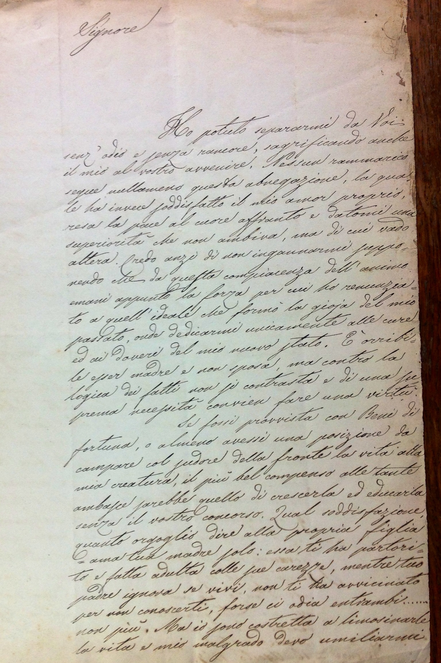 Hai ragione, a colpire di più non è certo la grafia, pur bella e leggibile, e nemmeno la sintassi deliziosamente ottocentesca o la trama ingiallita e affascinante della carta, ma il contenuto, quella supplica di una madre ferita ad un padre che ha deciso di non essere tale, perchè provveda almeno alle piccole spese per la figlia che forse non lo conoscerà mai...chissà com'è finita!