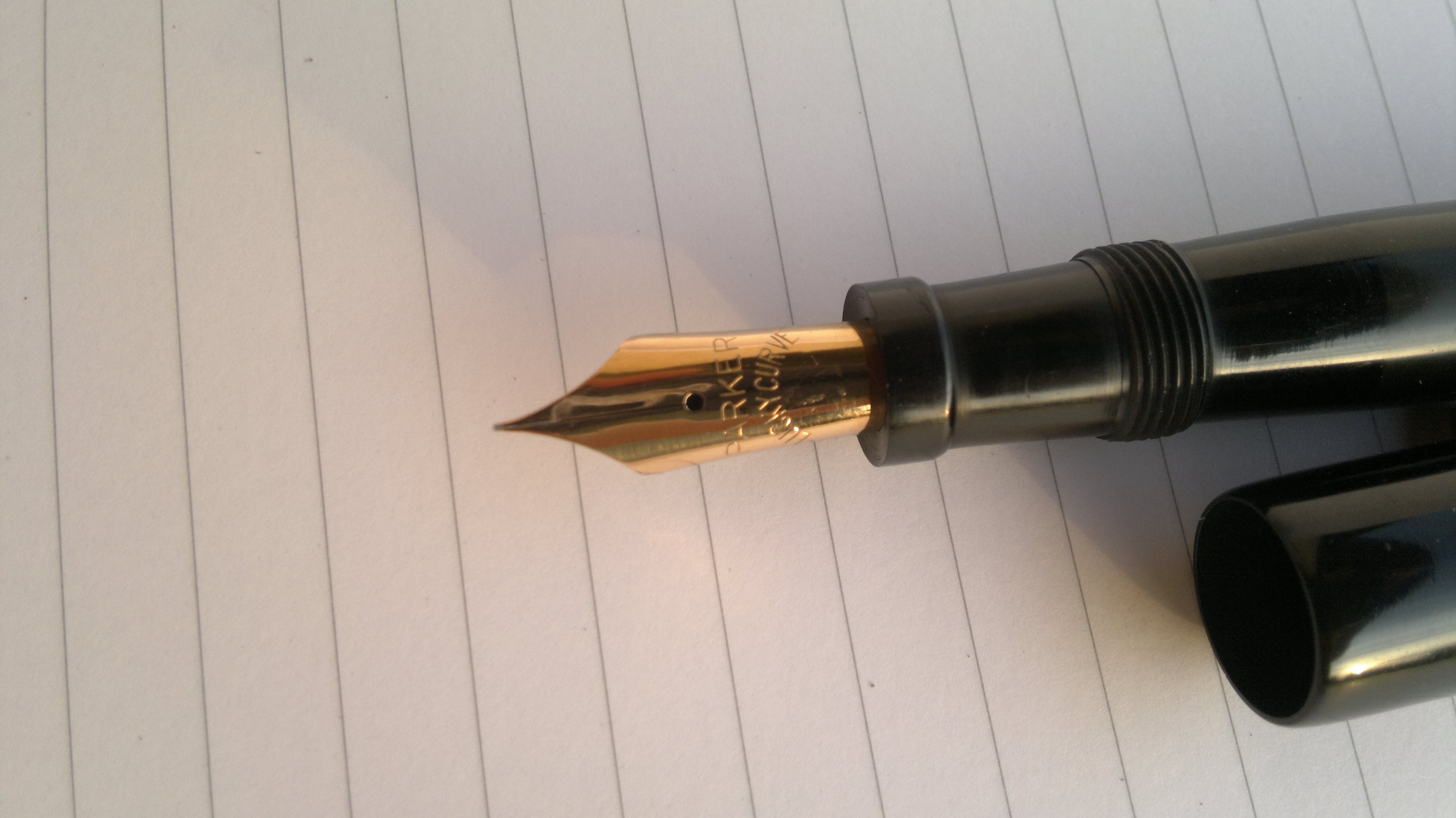 il pennino non corrisponde a quello dell'inserzione descritto "Original Parker Lucky Curve #5 - 14 karat- 585 gold nib, F grade" (prima foto), ma è un "normale" PARKER LUCKY CURVE rigido, un chiodo che oltretutto gratta (terza foto).