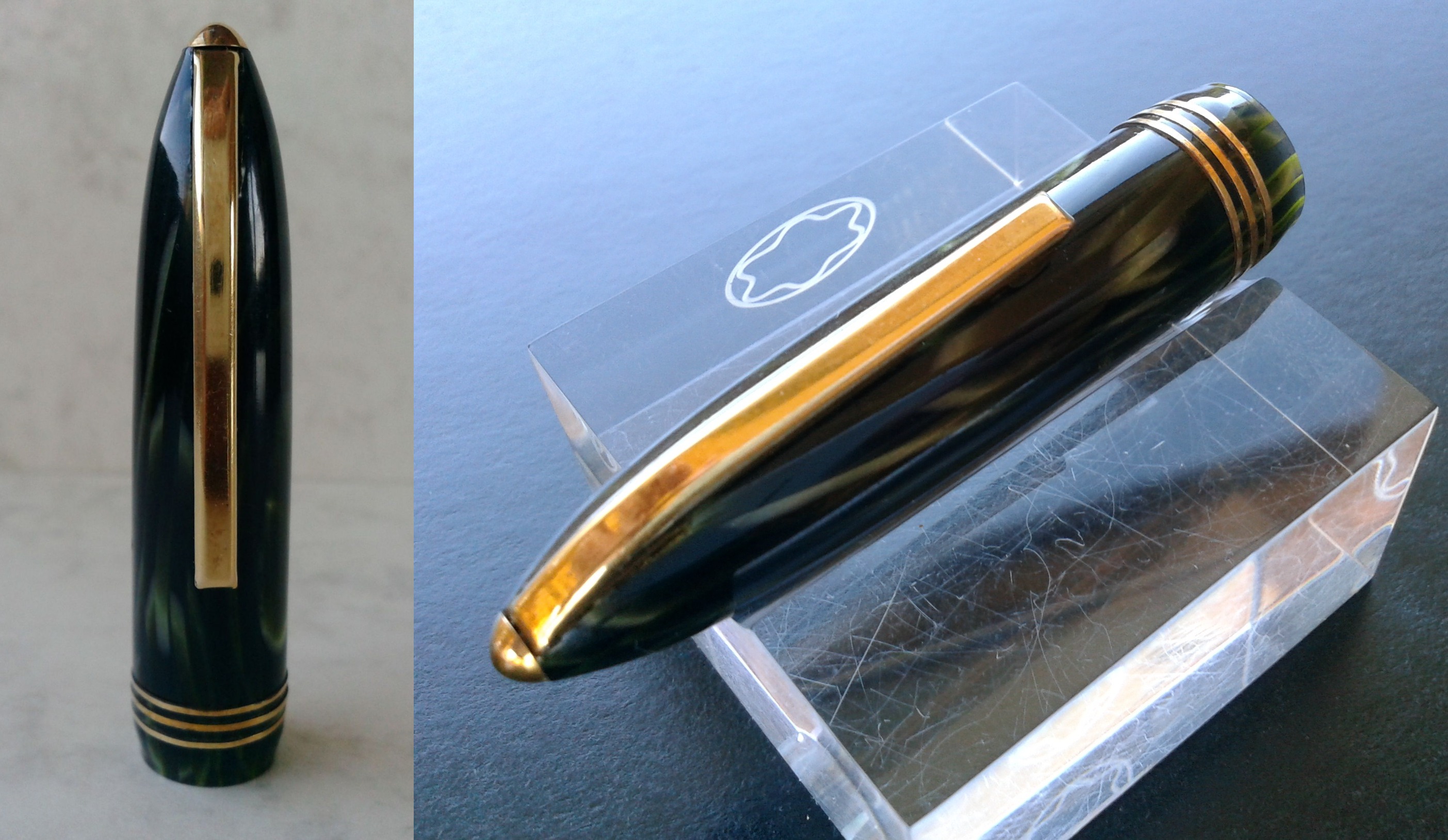 VERBANA EXTRA misura media in celluloide arco verde tornita da barra piena, minuterie metalliche placcate oro, pennino "Verbana Extra" in oro 14 carati, caricamento a pulsante di fondo, produzione Italia anni 1940.