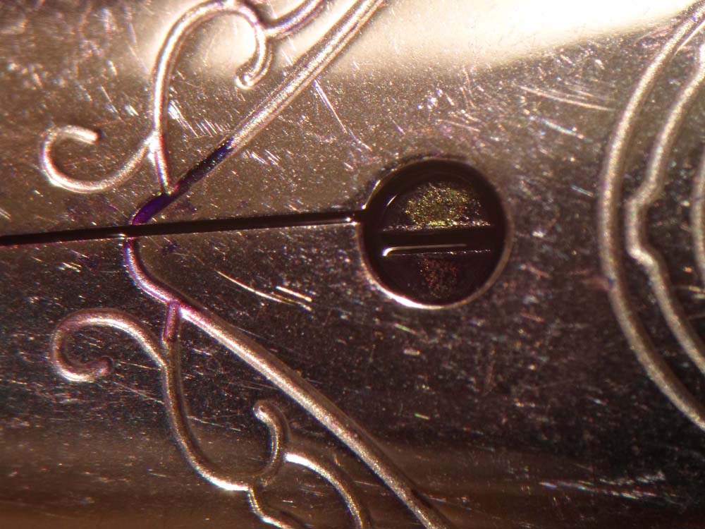 Per ora ho controllato solo con la lente 10x in mio possesso e non ho notato disallineamenti così marcati come sul tuo pennino. Se una tale scentratura del foro possa essere causa del tuo problema non lo so, però ti mostro cosa ho combinato per fare una valutazione più o meno sommaria: