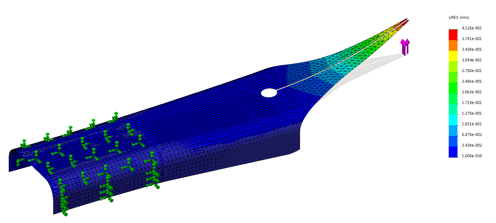 L'ho considerato vincolato per la parte solidale all'alimentatore e che imbocca nella penna e l'ho caricato per 1N (circa 100 grammi) sulla punta. (Ho considerato un pennino in acciaio legato di buona qualità)