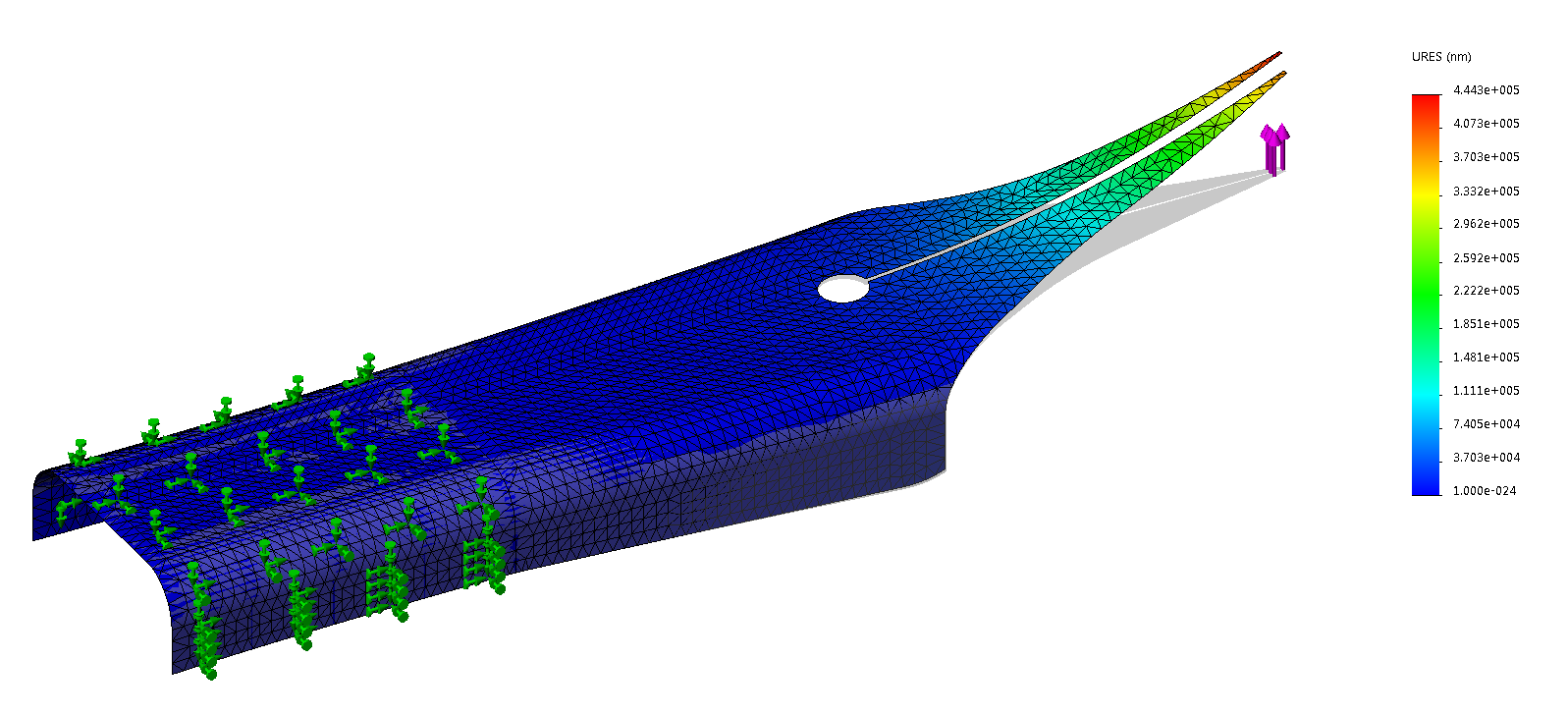 Dato che non ho un microscopio, ma ho un software per fare FEA ho modellato il pennino della mia TWSBI prendendo le misure con un calibro, dopodiché ho creato due configurazioni: una con foro centrato ed una con foro fuori asse di 0.2mm (il foro dovrebbe essere di circa 1mm di diametro).