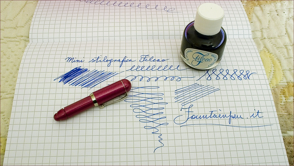 Manco a dirlo la penna non era mai stata inchiostrata e anche io mi sono astenuto dal farlo. Ho però provato a farla scrivere intingendo il pennino nell’inchiostro accluso, in verità un bellissimo blu, e con mia sorpresa la penna ha scritto subito bene, anzi benissimo, pennino piacevolmente scorrevole, scrittura fluida e corposa , senza salti.