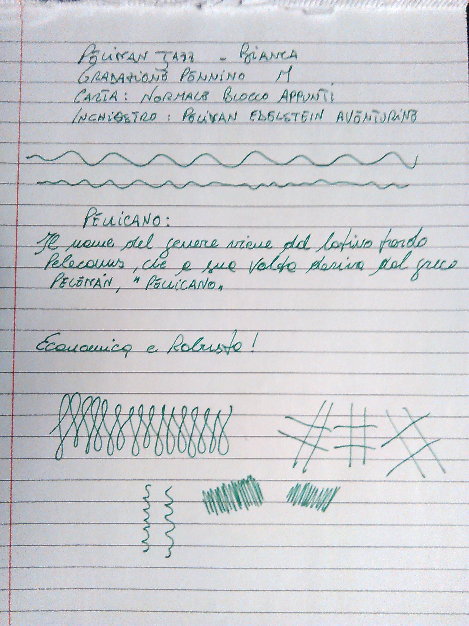Il pennino credo abbia unica gradazione disponibile M ed è in acciaio con punta iridio e logo pellicano, il flusso è abbondante e sono sporadiche le mancate partenze.