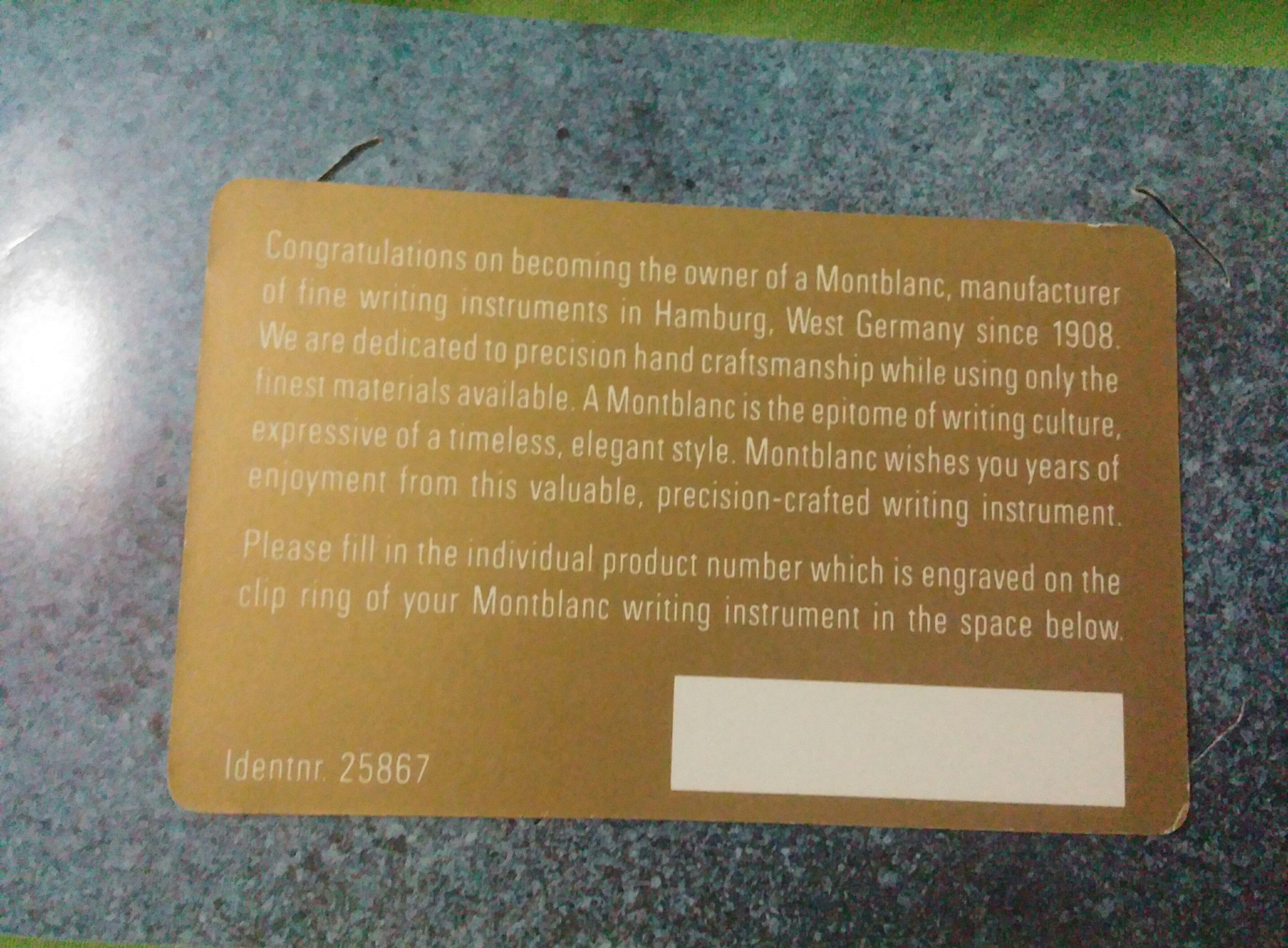 Io la vedo così: dal punto di vista dell'utente, non potrai invocare la garanzia, non hai nessun documento fiscale che certifichi la data di acquisto da un legittimo rivenditore Montblanc (la garanzia decorre da quel momento).