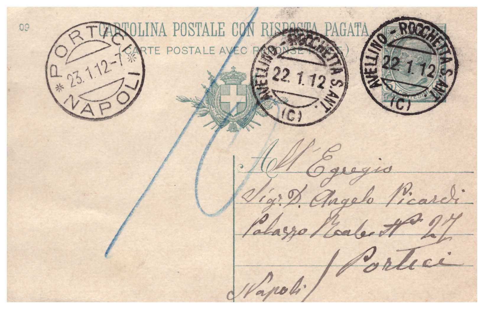 Intanto vi faccio vedere il destinatario, tale "egregio sig. D. Angelo Picardi". Ora, calcolando che non raramente ho sentito di sbadati funzionari dell'anagrafe che hanno confuso le doppie nei nomi e cognomi, se qualcuno dovesse essere interessato a questa cartolina non ha che da mandarmi il suo indirizzo in privato.