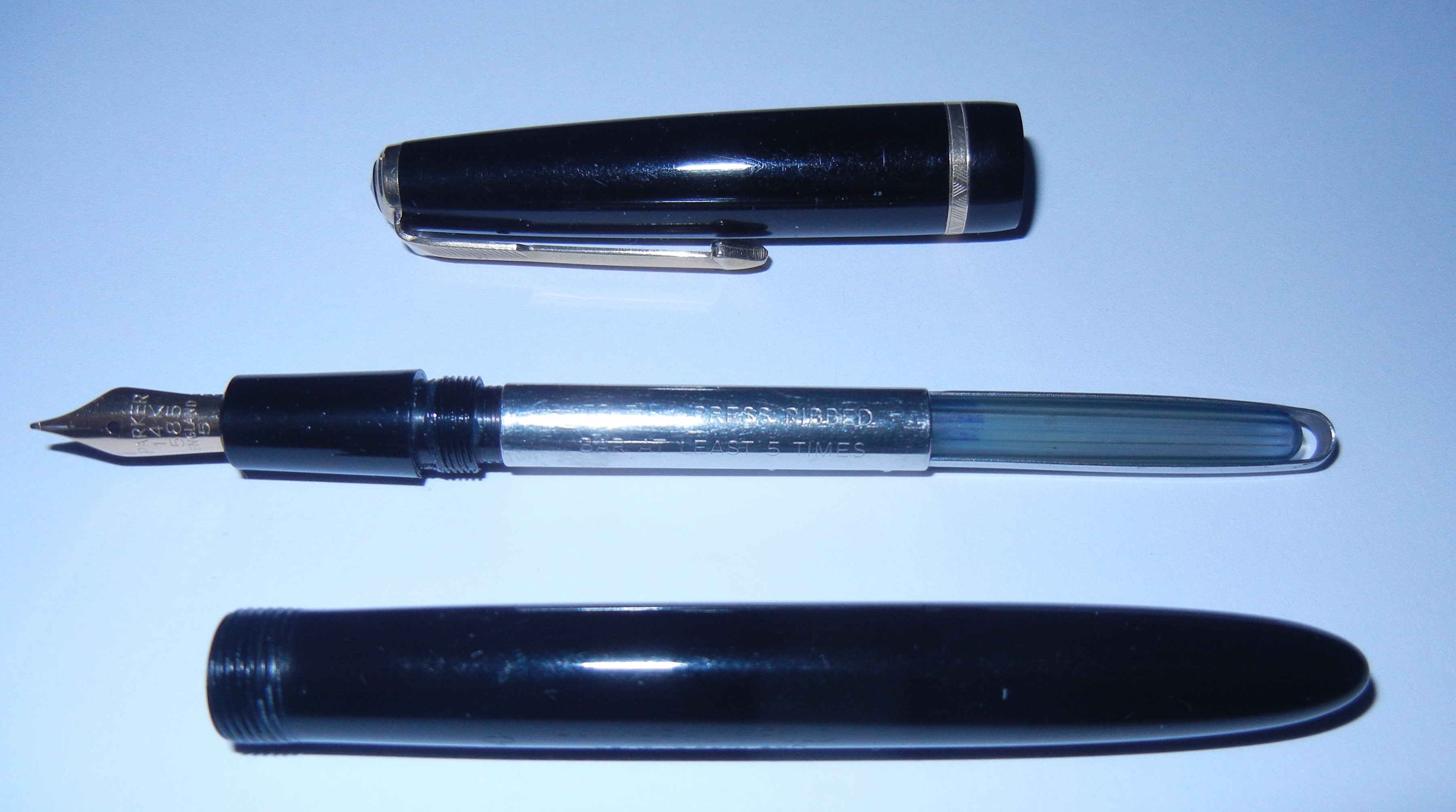 La Slimfold è dotata di caricamento aerometrico, che fu introdotto proprio dalla Parker nel 1948 per equipaggiarne la "51", in sostituzione del precedente sistema vacumatic. Devo dire che il sistema funziona perfettamente, soprattutto dopo aver sottoposto la penna ad un'accurata pulizia , anche se sono stato fortunato a trovare un esemplare in buonissime condizioni.