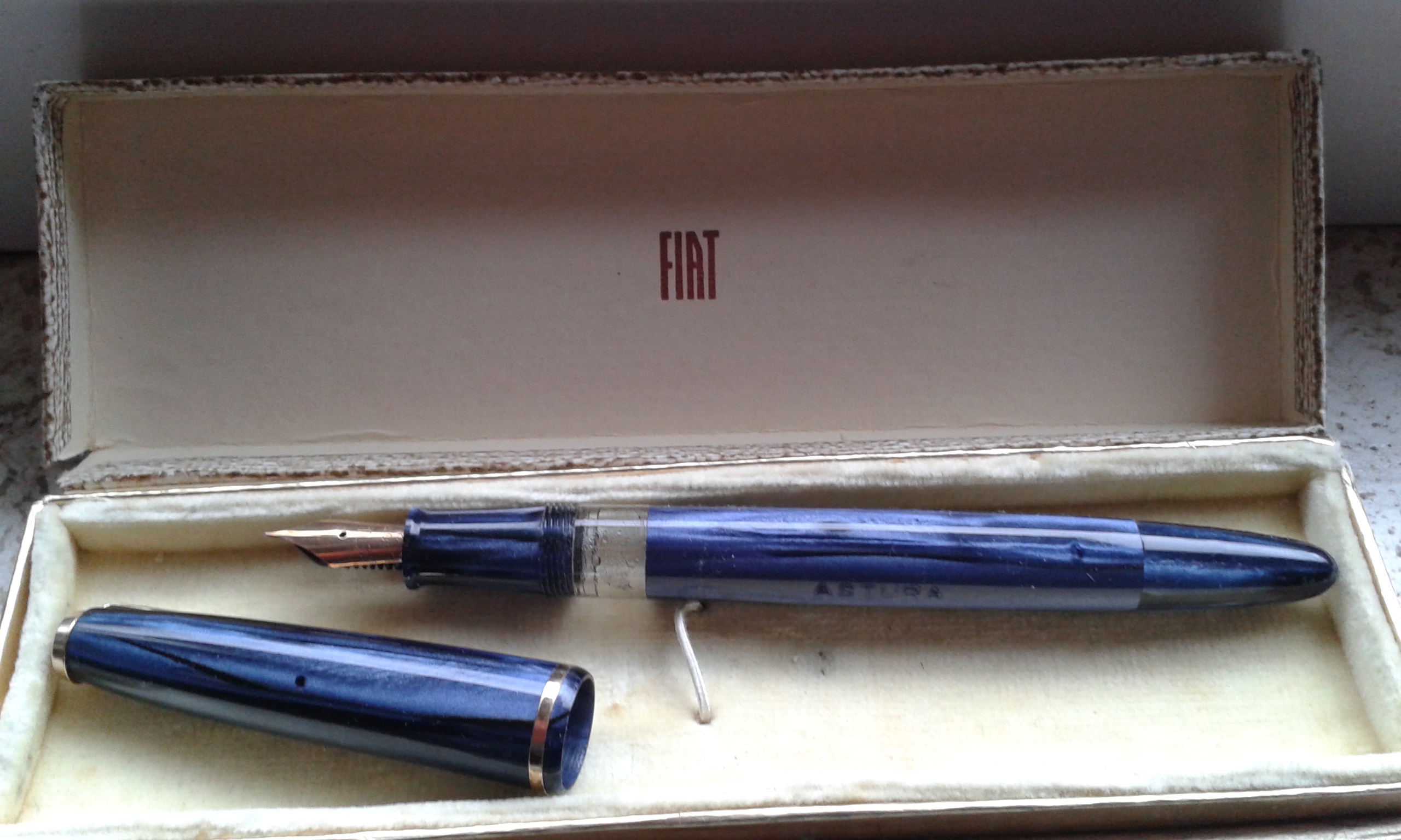 Stilografica marca "ASTURA" pennino oro 585 marcato "ASTURA", caricamento a stantuffo, funzionante, penna pubblicitaria, credo, con scatola ed istruzioni in buono stato, all'interno vi è presente il logo FIAT.