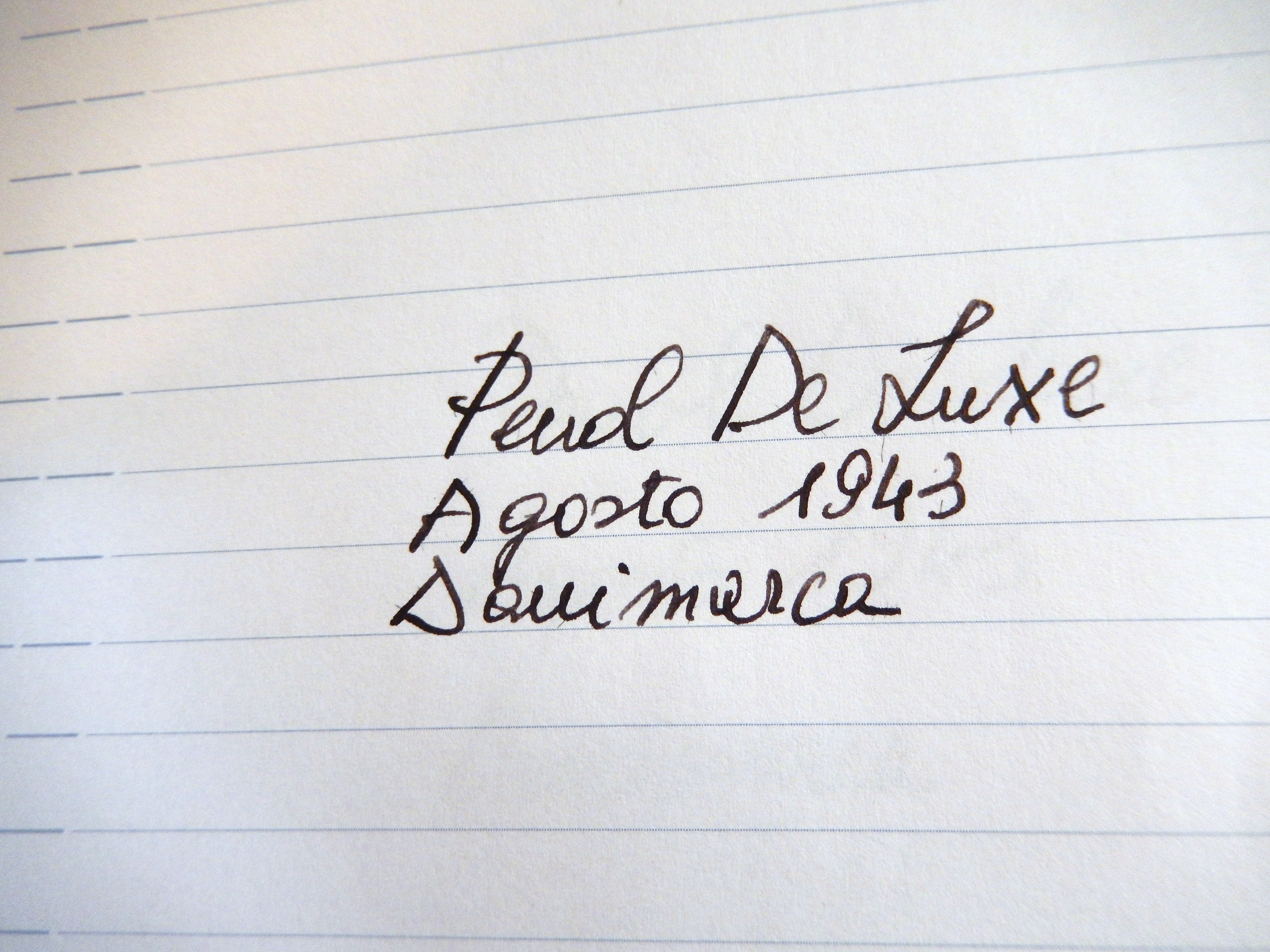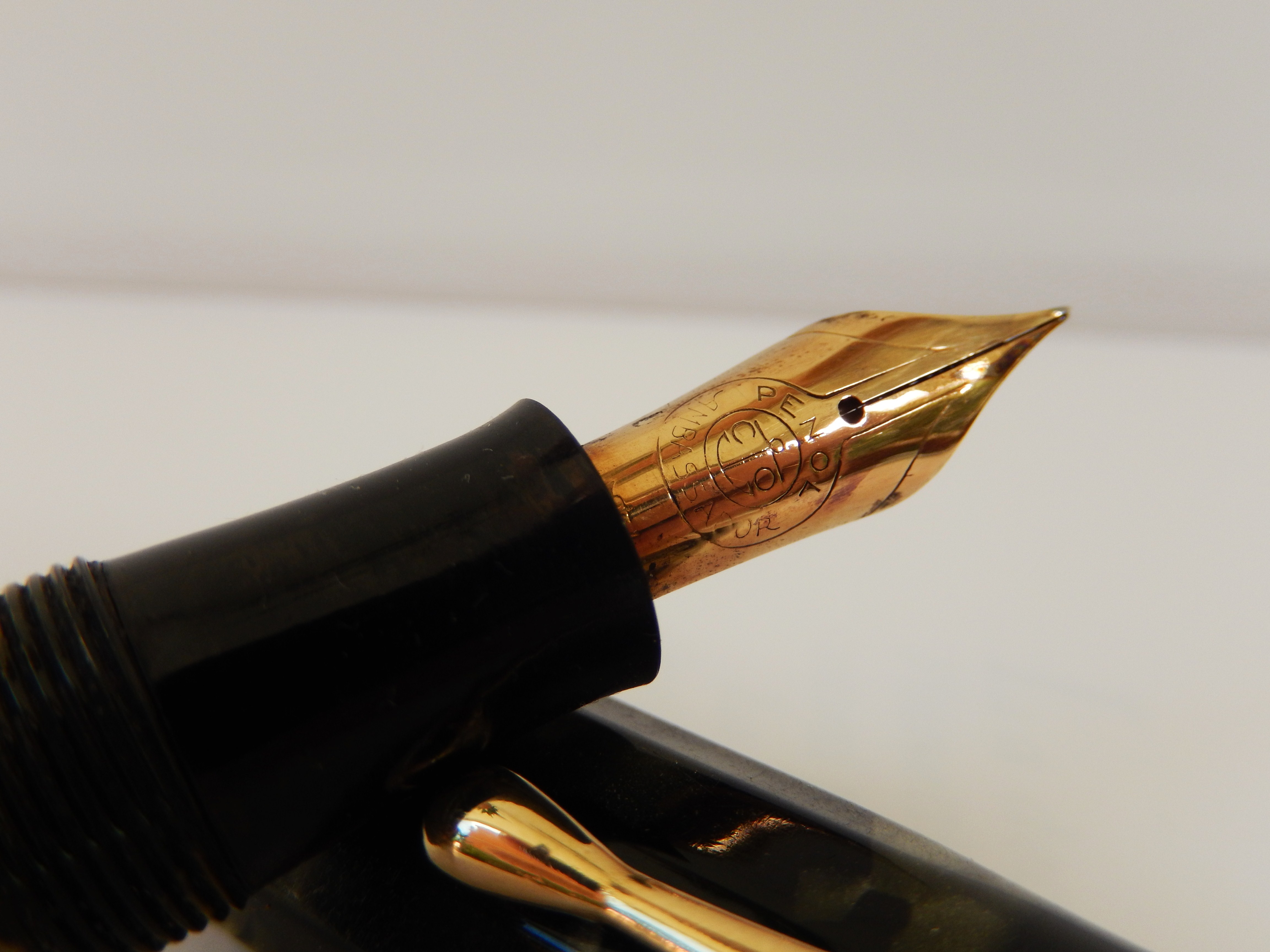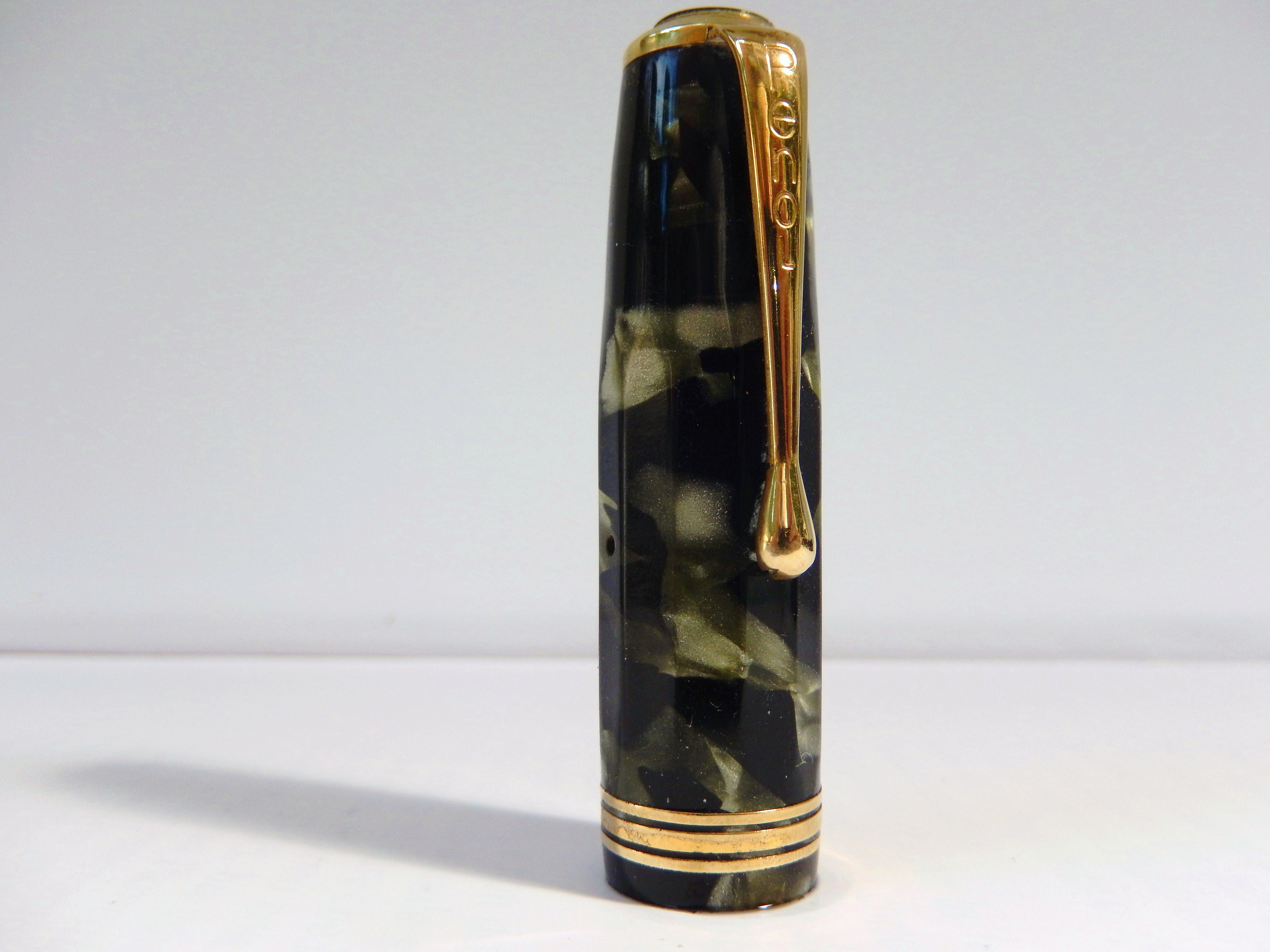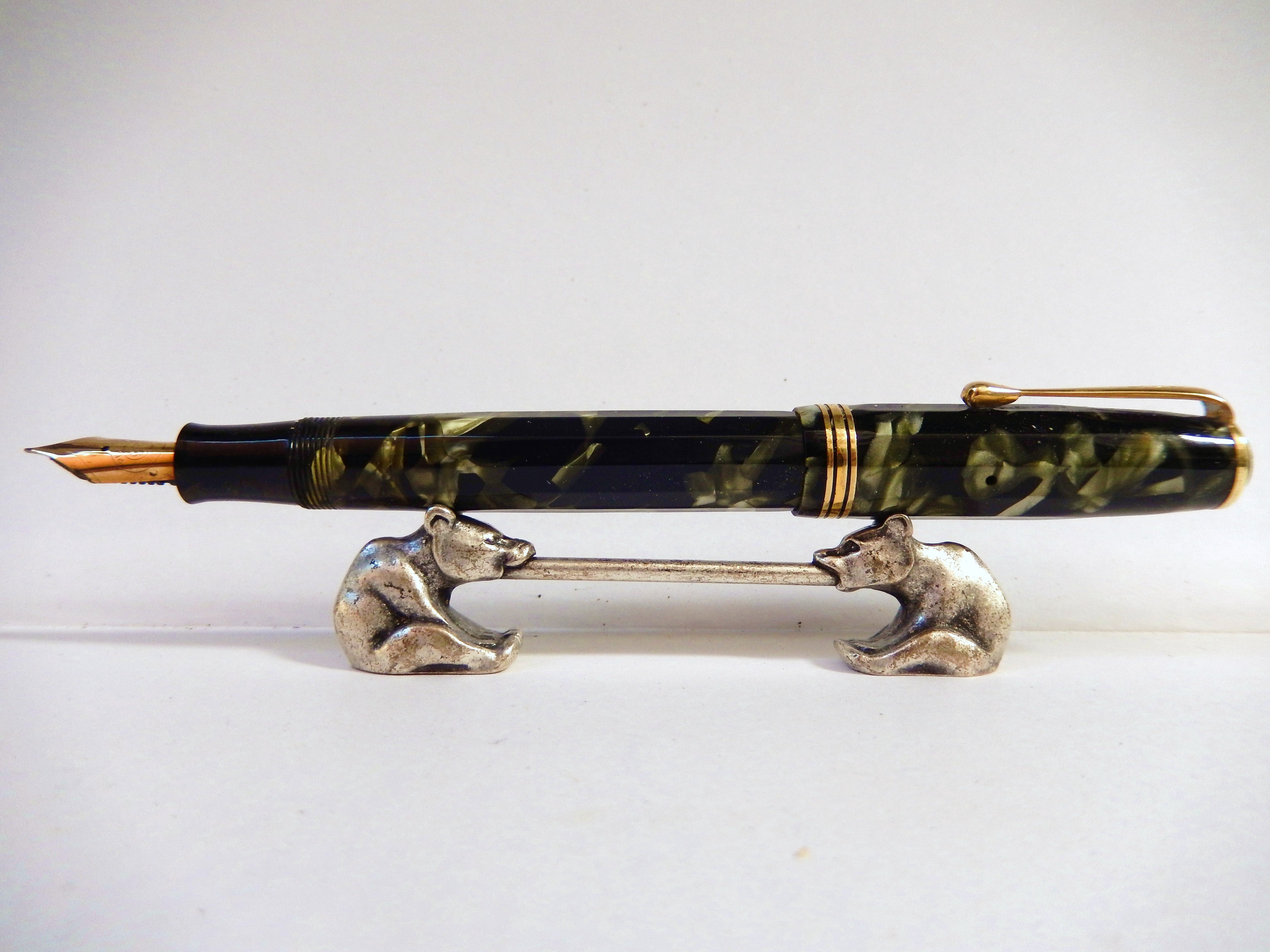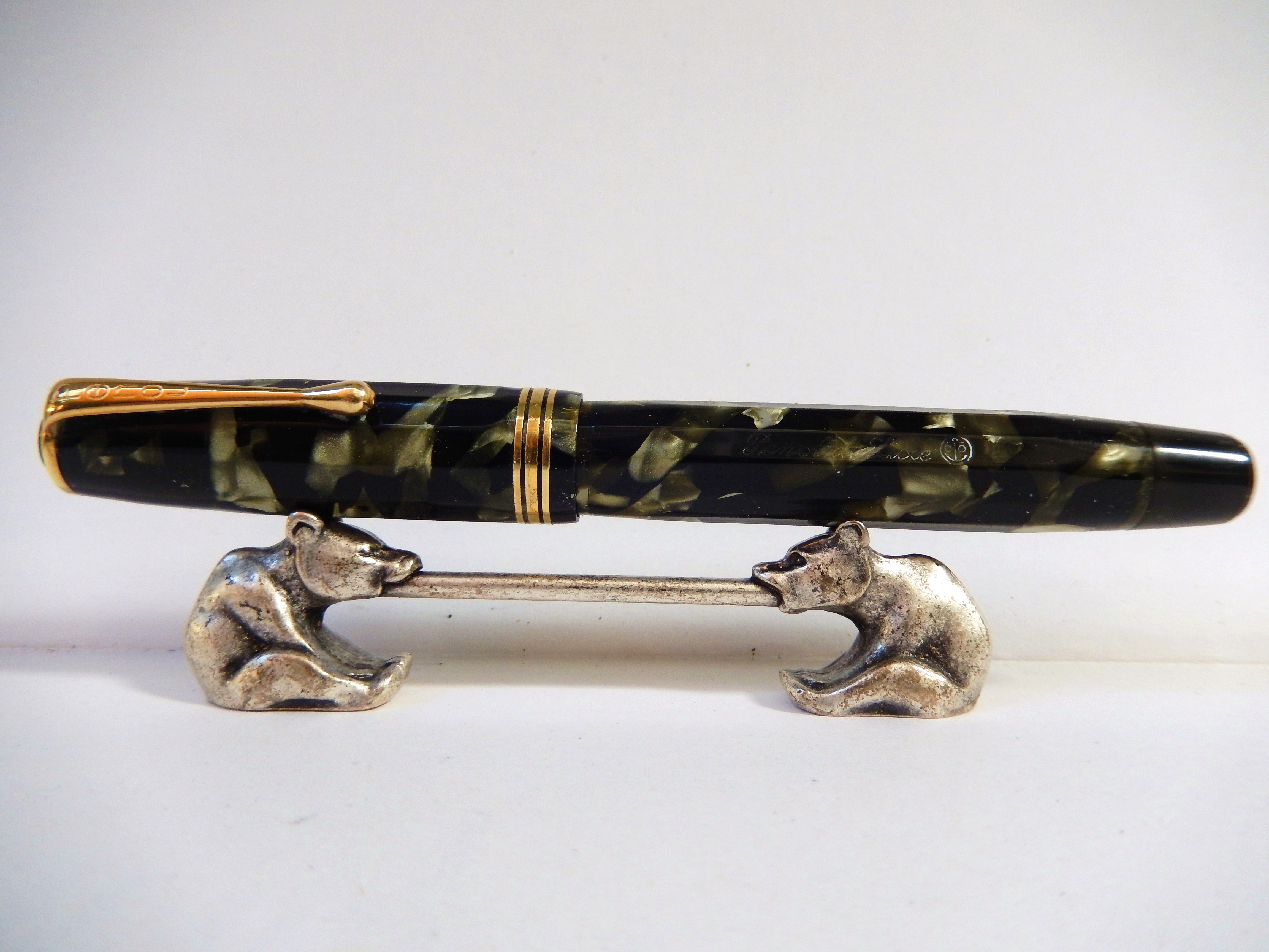 di fatto si usano di più; nel mio caso è così con questa PENOL de luxe , in linea con la mia predilezione per le penne d'epoca. La casa nasce su iniziativa di Christian Olsen , dai primissimi del 900 rappresentante della Parker per la Danimarca; all'epoca le Parker da lui importate venivano caratterizzate con le lettere CO affianco ad un ancora, oltre che naturalmente dal marchio Parker. Dal 1932 e fino ai primi anni 60 Olsen produsse negli stabilimenti di Kobenhavn, Emdrupvej 28 ( Copenaghen) penne con il marchio PENOL ( Pen - Olsen ) di ottima qualità, in gran parte lavorate artigianalmente, produzione non interrotta neppure quando il 9 Aprile del 40 e fino al 45 la Danimarca fu occupata da truppe tedesche. Ed infatti questa PENOL mod. De Luxe riporta sul corpo il date code 843 ( Agosto 1943) Ha un sistema di carica a pulsante, è lunga chiusa 13,2 cm, in una bellissima celluloide color black and grey marble con 12 faccette che vanno a morire a circa un cm dalla vite di metallo a due gradini che fissa la clip, sulla quale è riportato il marchio Penol e che termina a goccia tipo alcune Montblanc - danesi e non -di quel periodo . Alla fine del cappuccio tre verette stretto- largo- stretto. Sul corpo è inciso in corsivo "Penol de Luxe" affiancato da un cerchietto che contiene le iniziali CO affianco all'ancora 8 sembra che Olsen fosse un appassionato navigatore). Il pennino coerentemente con gli anni di guerra è in acciaio ed è molto flessibile; riporta il marchio Penol e la scritta Ambassador. Pensando al periodo bellico in cui fu realizzata questa penna sorprende per la sobria eleganza e l'eccellenza dei materiali. E' molto equilibrata, ha un ottima impugnatura e considerato anche il diametro generoso è molto leggera