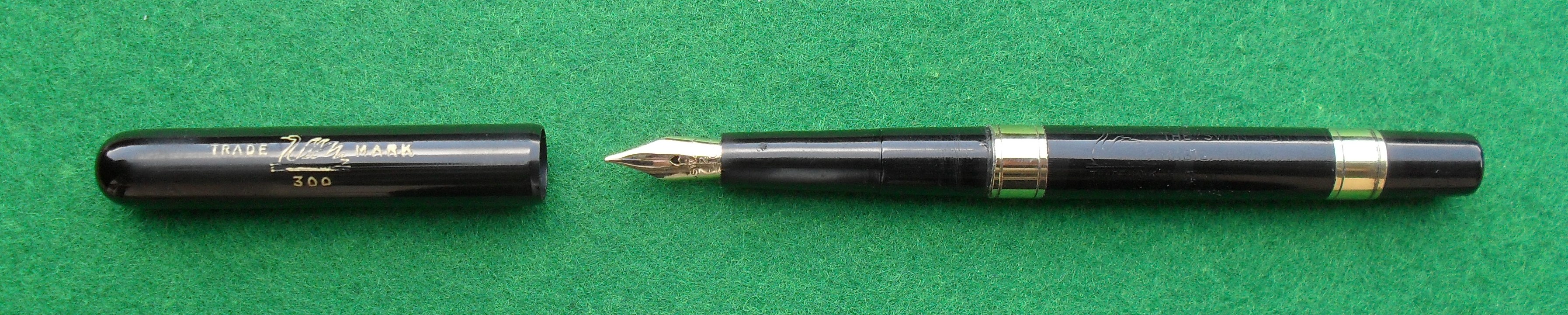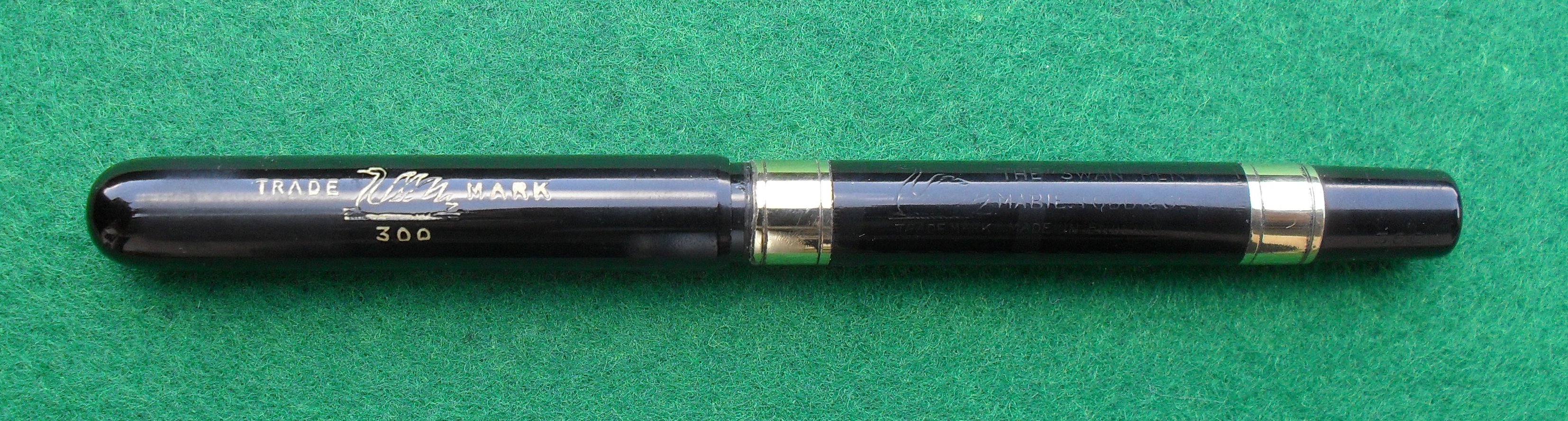 Il corpo, finemente cesellato, riporta incisi sia il cigno, con la scritta “Trade mark”, sia, su tre righe successive, “The Swan pen”, “Mabie Todd & C°”, “Made in England”.