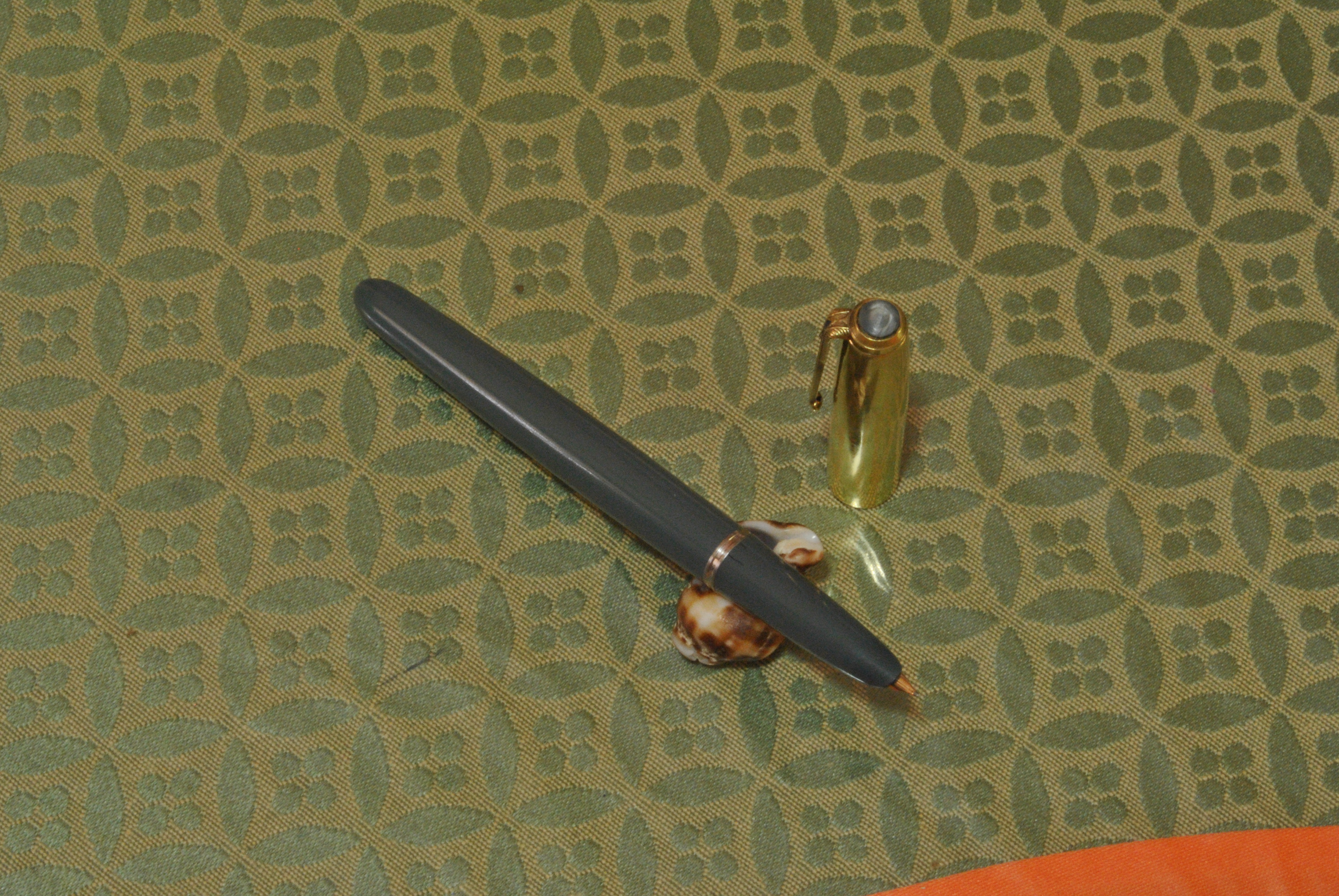 Si tratta di una Parker "51" aereometrica in colorazione Dove Gray. Quando l'ho acquistata aveva il puntale spezzato, il cappuccio era quello di una Parker "21" che tra l'altro non aveva nemmeno il gioiello e aveva un pennino B che non m'era per niente simpatico.
