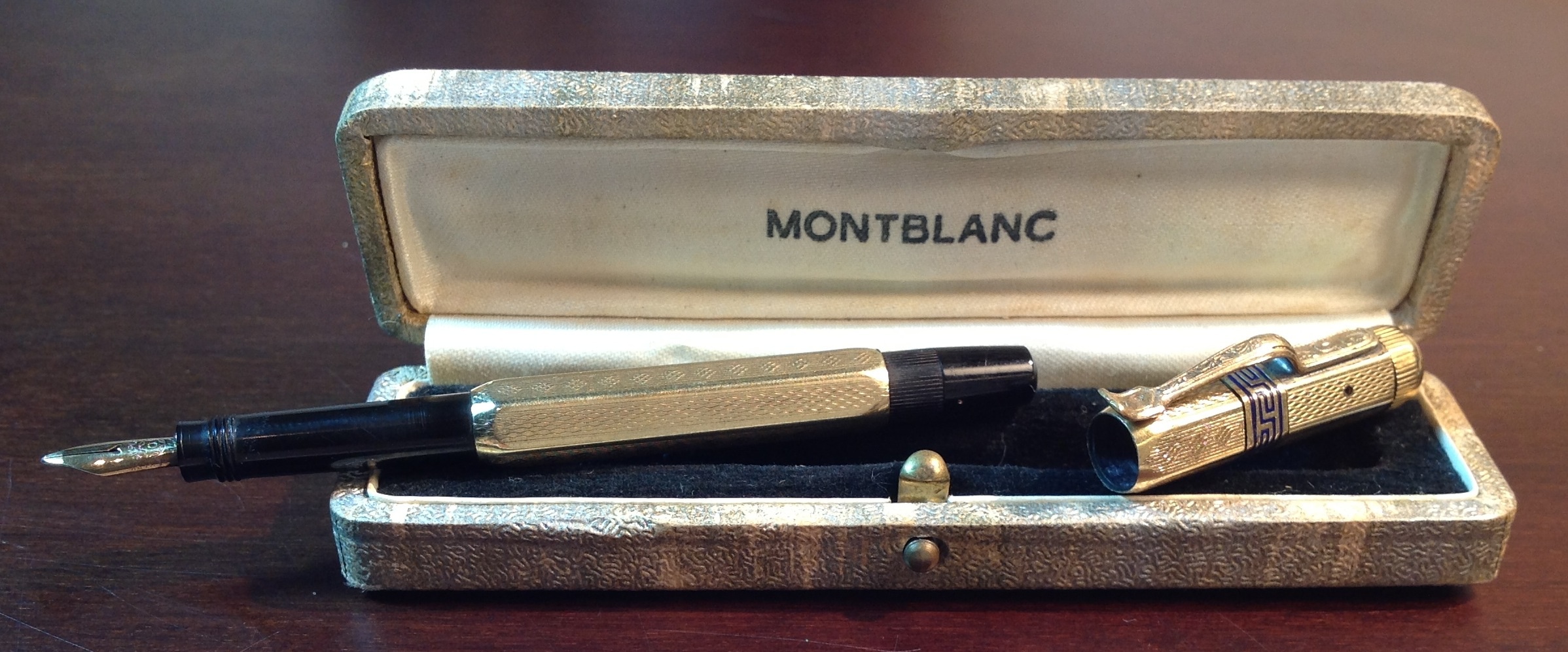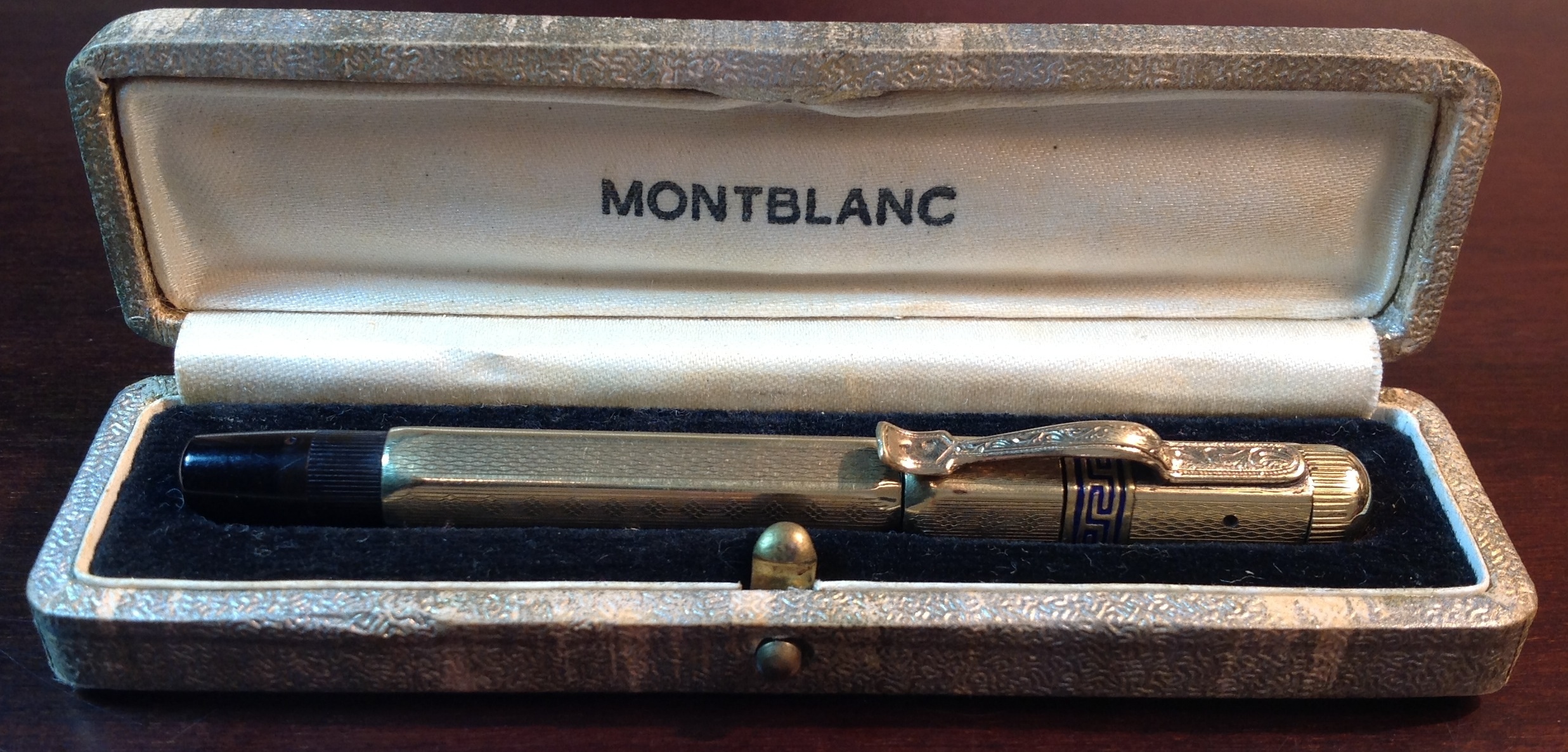 Il cappuccio ha una fascetta con greca smaltata di blu, e presenta anche un insolito marchio Montblanc inciso...