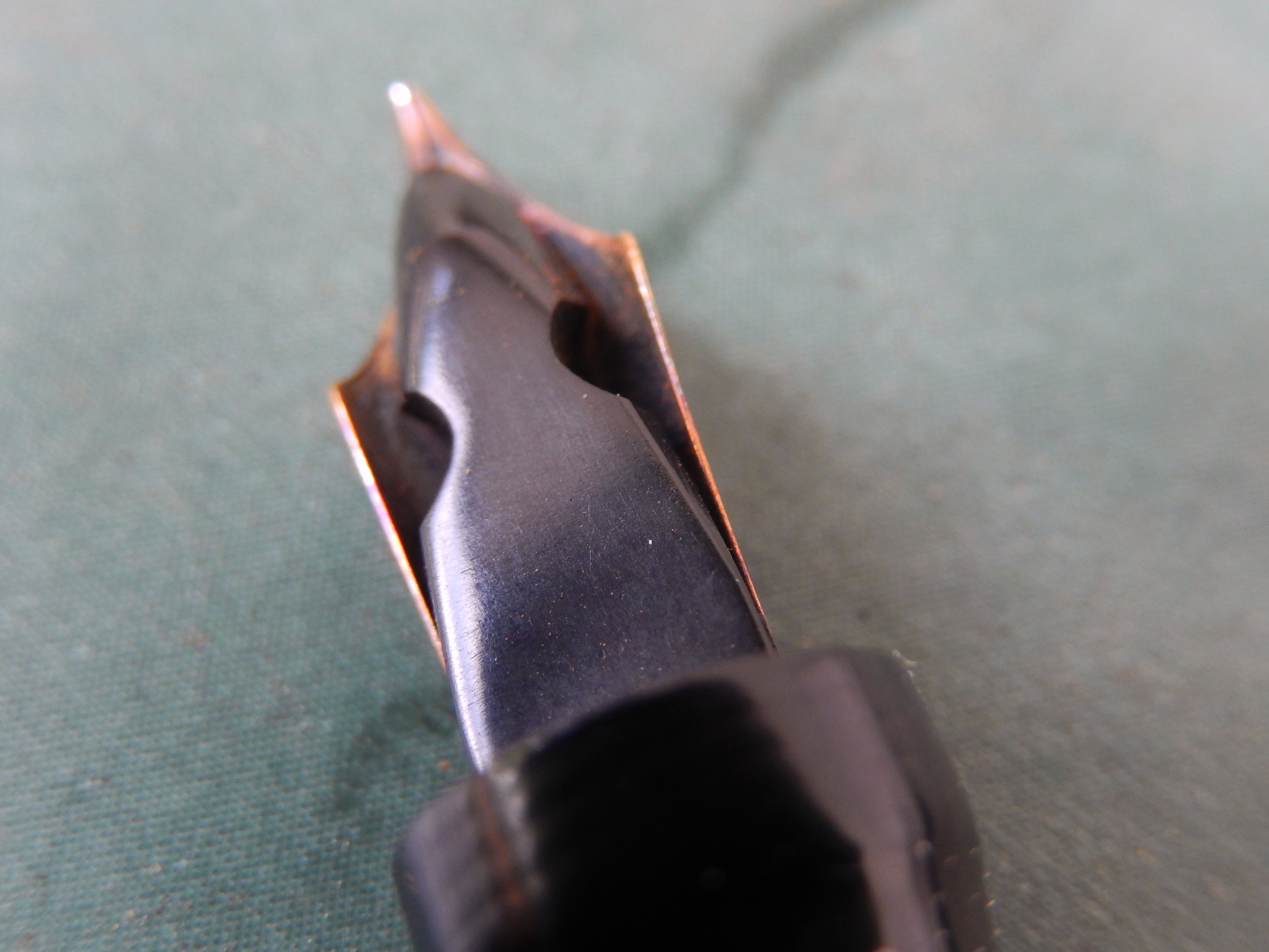 Il pennino, con il foro a forma di crescent moon ( nella Nozac diverrà tondo) porta inciso "Conklin Endura". Della Endura flat top, che dal 1924 era stato il modello principe della casa, la SymetriK non mantiene molto e l'averne conservato il nome fu probabilmente un modo per ricollegarsi nell'immaginario del cliente al successo del modello precedente. Oltre infatti chiaramente alla linea cambia