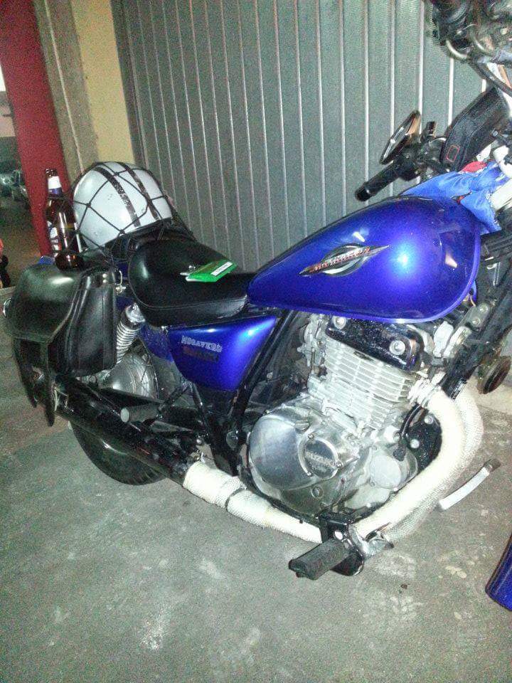 Suzuki Marauderr 250...conciato malissimo non so se ci fosse sopra più ruggine o polvere..Firmato il passaggio giovedì, lunedì successivo avevo la patente (con restrizioni :/ ) Subito a lavoro, dalla pulizia alla manutenzione..rigorosamente fatta da me! Custom Old-style, frizione,forche,trasmissione, olio & filtri vari..le ho dato davvero una nuova vita! Mi son buttato sempre con "ignoranza" in mezzi ai più grandi, alcuni mi guardavano male, molti invece mi hanno accolto sempre benissimo!