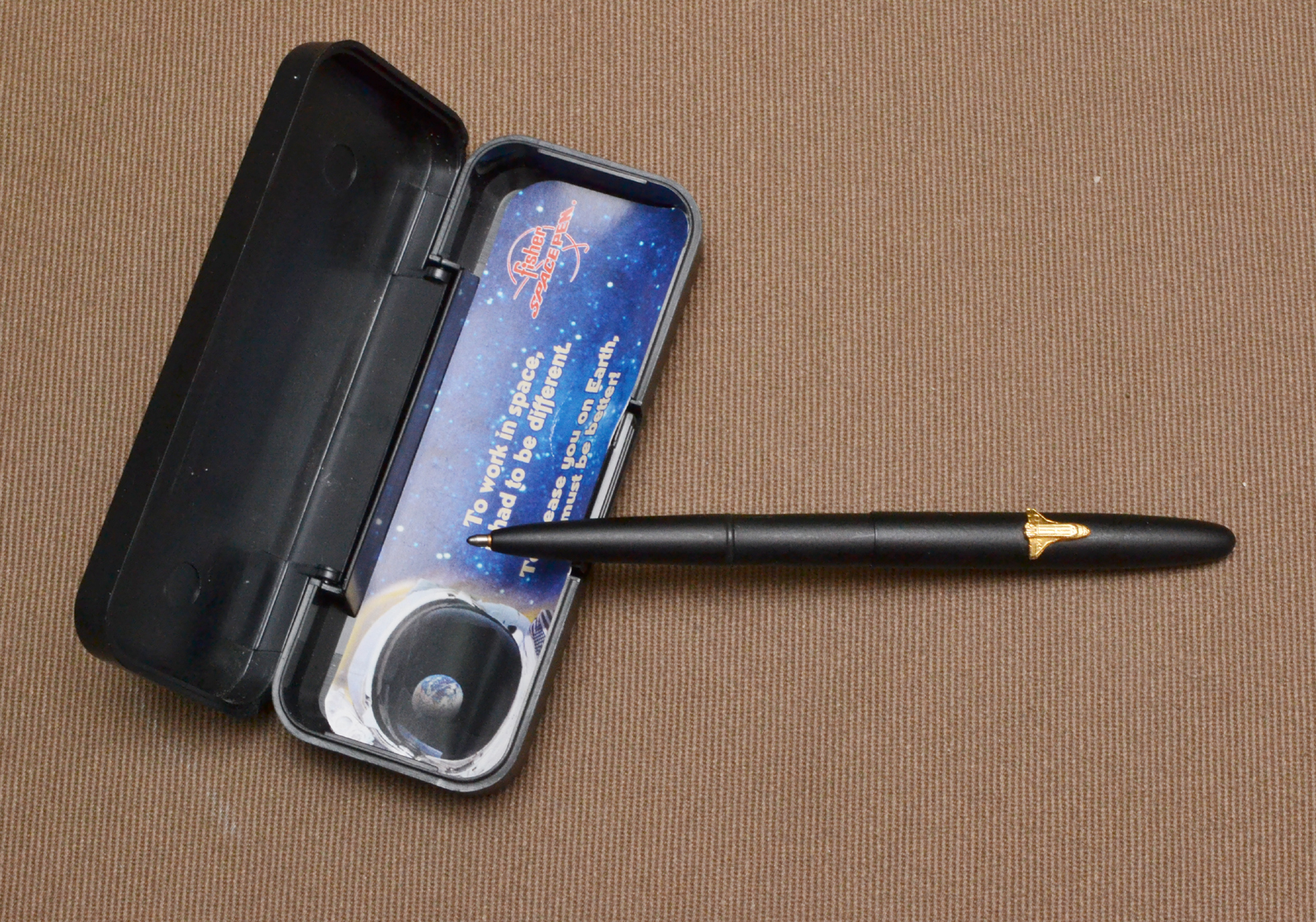 Questa penna particolare è frutto della mente di Paul Fisher, è un oggetto rivoluzionario che scrive in tutte le posizioni, è usata dalle agenzie spaziali di tutto il mondo perchè scrive in assenza di gravità ed a temperature che vanno da - 35 a + 120 gradi centigradi.