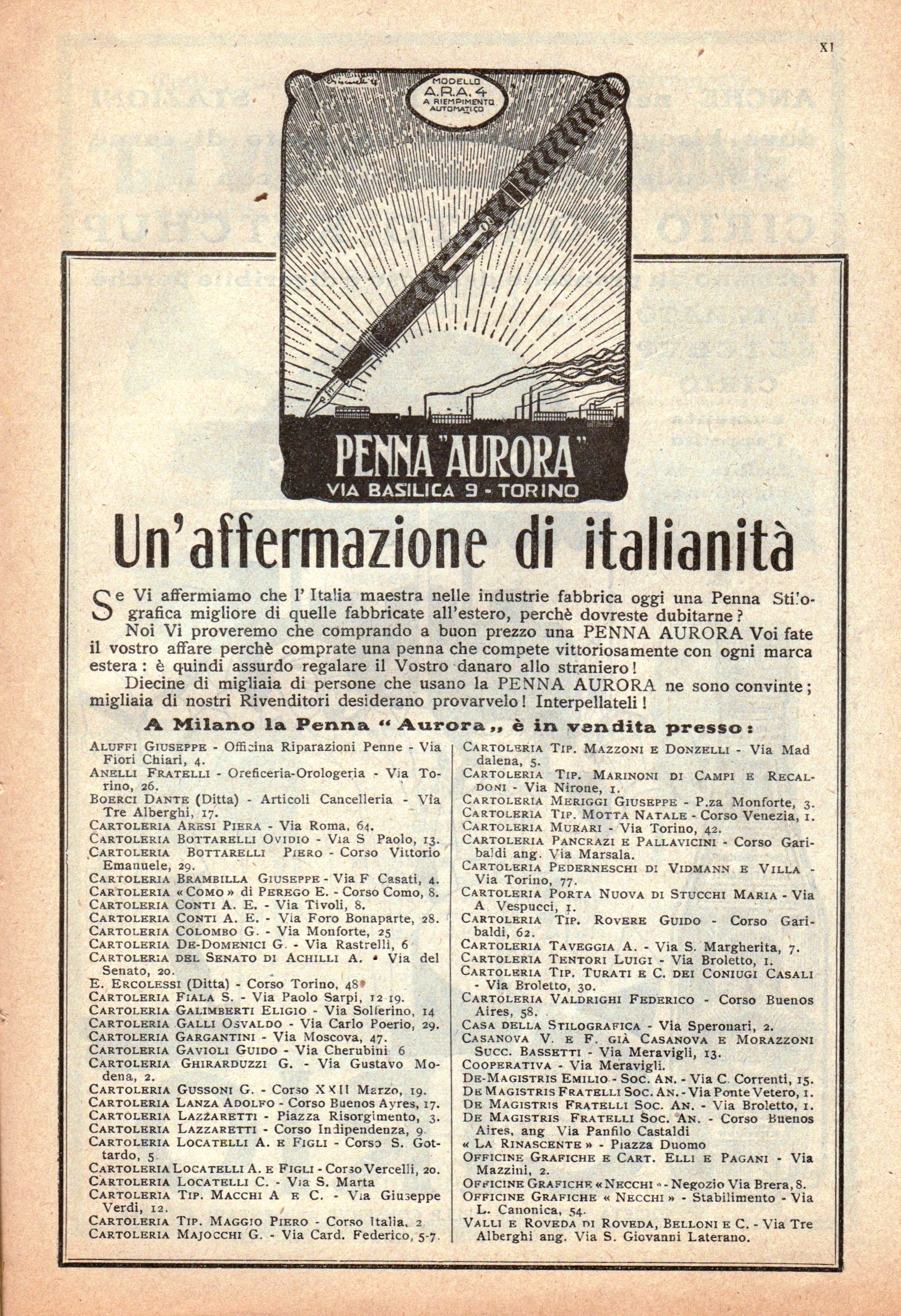Per testimoniare lo slancio mediatico delle due Aziende in quell'anno ruggente, allego un'altra cattura odierna: una pubblicità di Aurora, mooolto patriottica, sulla medesima Rivista solo due mesi dopo, che ne testimonia la penetrazione sul mercato milanese, il più ricco d’Italia, facendo di Aurora il degno partner commerciale della inarrivabile IF.
