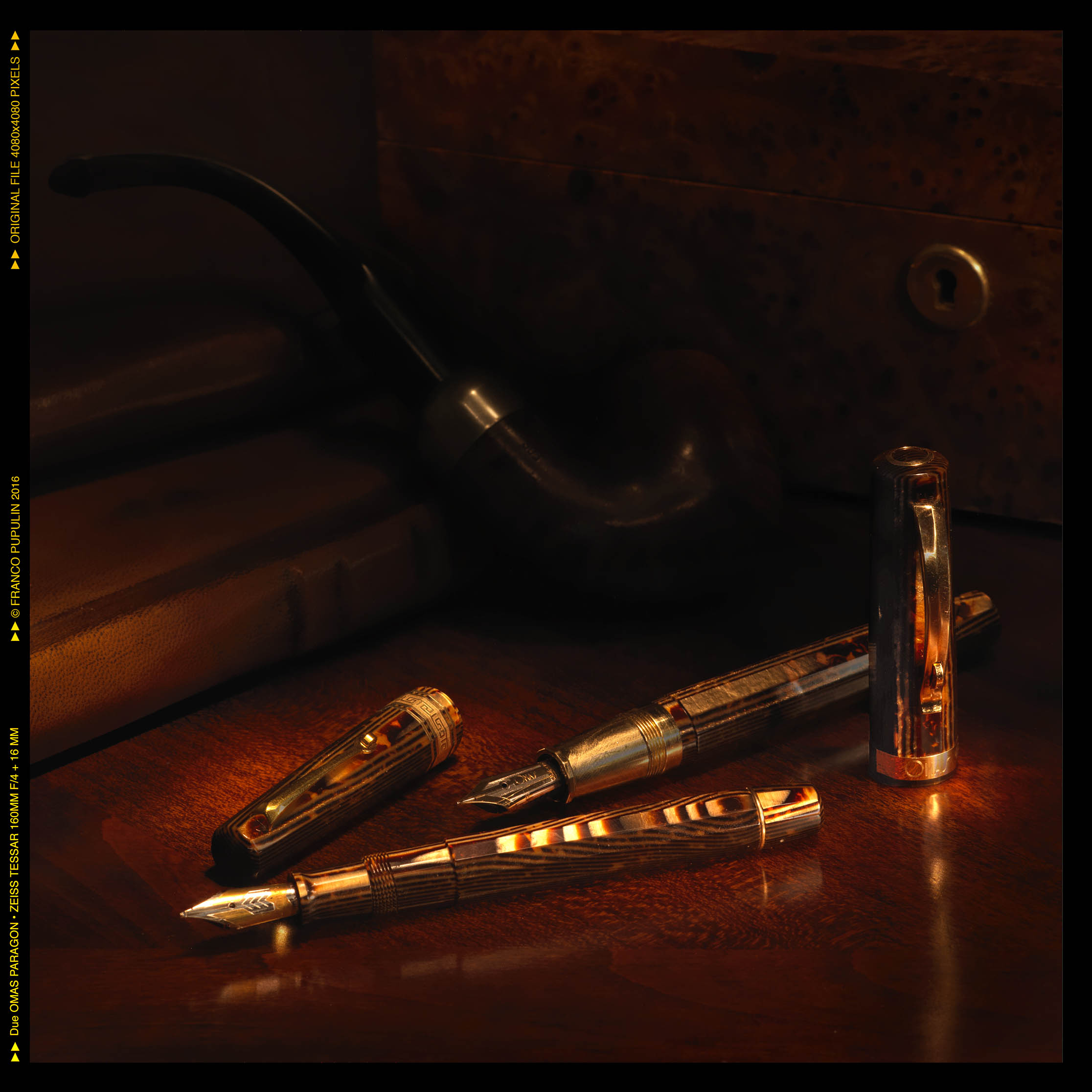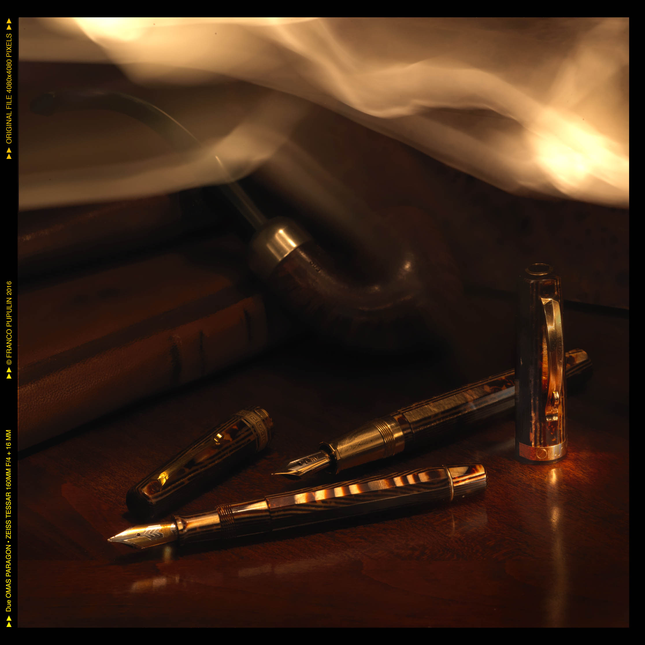 Venticinque, et voila! Hmmm, non va, troppa luce sul pennino in primo piano, e ancora troppa luce sulla pipa. Si ricomincia. Uno, due, spengo la luce. Tre, quattro… venticinque. Risultato: troppo scuro lo sfondo.