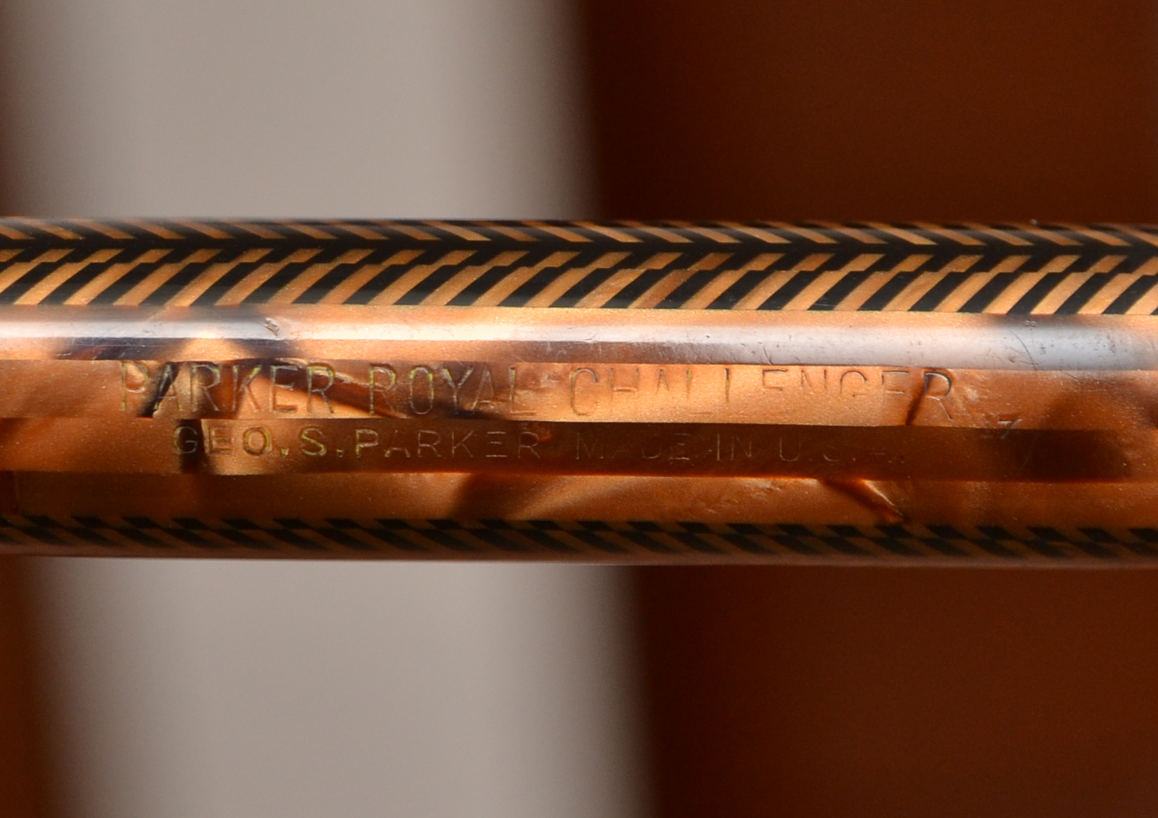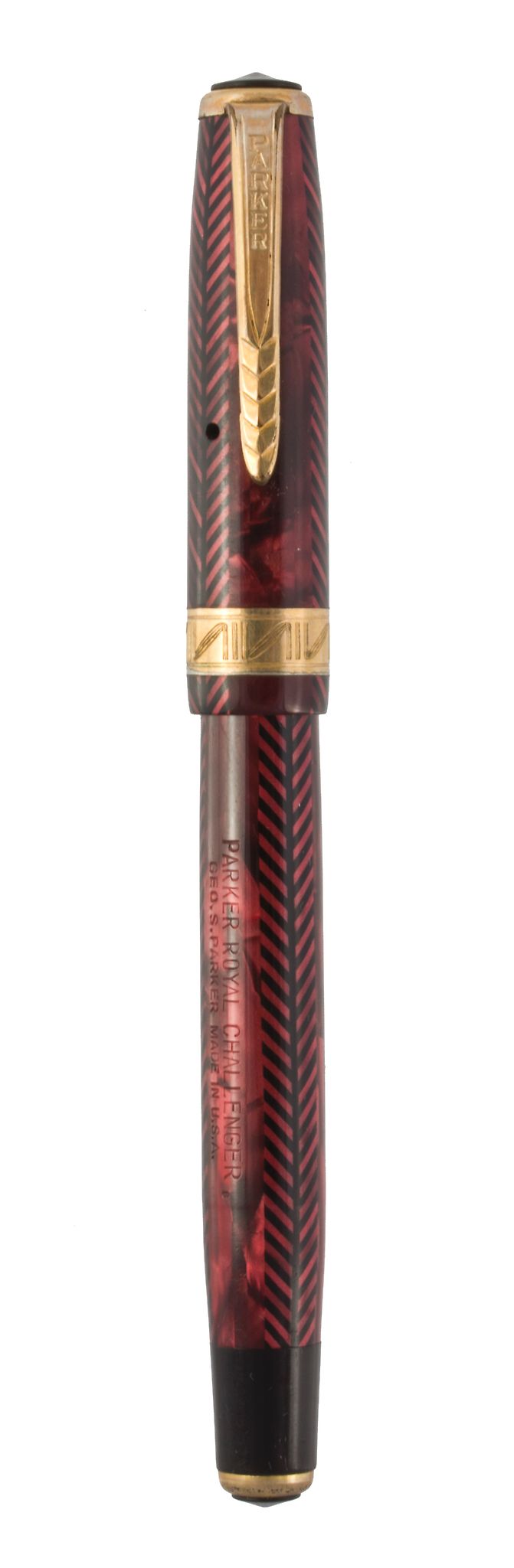 Il modello Royal in mio possesso è in celluloide con disegno a strisce verticali intervallate da tre linee sempre verticali con disegni a freccia come la sua famosa clip che percorrono tutto il cappuccio e tutto il fusto, sul quale è stampato "PARKER ROYAL CHALLENGER GEO S.PARKER MADE IN U.S.A."