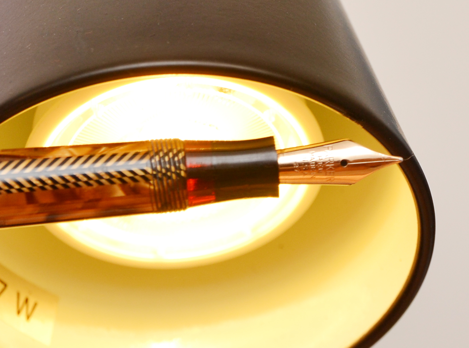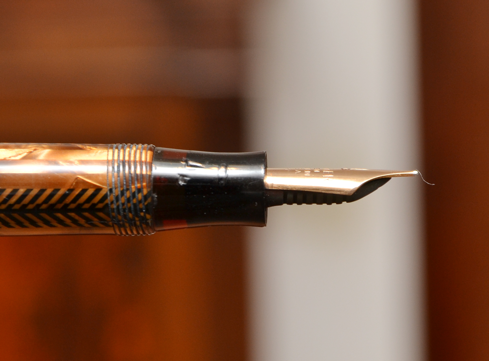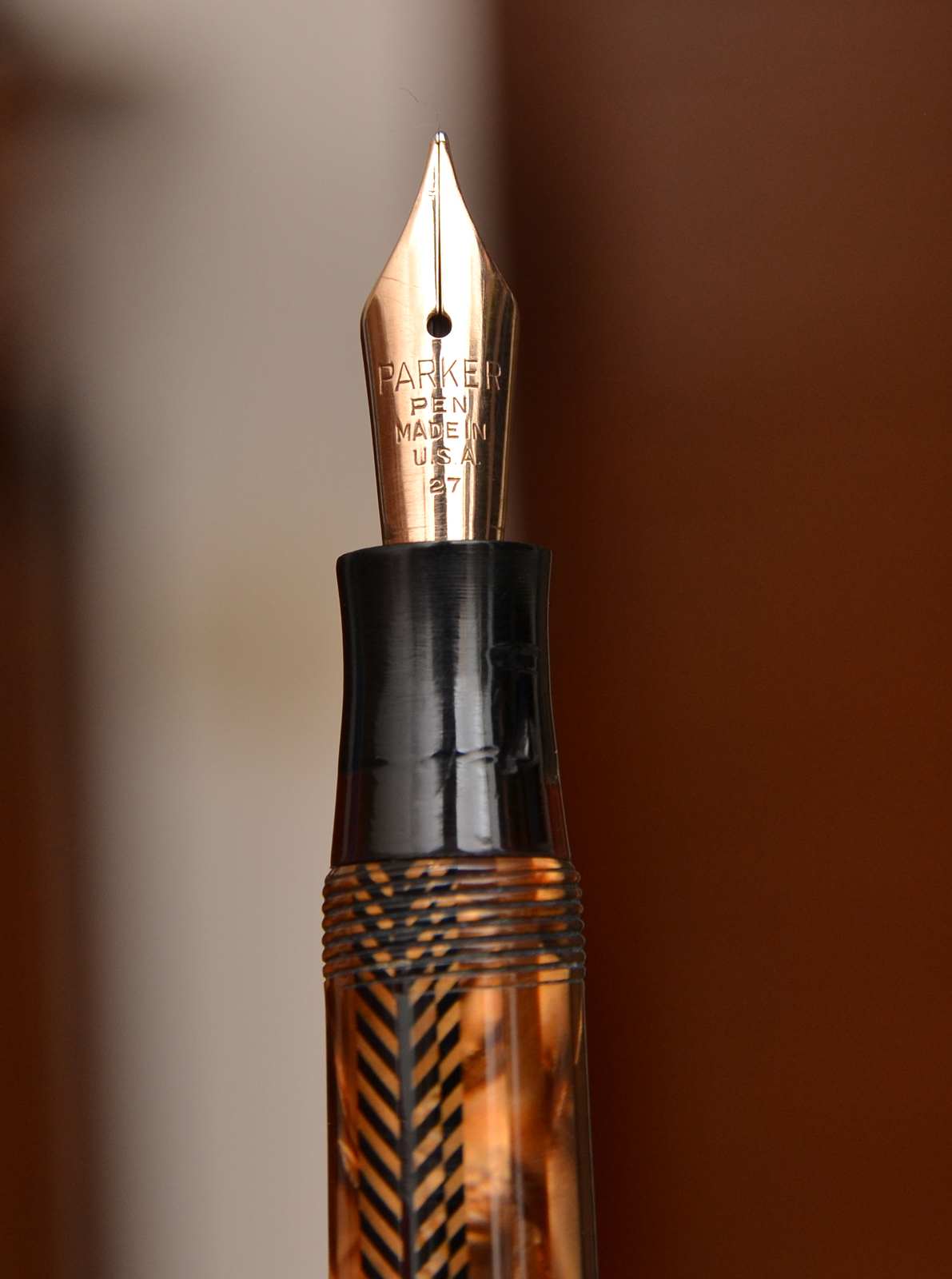 Il pennino non è a freccia come quello delle Vacumatic, ma un normale pennino in oro con la scritta"PARKER PEN MADE IN U.S.A. 27" e la parte che del pennino che fuoriesce dalla sezione è di 1,8 cm.