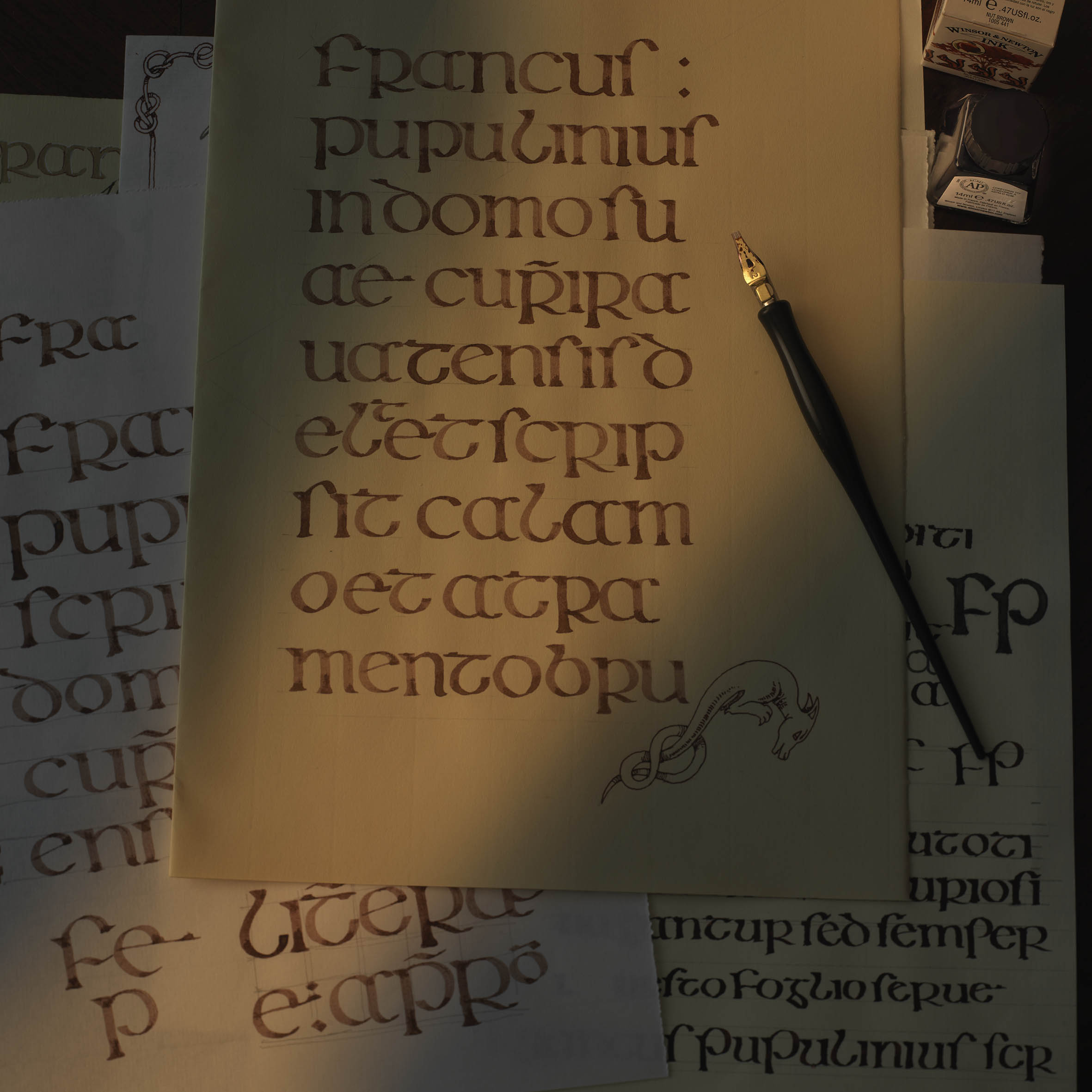 Drogin suggerisce che la maiuscola insulare può eseguirsi con un’altezza del carattere da quattro a cinque larghezze del pennino, ma indica che un’altezza maggiore conferisce alla grafia un aspetto più stilizzato e importante. Mediavilla indica invece che la semionciale insulare dovrebbe eseguirsi con un’altezza pari a quattro volte e mezza la larghezza del pennino. E’ l’altezza che ho usato sul foglio color chamois, con un pennino da circa 3 millimetri di larghezza.