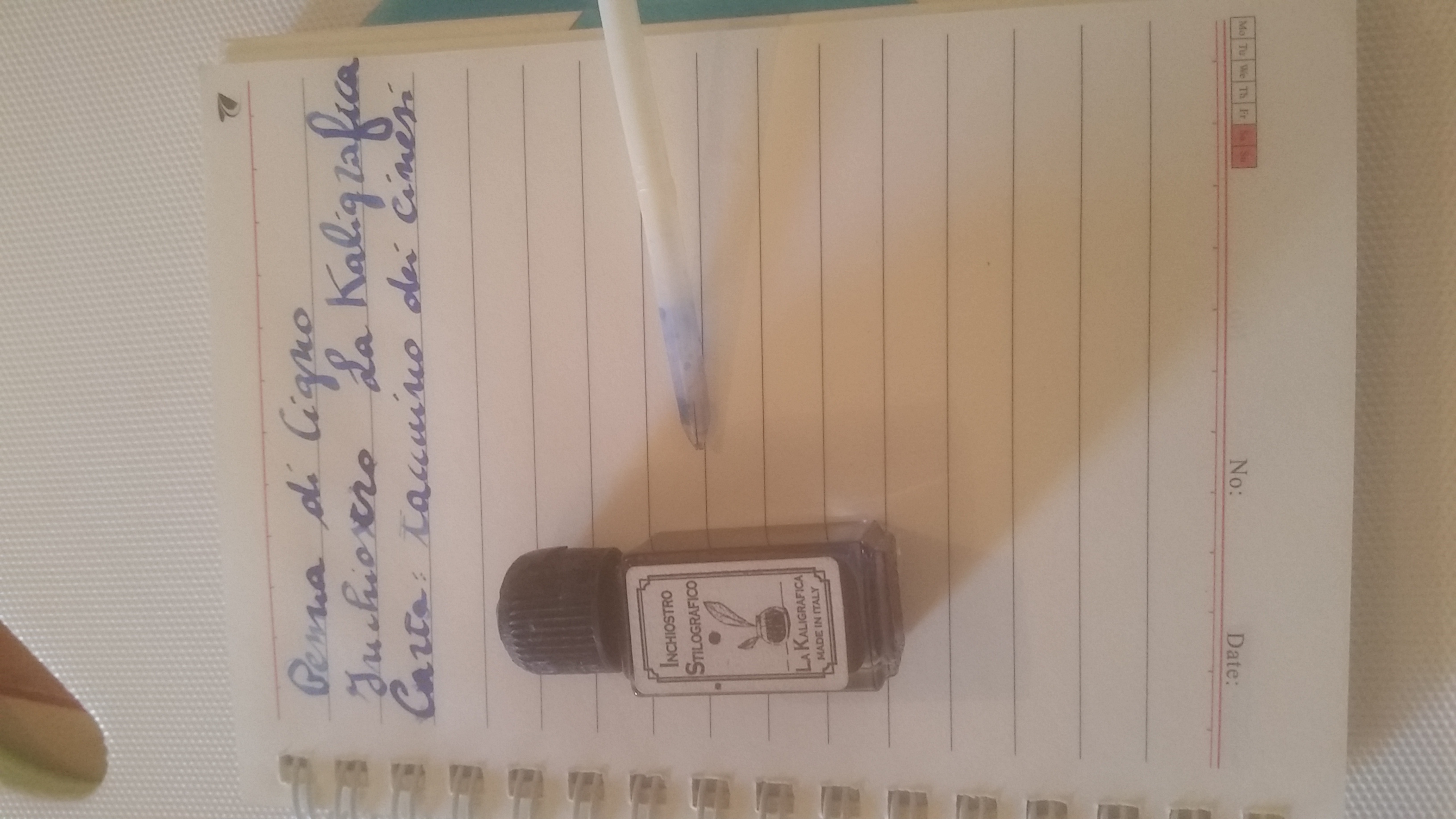 Comunque, dopo faticoso intaglio della punta, l'ho provata con un campioncino di inchiostro omaggiatomi dalla cartoleria quando ho comprato la Lamy Safari, che in tutta onestà non avevo ancora provato con una stilografica. L'etichetta dice solo "Inchiostro Stilografico - La Kaligrafica- Made in Italy".