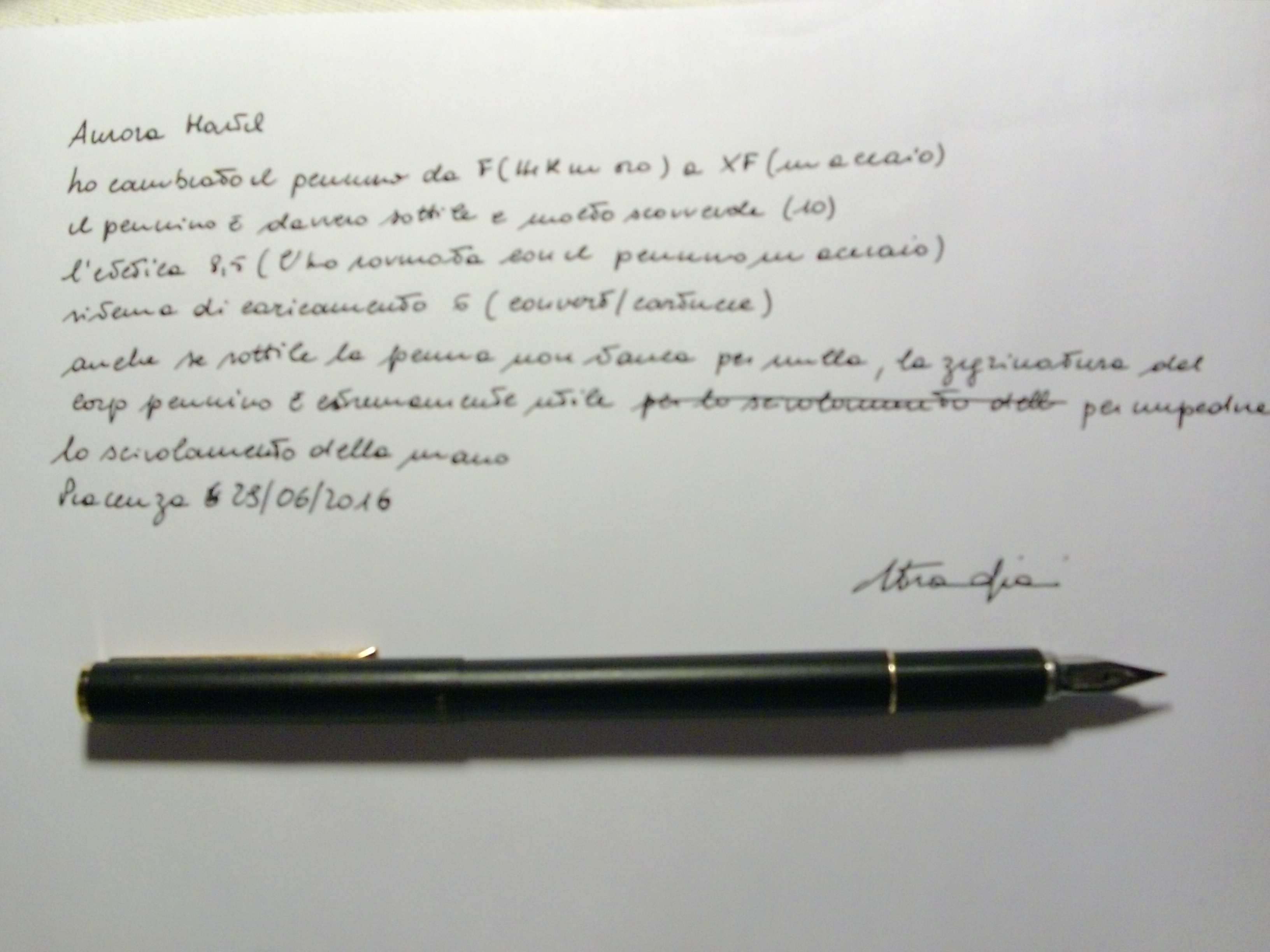 Da quando frequento questo sito parlo solo di calligrafia e di penne stilografiche, così alcune anime buone mi hanno regalato le loro. Mio marito mi ha donato quelle appartenute al mio amato suocero ed una cara amica di famiglia le due Aurora (ho cercato di classificarle, spero nel modo corretto data la mia inesperienza). Per ora funzionano la Parker 51, la Artus e le due Aurora (i cui cappucci non oso pulire). Le altre sono variamente danneggiate e vi chiederò aiuto nella sede opportuna.
