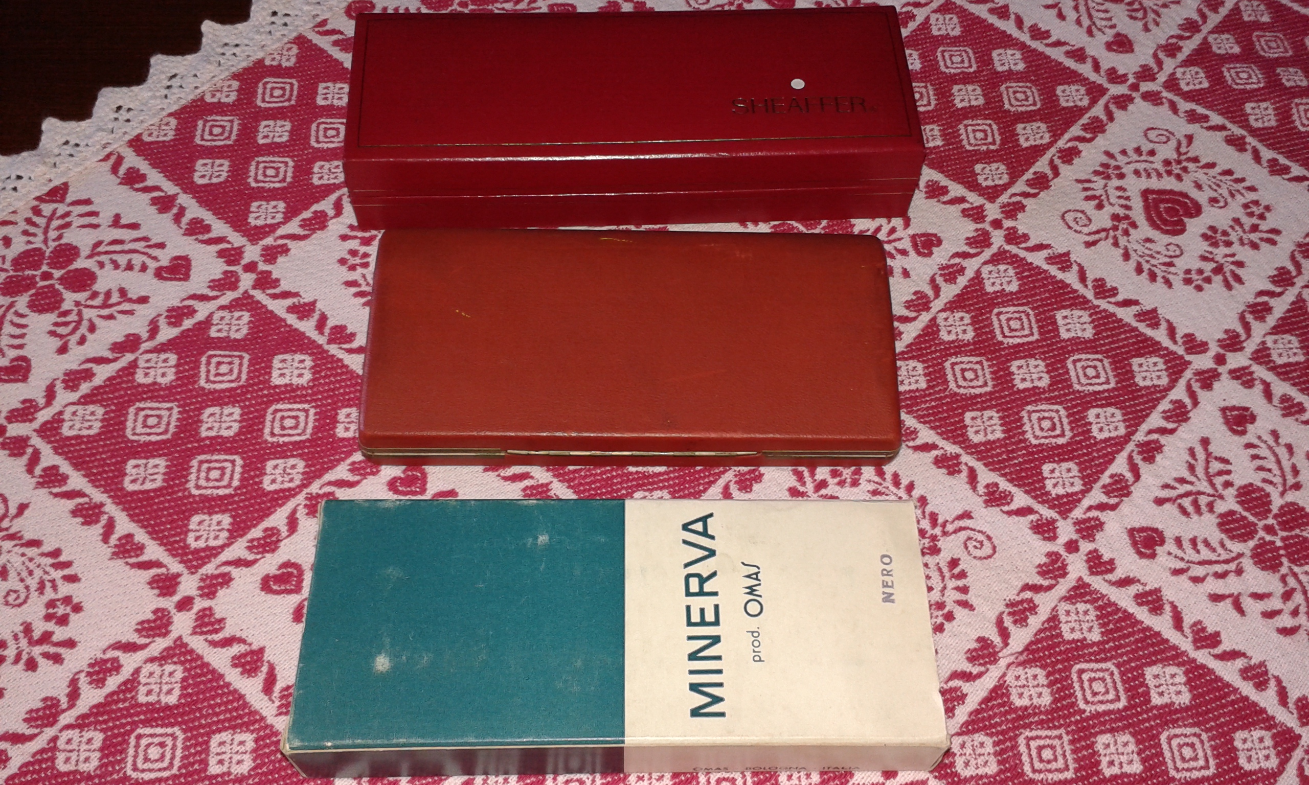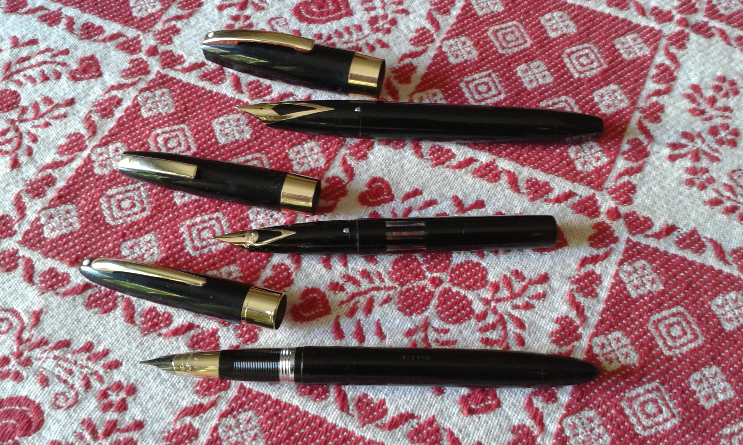- tris di Sheaffer, PFM III snorkel, Compact a cartuccia, tutte e due in ottimo stato funzionanti, Valiant snorkel anni 50, purtroppo non funzionante;