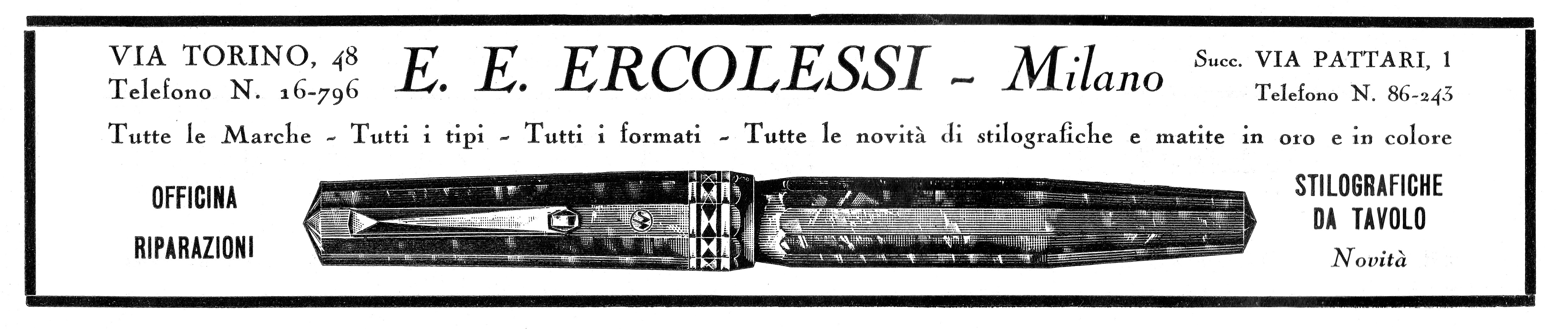 Come “bonus track file” per chi ha avuto la pazienza di giungere fin qui, una bella pubblicità del 1933 della gloriosa ditta E.E.Ercolessi, che mostra una splendida Wahl Eversharp Doric prima serie che la cartoleria poneva in vendita in uno dei suoi negozi milanesi.