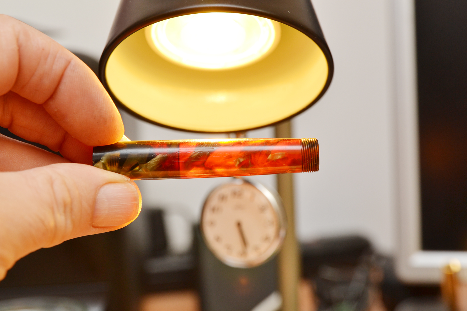 Il fondello è completamente solidale all'alberino di alluminio nel quale è avvitato (mi pare di ricordare tramite il gioiello). In posizione di riposo l'alberino è avvitato dentro lo stantuffo nero ed il fondello si trova perfettamente aderente al corpo: la parte superiore non filettata del cilindrotto d'allumino spunta dal corpo ed entra nel fondello che la va quindi a coprire. Svitando il fondello in realtà si svita l'alberino d'alluminio dall'interno dello stantuffo nero: il fondello si stacca dal corpo e consente di essere spinto in basso per effettuare l'azione di carica. Al termine del riempimento si avvita nuovamente il fondello. Il sistema è decisamente ben realizzato: seppur meno efficiente del Vacumatic, che sposta più aria facendo passare il diaframma di gomma dalla posizione concava a quella convessa, ha il vantaggio di essere decisamente robusto e di consentire la carica senza dovere rimuovere il fondello.