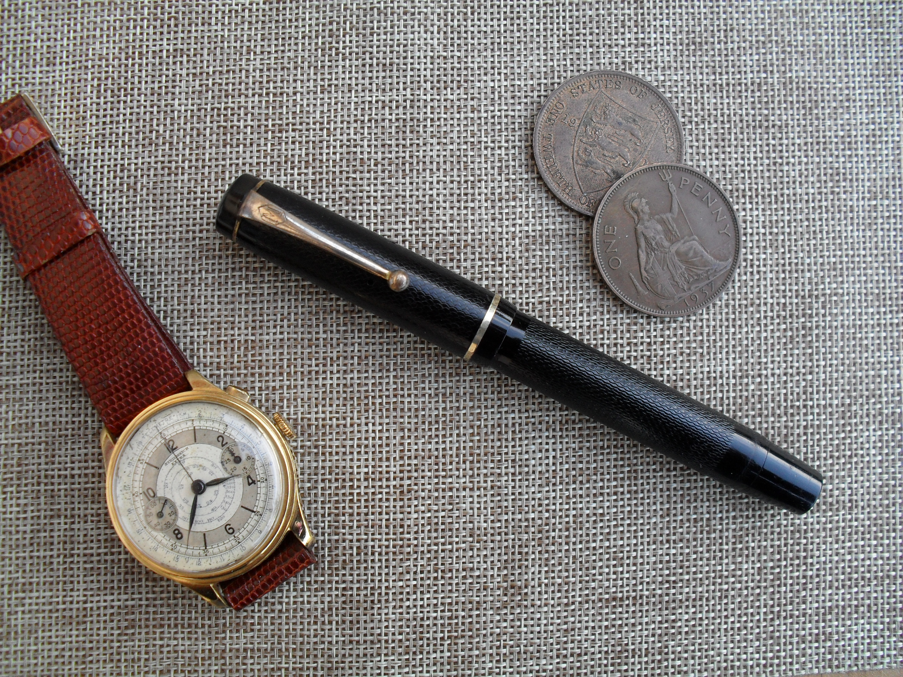 Proseguendo il mio viaggio nella produzione britannica di stilografiche degli anni ’30, ho acquistato la Mentmore Autoflow che vedete. Come sempre, ho privilegiato un modello in nero ed oro, che mi pare la combinazione più elegante e che, senza dubbio, ben corrispondeva al miglior stile dell’epoca.