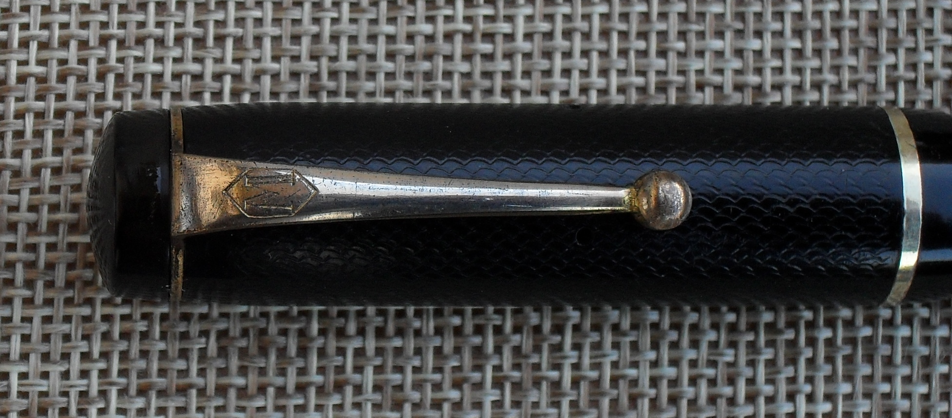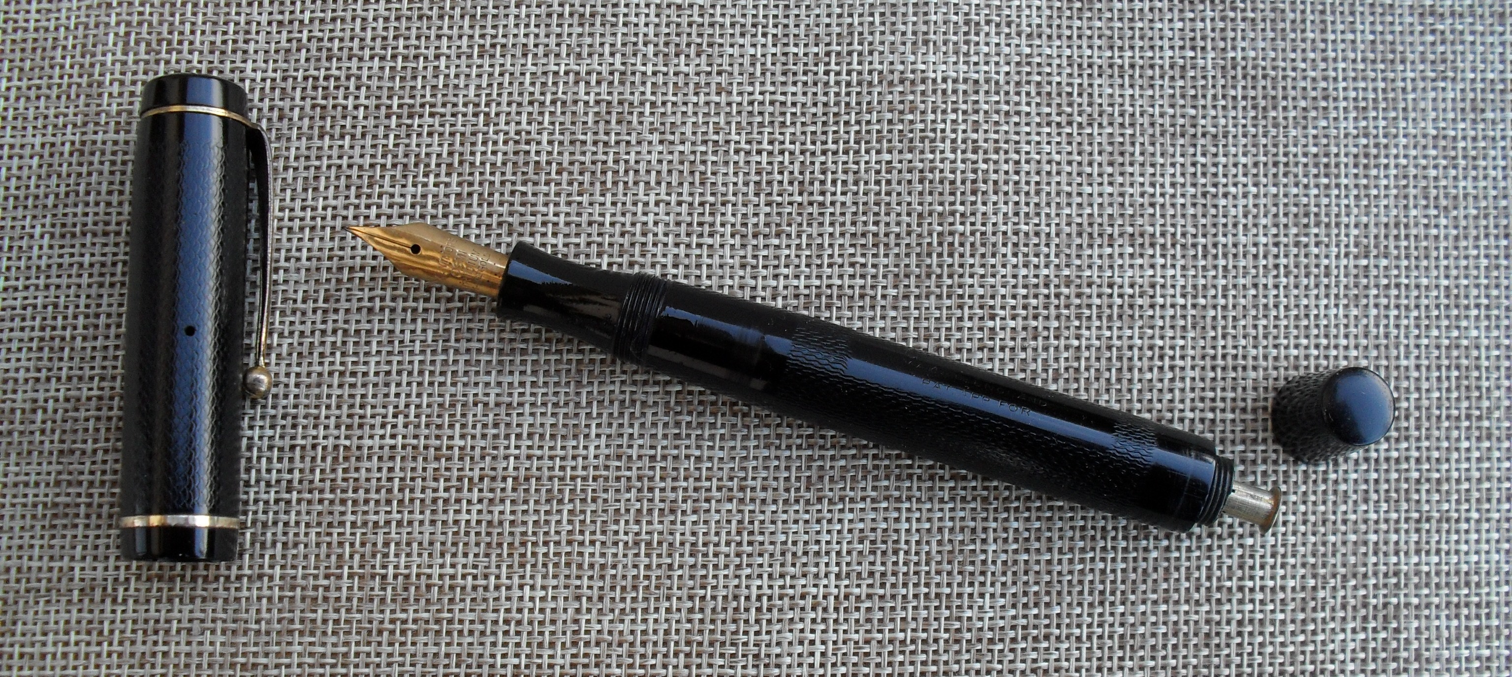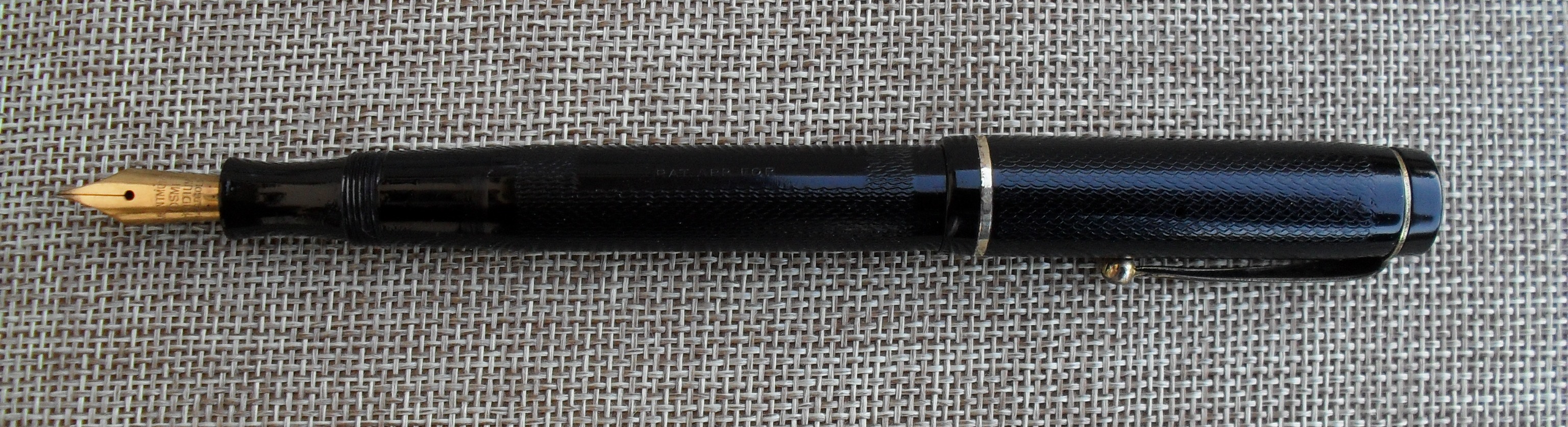 Questa marca non è molto conosciuta ai nostri giorni, né molto apprezzata da tanti collezionisti, ma conobbe un buon successo, grazie anche alla qualità dei propri prodotti. In effetti, anche solo soppesandola ed osservandola, questa penna comunica subito una piacevole sensazione di solidità e di rifinitura accurata. Il corpo, fondello incluso, è di celluloide, mentre l’alimentatore ed il tassello di chiusura del cappuccio (che si serra in due giri ed un quarto) sono d’ebanite. La prova di scrittura non tradisce le prime impressioni e si rivela piacevolissima, grazie alla morbidezza ed alla scorrevolezza del pennino d’oro a 14 carati: Il bilanciamento è perfetto anche con il cappuccio calzato, l’impugnatura confortevole, grazie alla sapiente svasatura della sezione, il flusso ottimo, non abbondante ma neppure magro (per le stilografiche d’epoca, usualmente più generose, prediligo l’inchiostro Pelikan 4001 “Brilliant black”, poco tensioattivo). Nessun difetto apparente: né false partenze né salti nella scrittura, né variazioni di flusso. Ecco le caratteristiche morfologiche principali della penna: