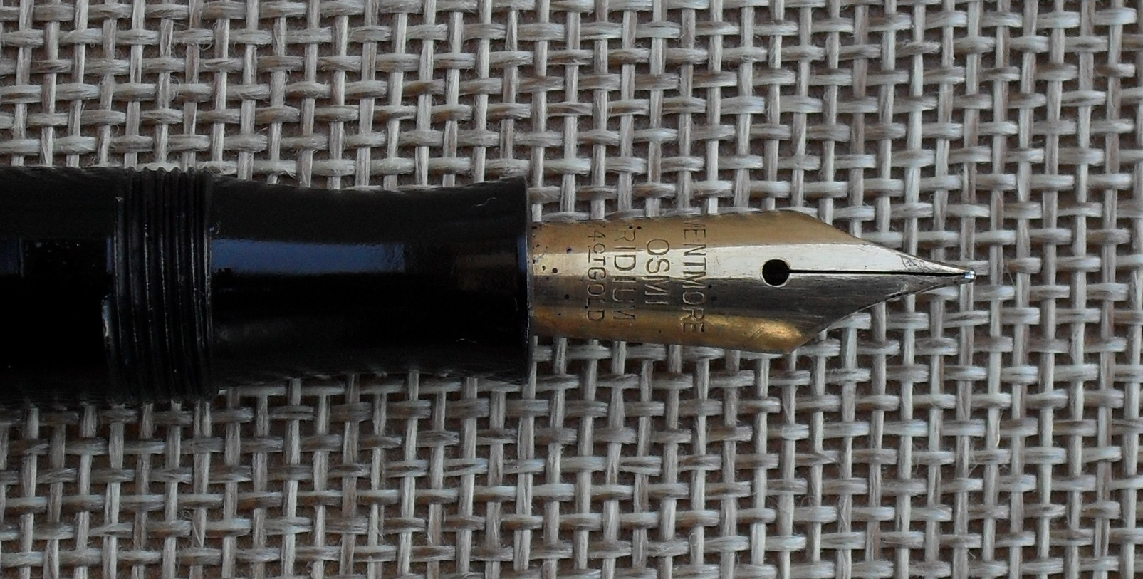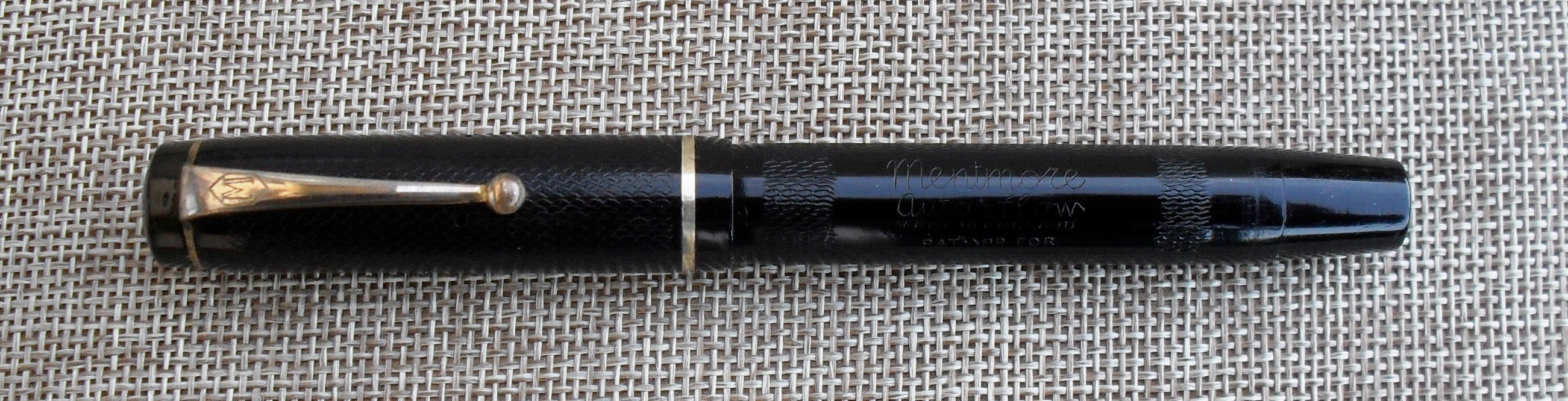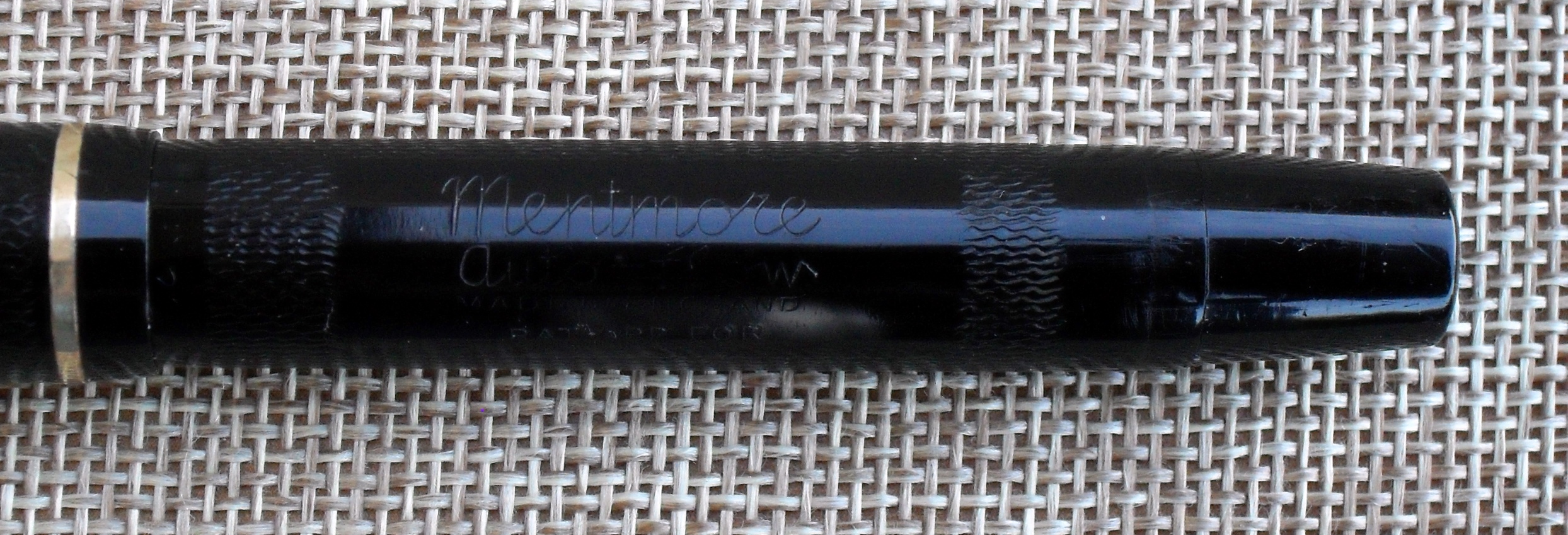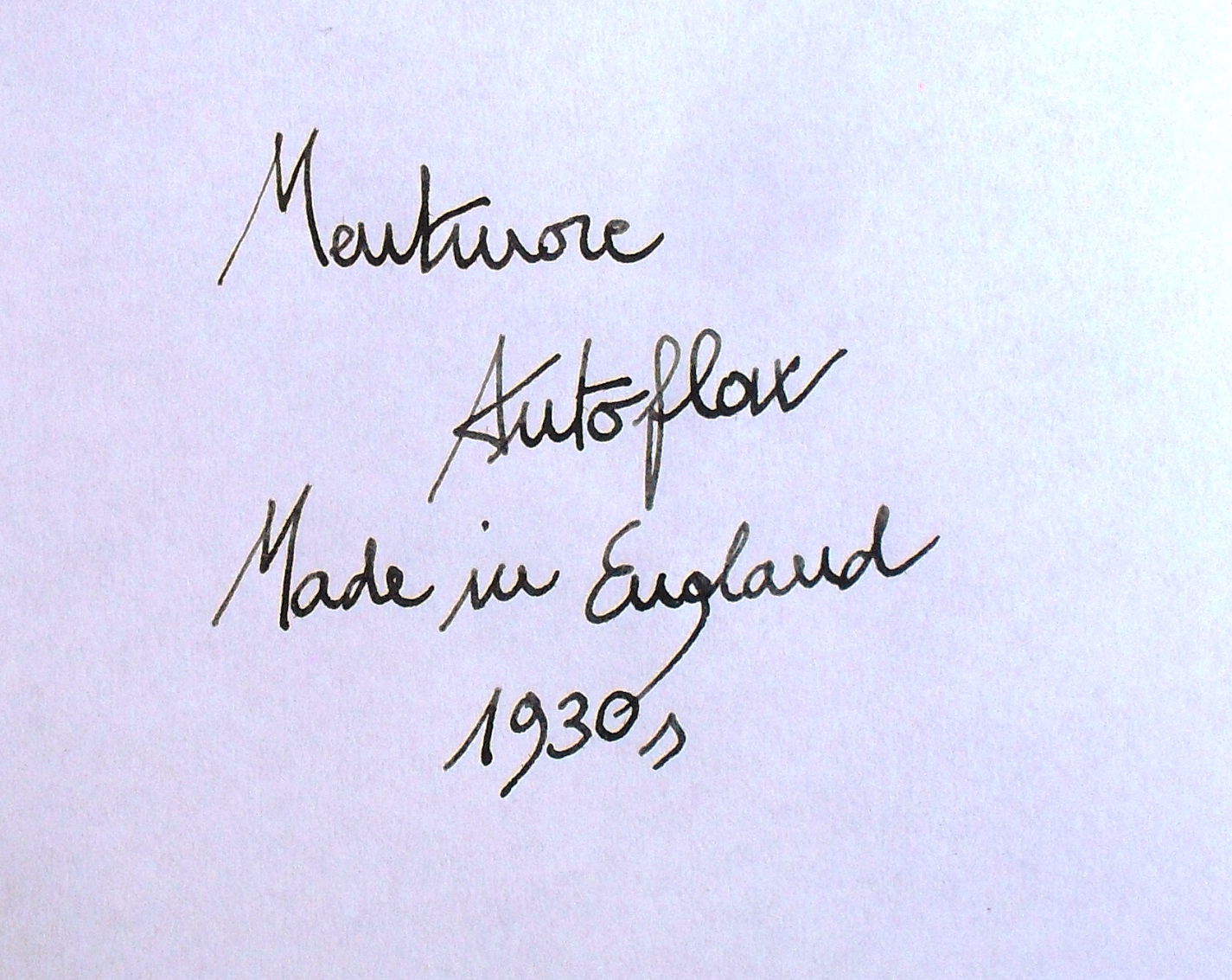 Il fusto reca la scritta “Mentmore Autoflow – Made in England – Pat app for”, tra l’altro indicativa del fatto che relativamente a questo modello venne inoltrata richiesta di brevetto. In buona sostanza, si tratta di una penna che conferma la qualità, seppur variabile da marchio a marchio e secondo i costi, della produzione d’oltremanica della prima parte del XX secolo, oltre a quell’insieme di caratteristiche che, per una qualche ragione, sembrano costituirne un denominatore comune: scrittura piacevolissima, affidabilità e qualità dei materiali. Tutte caratteristiche molto importanti, tenendo conto del fatto che a quei tempi la stilografica era di fatto l’unico strumento pratico di scrittura.