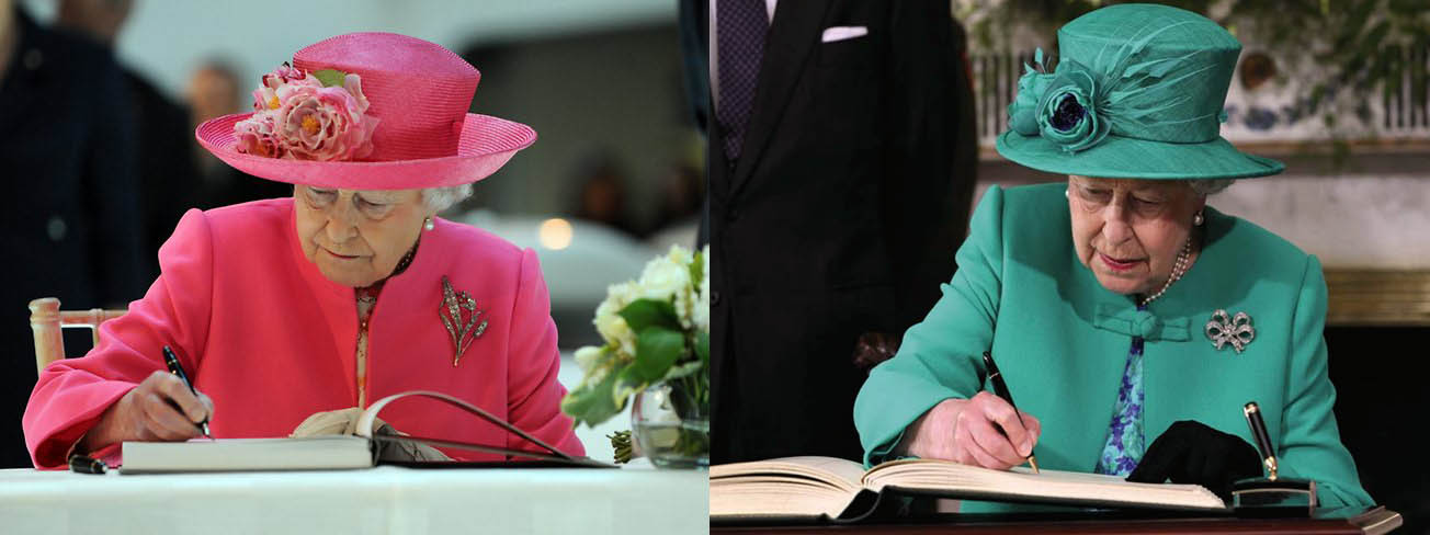 Infine: allego un paio di fotografie nelle quali, indubitabilmente, la regina Elisabetta II d’Inghilterra utilizza strumenti di scrittura Montblanc (mi parrebbe una Meisterstück 149 nella foto di sinistra e un roller Meisterstück, con relativo stiloforo, nella foto di destra). Eppure, siffatta evidenza non dice nulla delle reali (letteralmente e figurativamente) preferenze personali della Regina, giacché é evidente che le penne in questione sono quelle che incontró, predisposte dagli organizzatori degli eventi, ai tavoli sui quali fu invitata a firmare qualche atto protocollare.