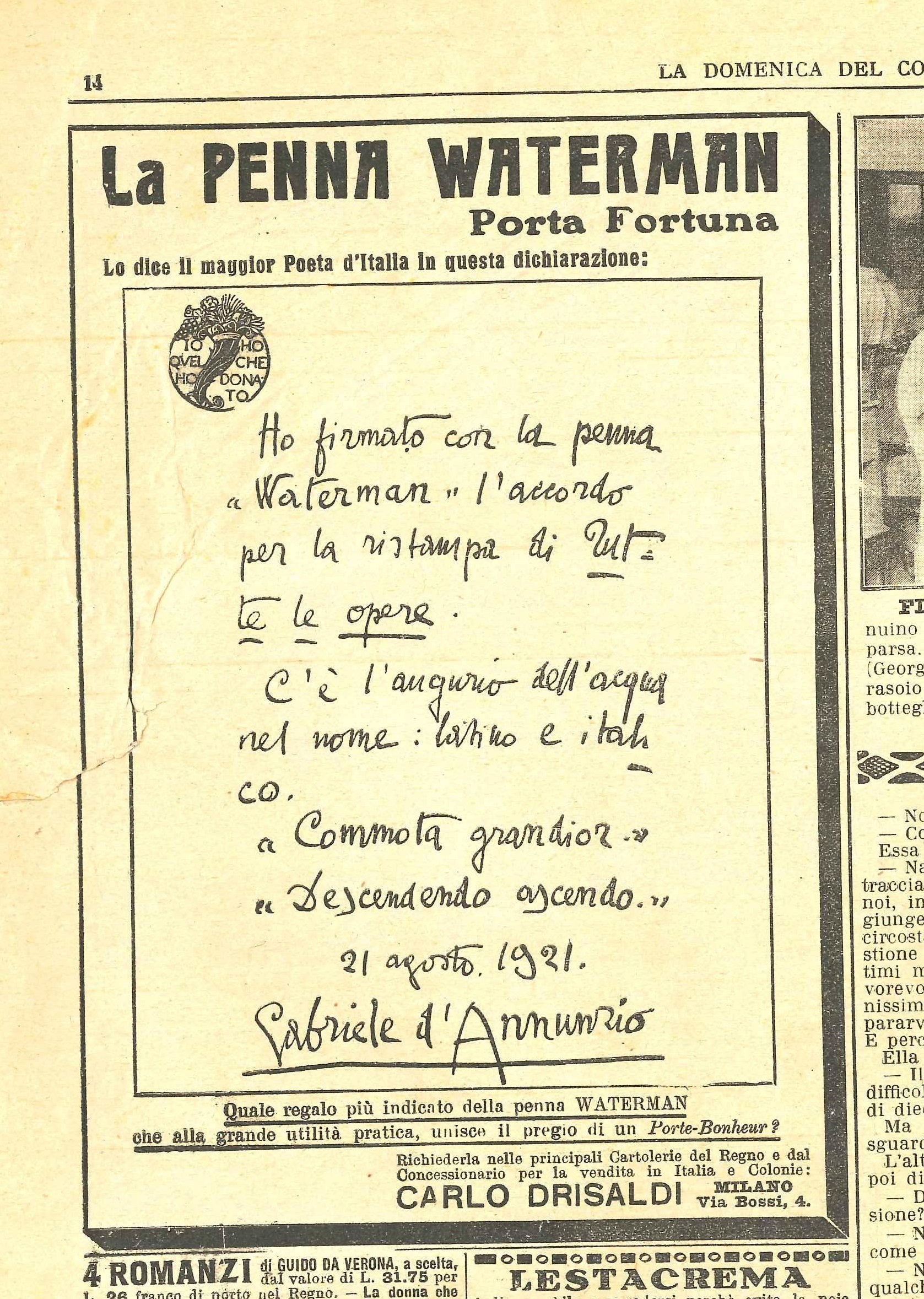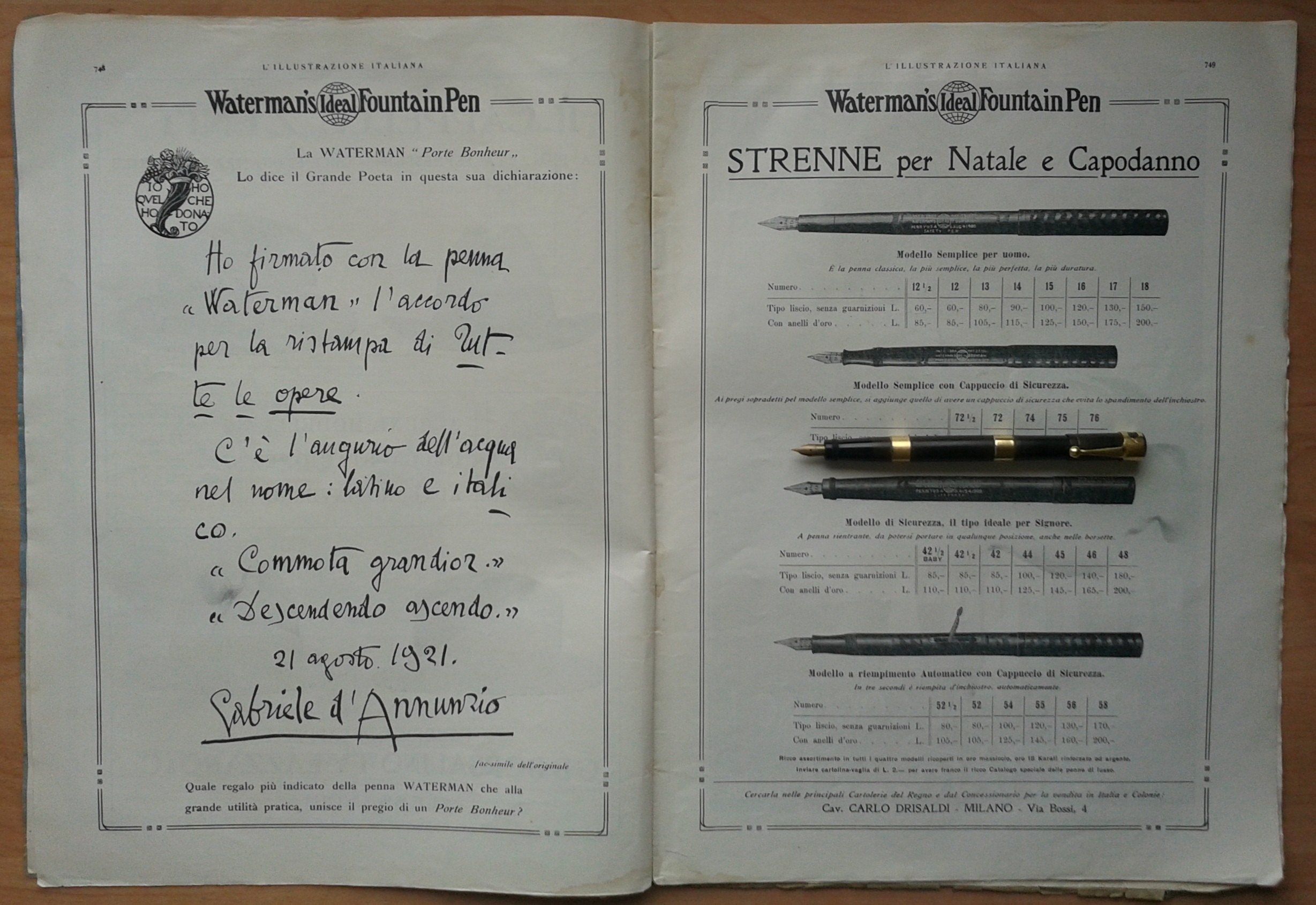 Al liceo, come ricorderai, alcuni professori, forse un poco semplicisticamente, mettevano Pascoli e D'Annunzio l'uno contro l'altro. Orbene, su una cosa essi erano tuttavia assolutamente d'accordo: la bontà delle stilografiche Waterman!!