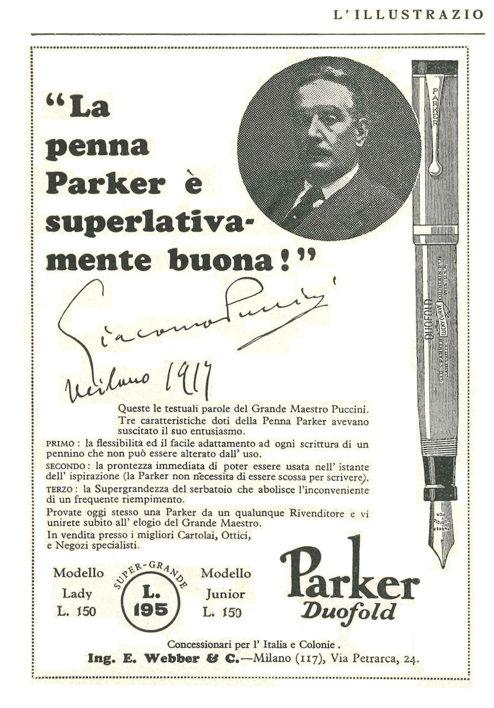 Parker aveva infatti “arruolato” nel 1920 due tra i più importanti Musicisti della scena operistica mondiale: Umberto Giordano e Giacomo Puccini. Ecco, con quest’ultimo la Pubblicità continuò anche fino a 10 anni dopo la morte, ma non ci vedo nulla di imperdonabile (come nel caso di MB con Mozart o Chopin, per esempio).