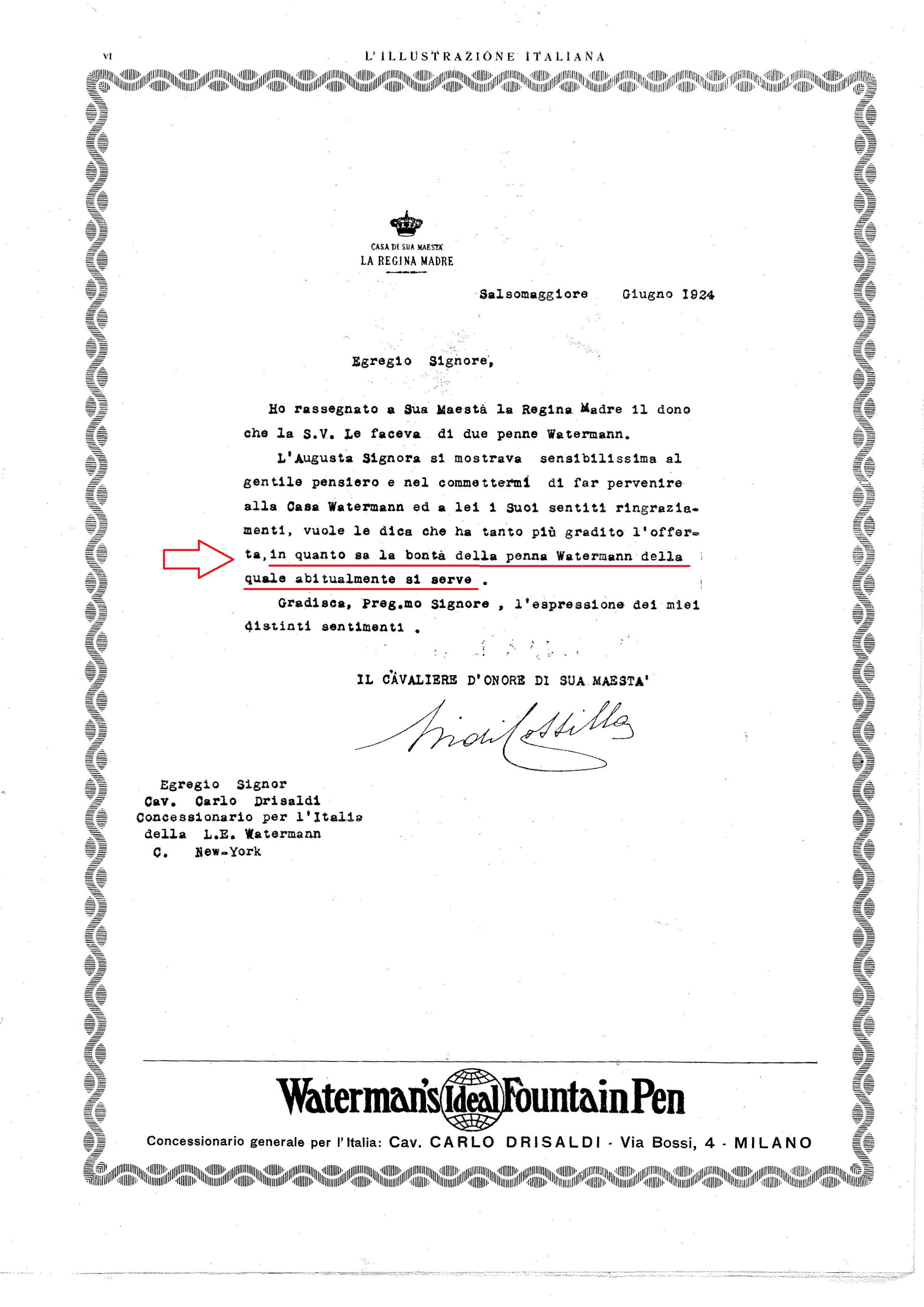 Per la Casa Reale d’Italia a metà degli anni Venti del Novecento abbiamo invece informazioni un poco più dettagliate (pubblicate su rivista). La Regina Madre preferiva Waterman!fufluns ha scritto:...Infine: allego un paio di fotografie nelle quali, indubitabilmente, la regina Elisabetta II d’Inghilterra utilizza strumenti di scrittura Montblanc (mi parrebbe una Meisterstück 149 nella foto di sinistra e un roller Meisterstück, con relativo stiloforo, nella foto di destra). Eppure, siffatta evidenza non dice nulla delle reali (letteralmente e figurativamente) preferenze personali della Regina, giacché é evidente che le penne in questione sono quelle che incontró, predisposte dagli organizzatori degli eventi, ai tavoli sui quali fu invitata a firmare qualche atto protocollare....