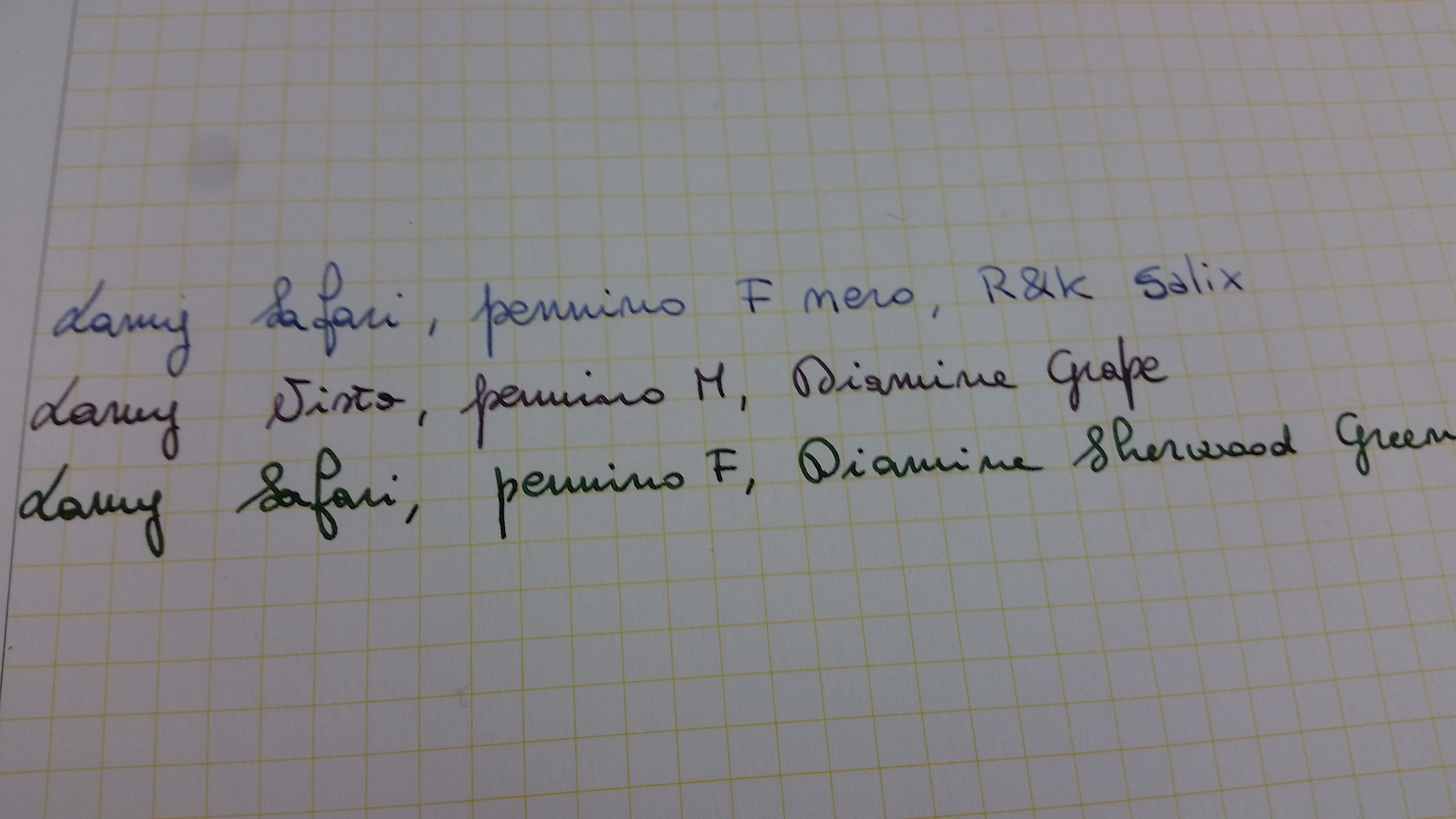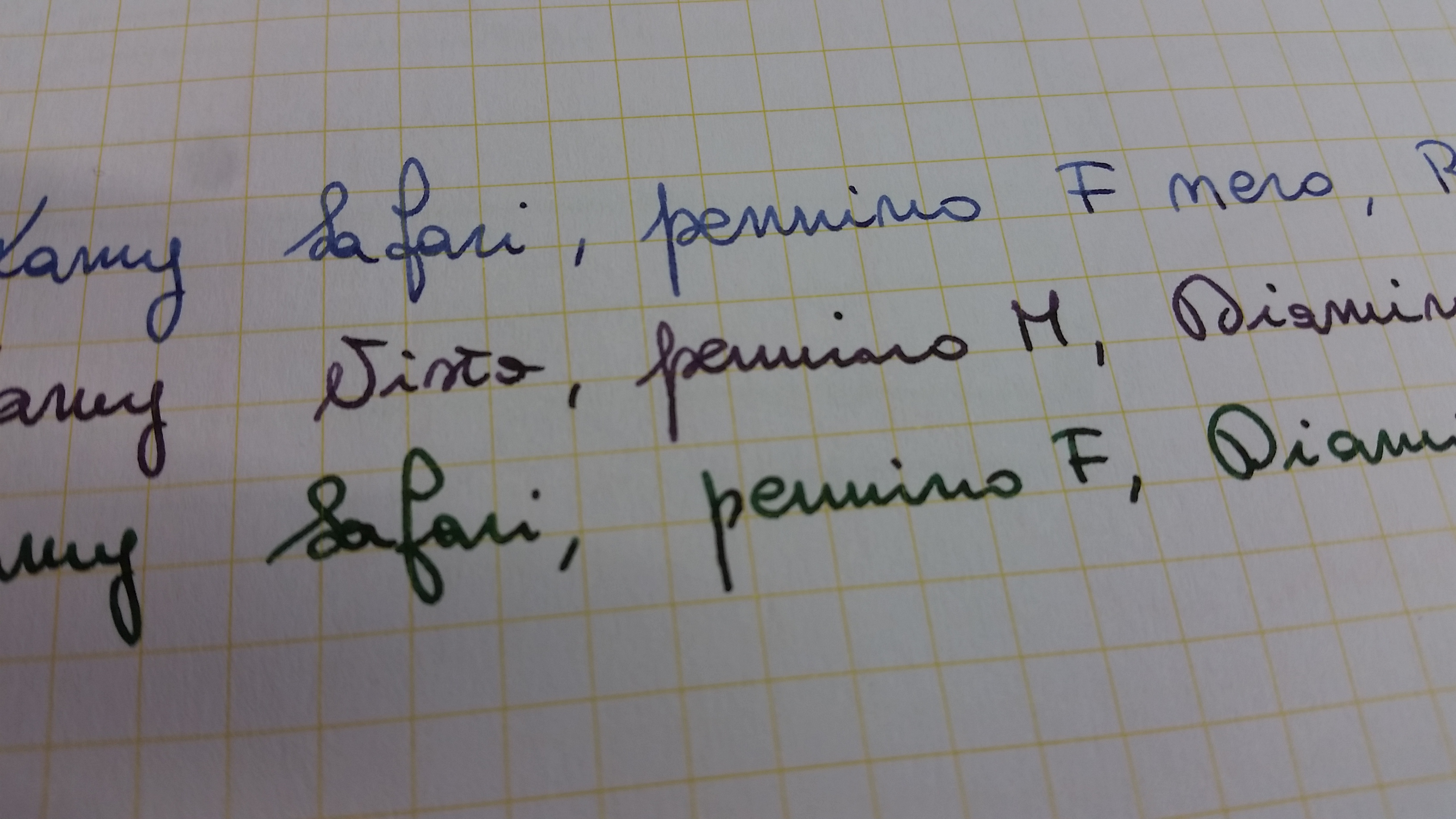 Ho anche ricevuto - e qui viene il bello - un'altra Safari con pennino F, che ho inchiostrato con Diamine Sherwood Green tramite converter Z24 (quello col fondo rosso): questa ha un tratto più spesso anche di quello della Vista che ha un pennino più grosso…